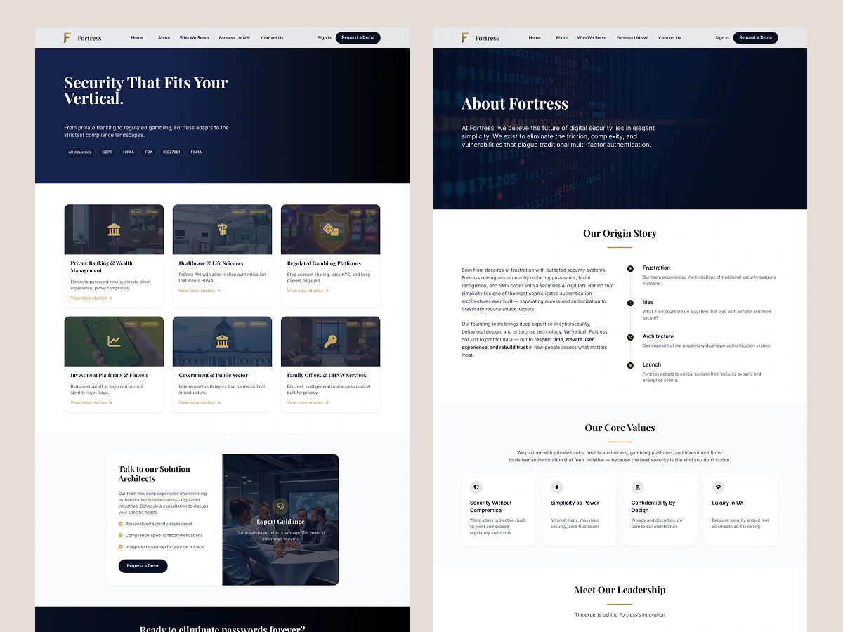 The pages highlight benefits like ultra‑simple UX, independent auth layers, breach protection and fast integration. I organized verticals into cards with quick descriptors. Each card links to detailed case studies, encouraging exploration. I showcased the core values and introduced the leadership team with concise bios.