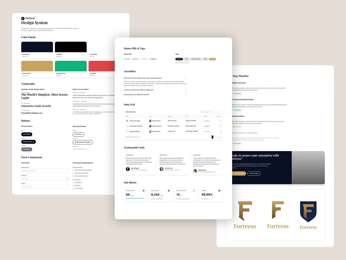 I built a design system using deep navy, jet black, pearl white and an accent gold. Playfair Display was chosen for headlines and Inter for body copy to balance sophistication and readability. I defined reusable components (buttons, input fields, status pills and data grids) from the product’s style guide and adapted them for marketing use.
