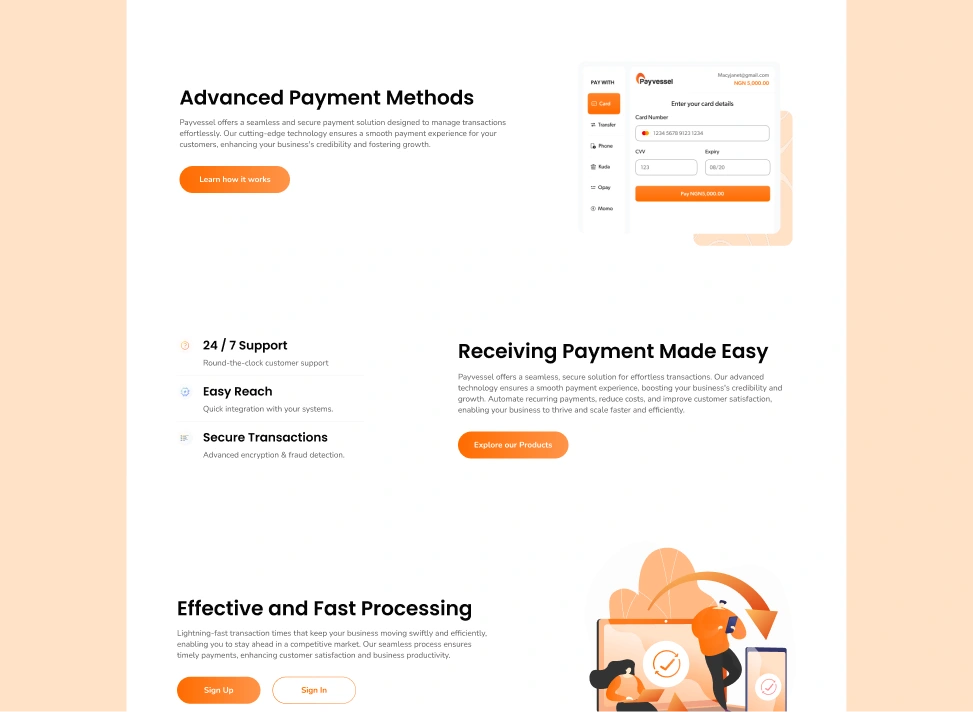 I designed the Payvessel website to provide a seamless, secure, and user-friendly experience for businesses and their customers. The website needed to clearly communicate Payvessel’s value proposition as a cutting-edge payment solution while showcasing its credibility, functionality, and ease of use.
