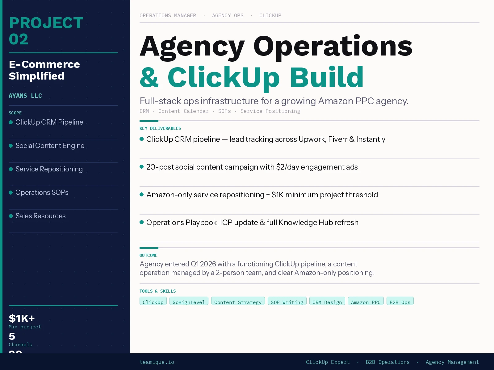 ClickUp CRM, content engine & Operations Playbook for an Amazon PPC agency. Service repositioning + $1K minimum threshold set.