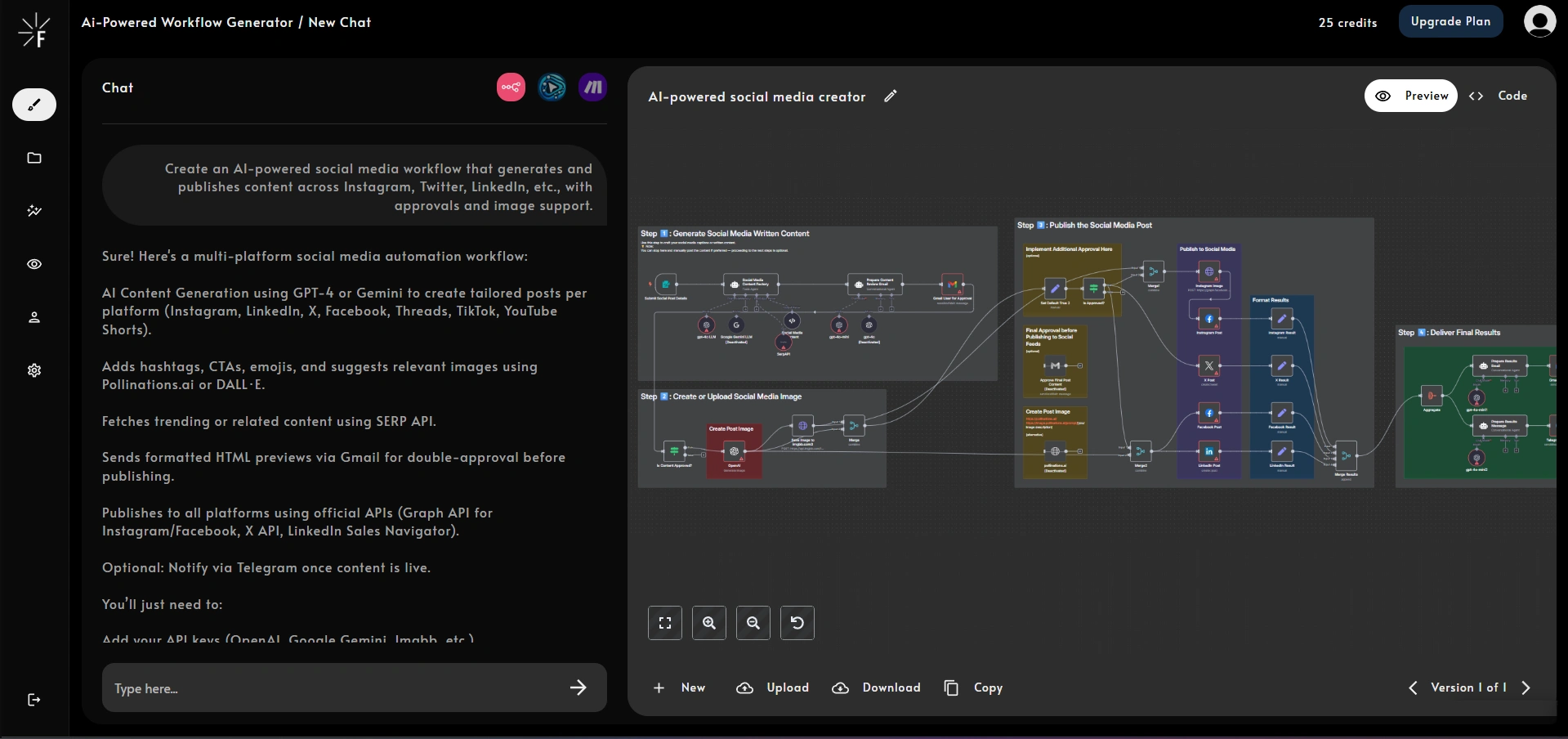 Creating automation workflows across multiple platforms is time-consuming and prone to errors. Agencies and developers often struggle with rebuilding flows from scratch, handling platform differences, and catching subtle issues when workflows break. The challenge was to build a system that not only generates workflows accurately, but also adapts them cross-platform and maintains them automatically.
