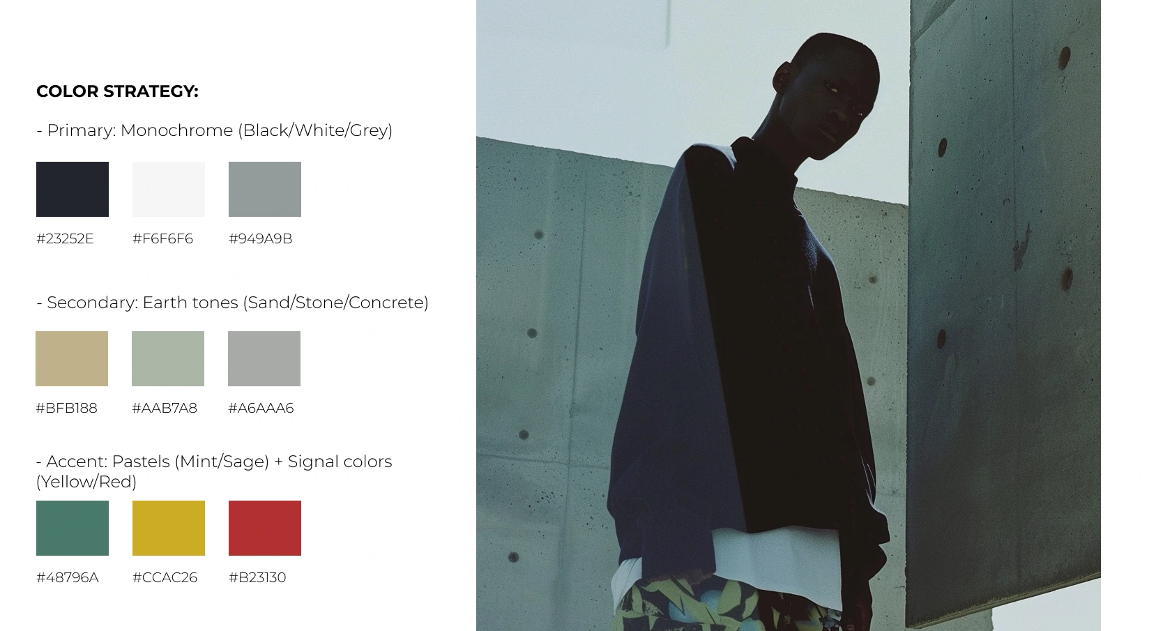 MATERIALS: Wool gabardine, technical twill, bonded cotton COLOR PALETTE: Sand, Stone, Concrete Grey, Taupe, Warm Beige INSPIRATION: Brutalist architecture, deconstructivism, Japanese tailoring, ind