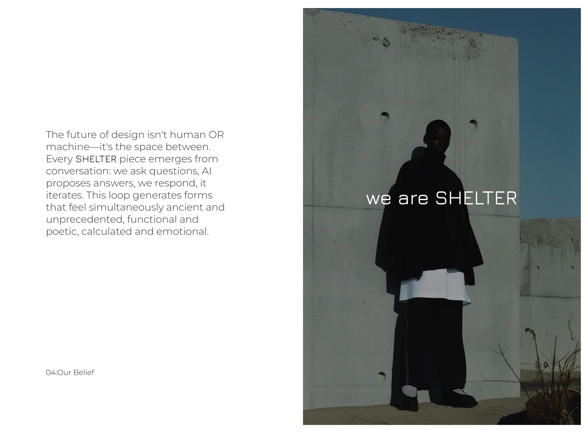 SHELTER is a prototype—an experiment in what fashion becomes when we surrender control without abandoning direction. When we invite the machine to co-create while maintaining human values. When we design for a world where artificial and natural intelligence are partners, not rivals.