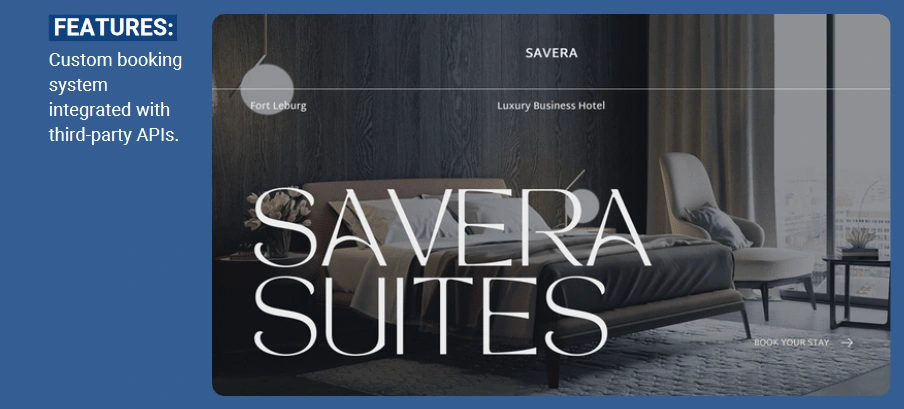 Key features include an intuitive booking system, high-quality imagery of the suites, and optimized content to enhance search engine visibility.