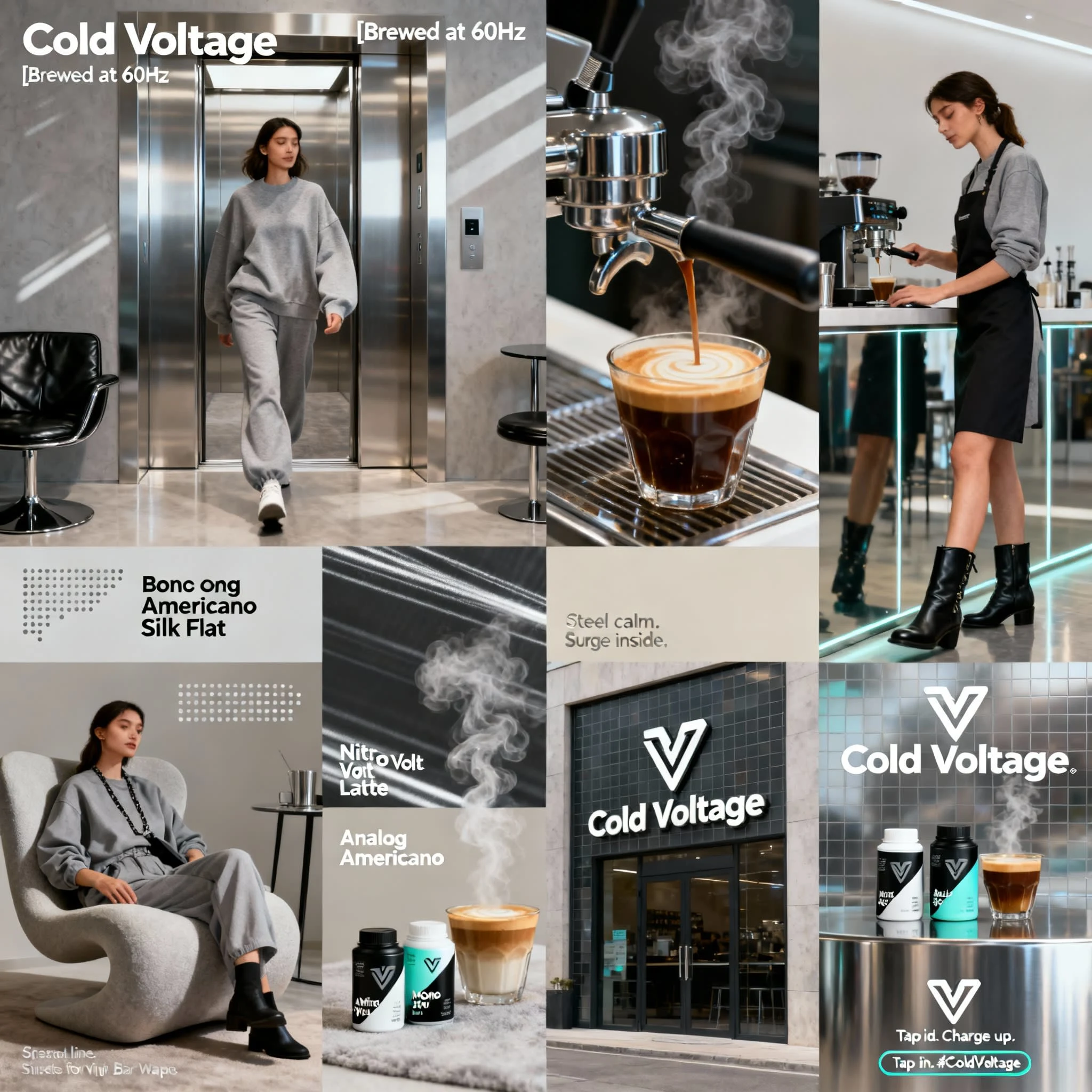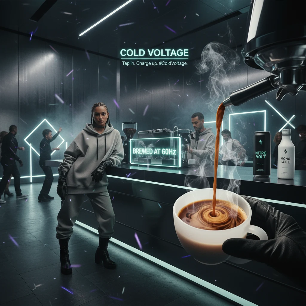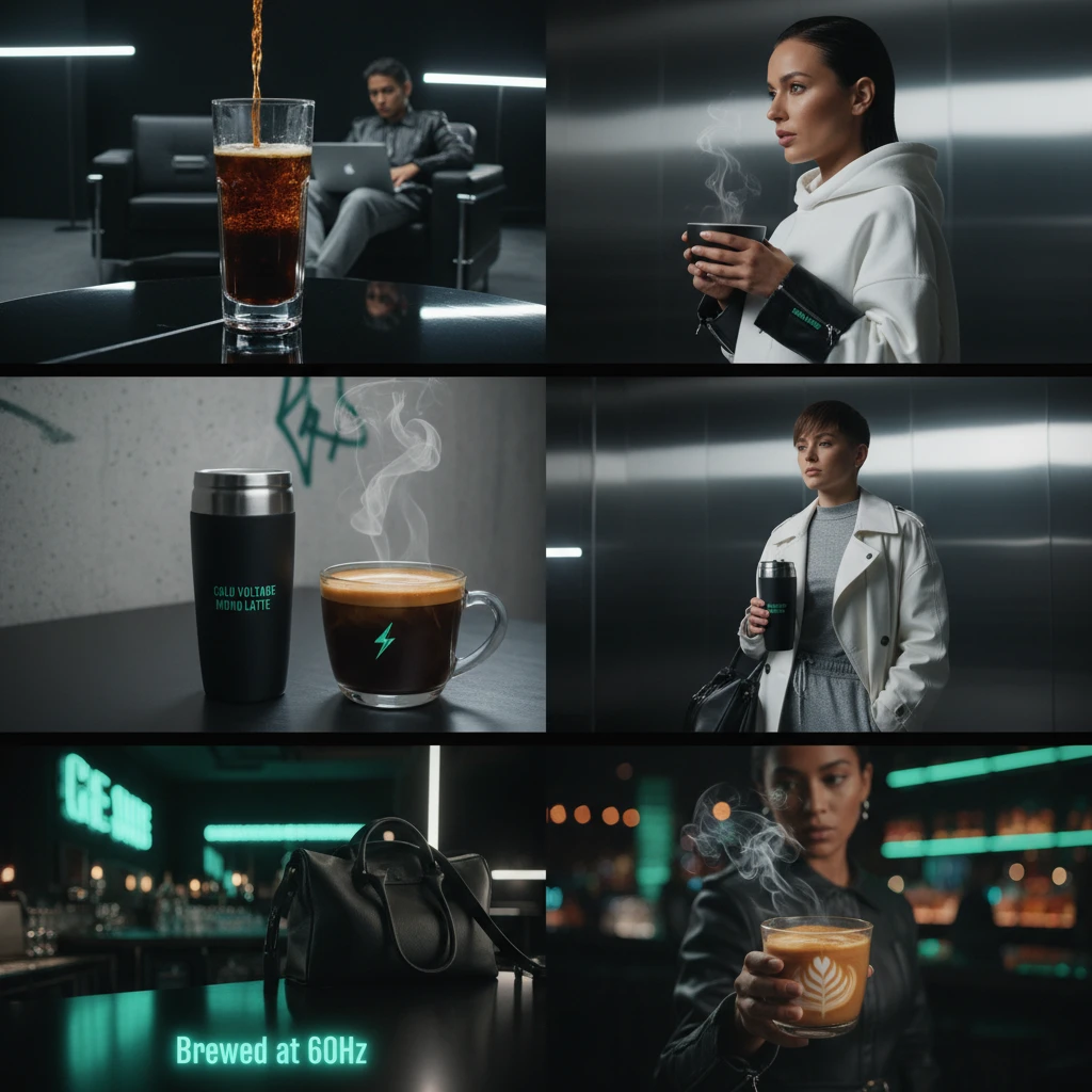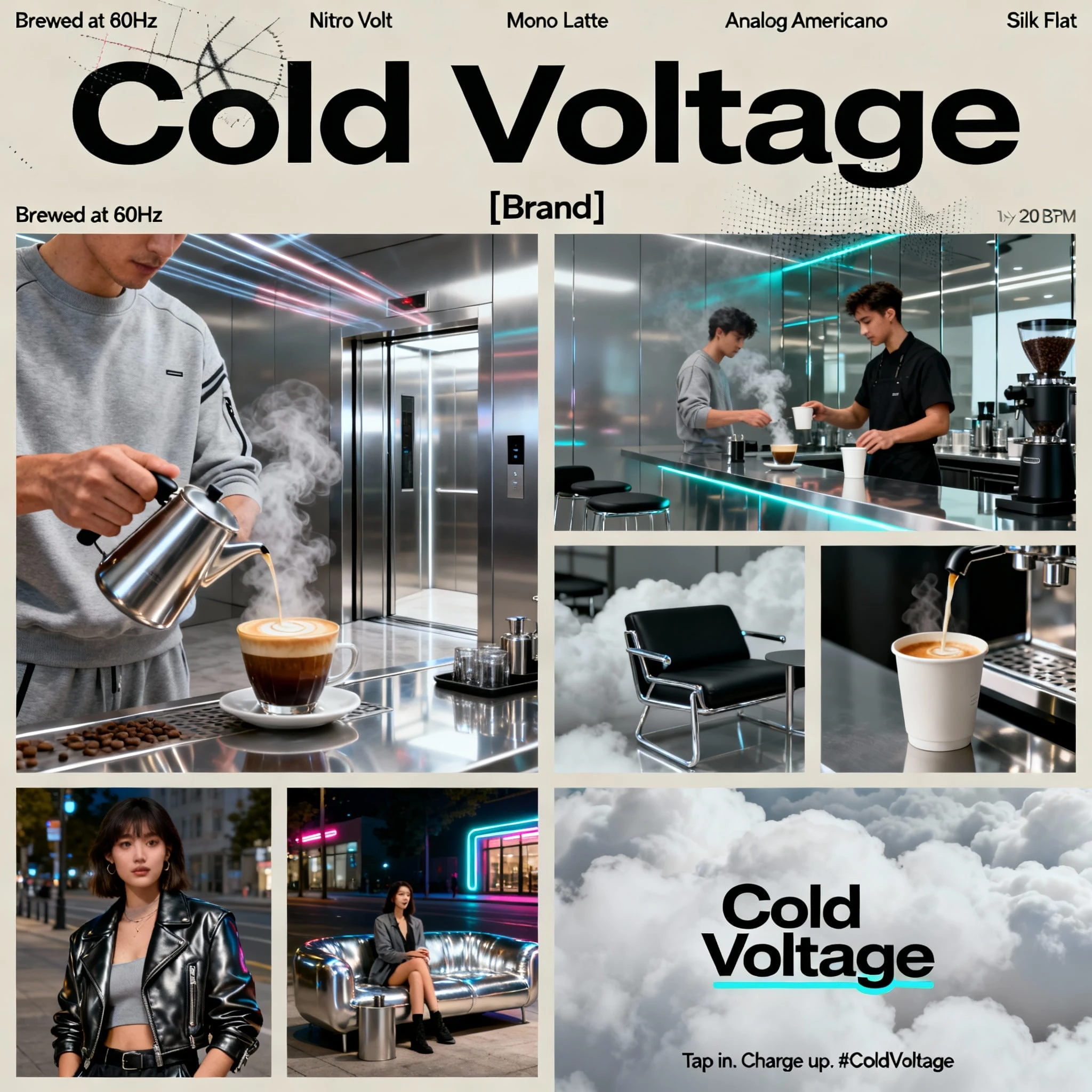 Cold Voltage is a speculative high-impact coffee brand built through AI ideation and visual generation. The goal was to craft a premium, techno-luxe universe for a new coffee line aimed at creators who move between studio, street, and nightlife. Using Flora AI, the campaign was developed end-to-end: naming, visual identity, film boards, product world, and social ecosystem.