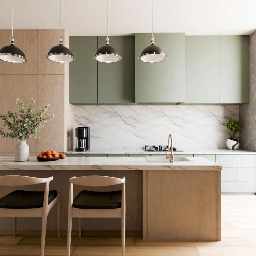 Bright kitchen featuring warm wood cabinets and elegant marble countertops for a stylish, airy, and functional cooking space.