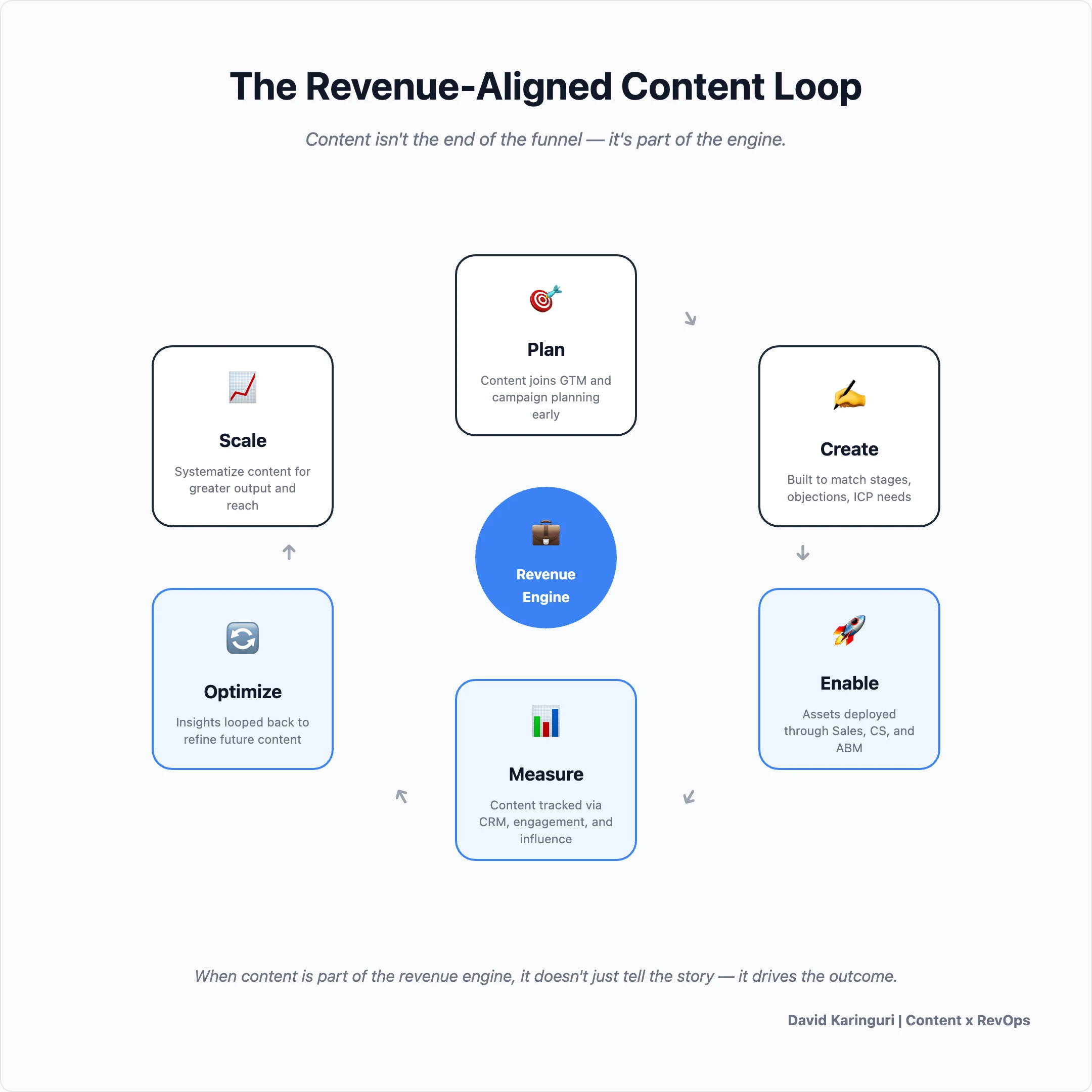 RevOps x Content Alignment 1. Map content to the buyer journey. 2. Partner with RevOps to track content influence. 3. Build a feedback loop with Sales.