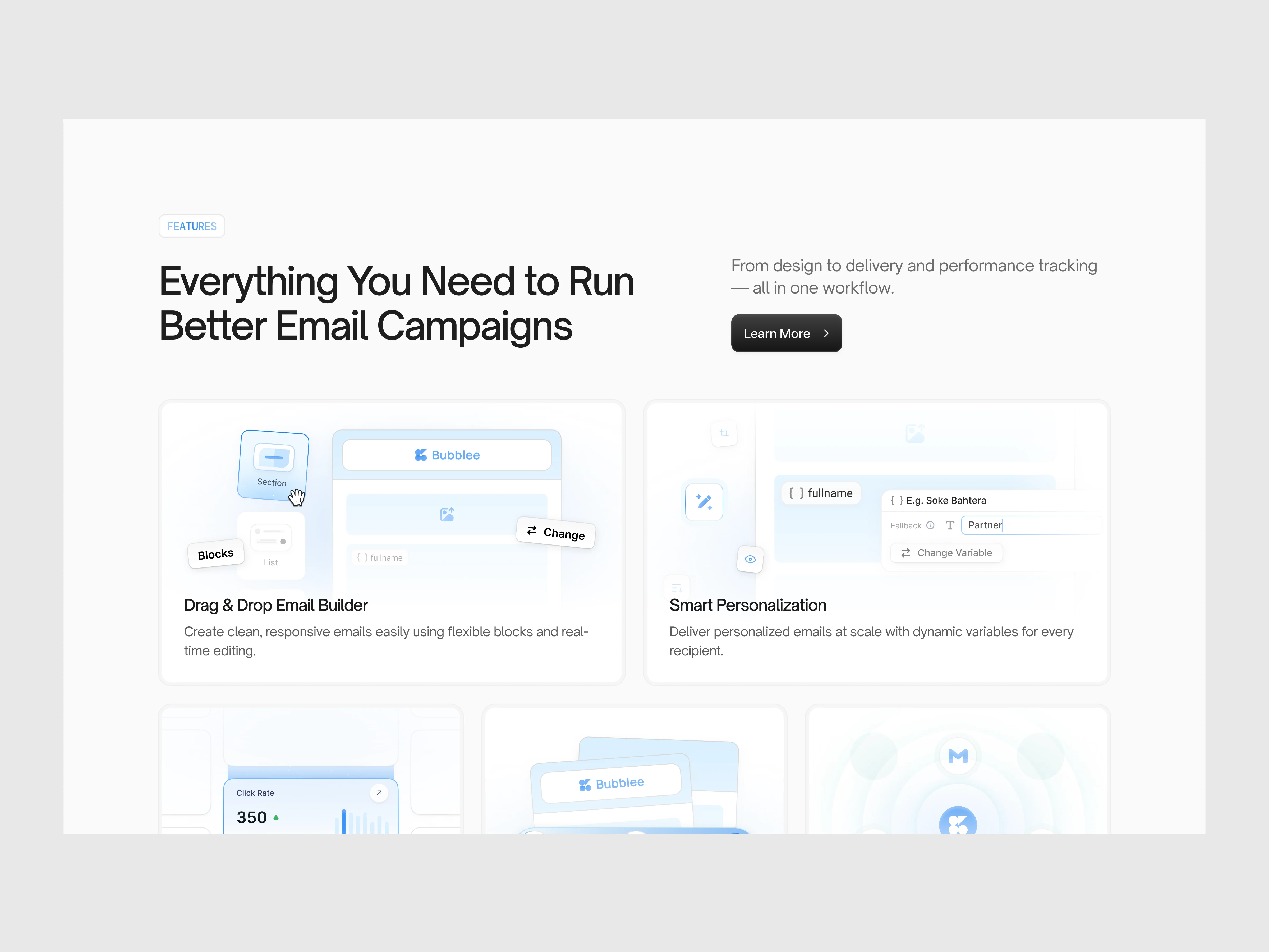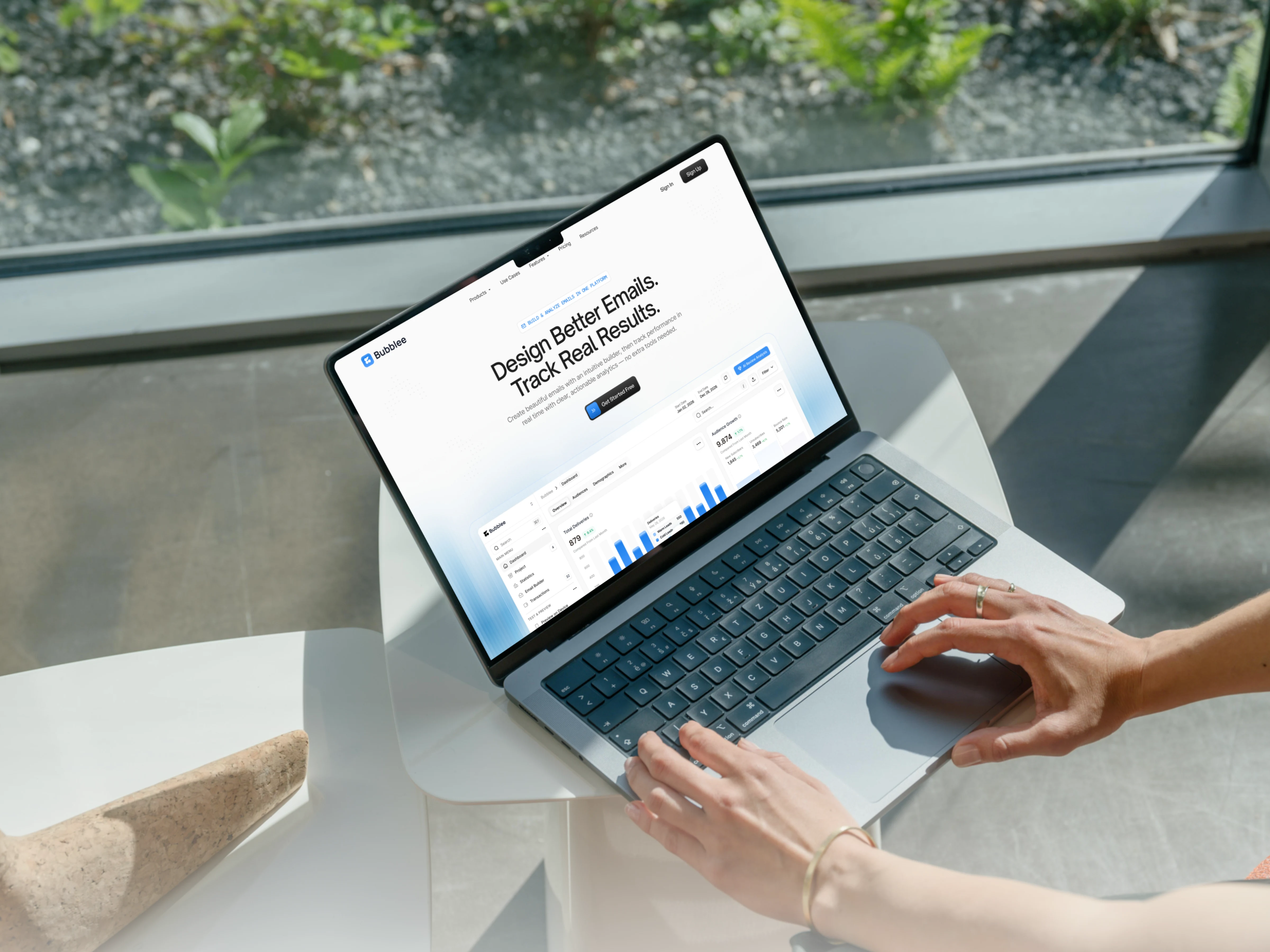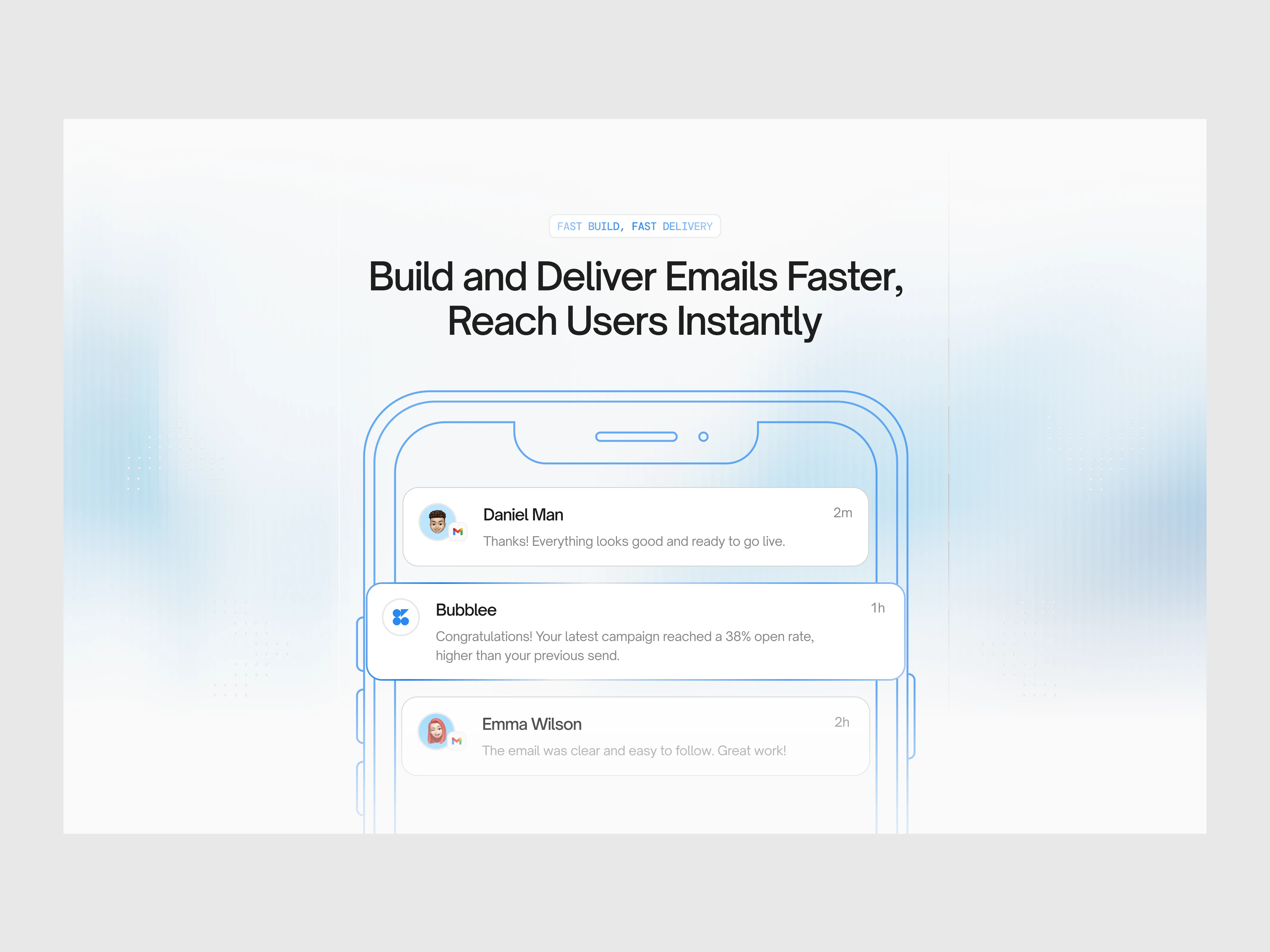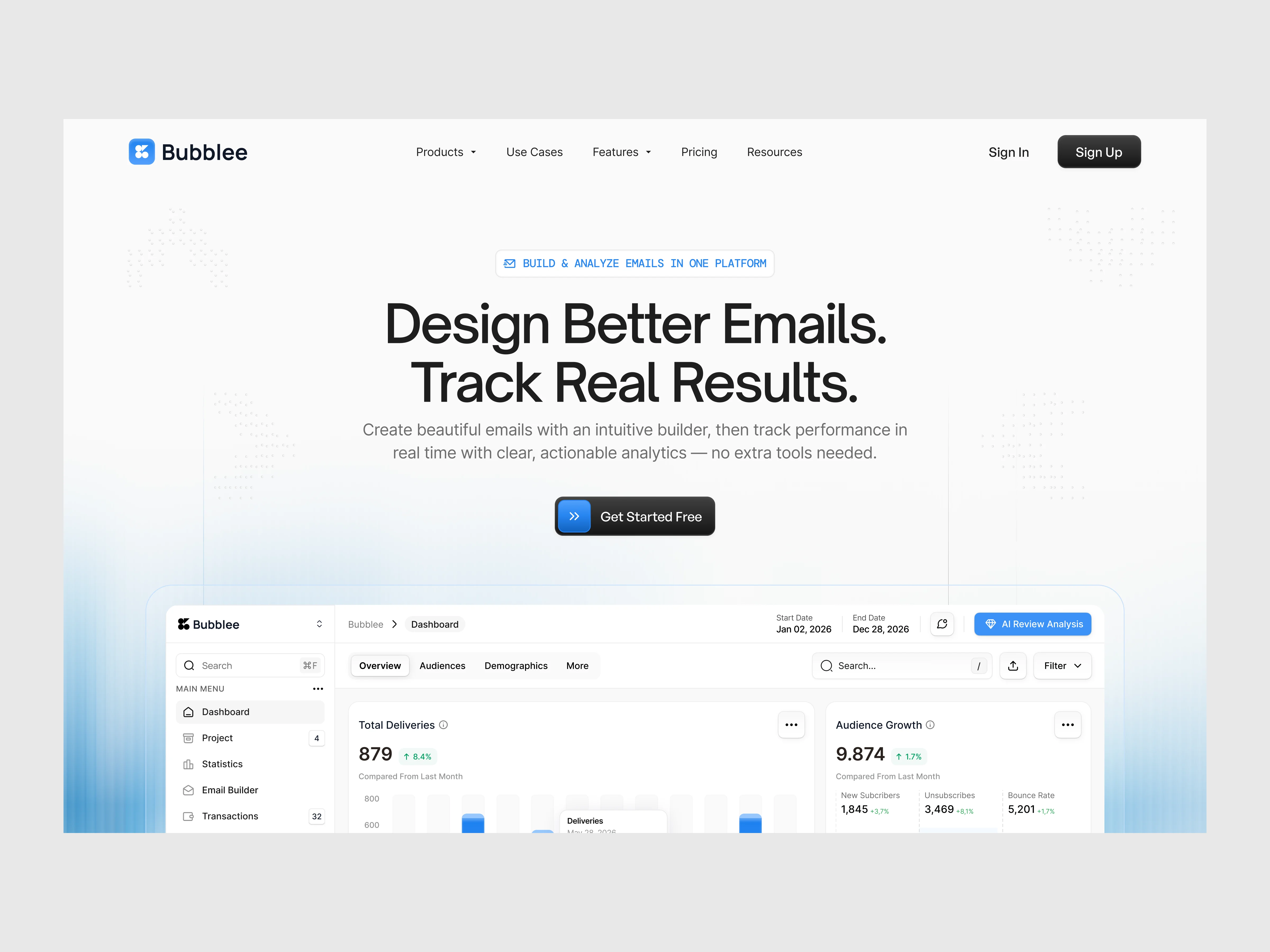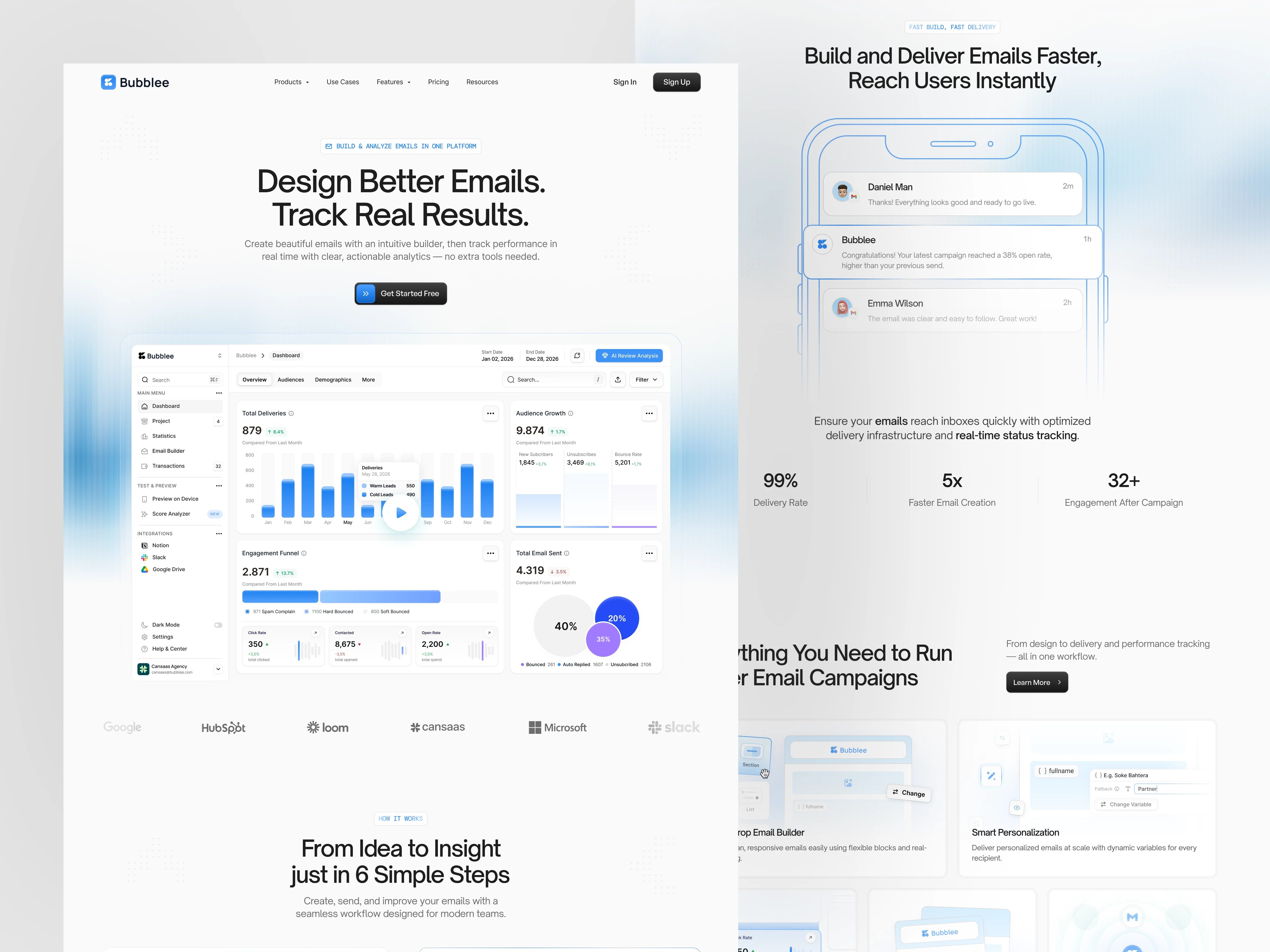 The UI design leverages a modern SaaS aesthetic: neutral backgrounds, subtle shadows, clear typography scale, and consistent spacing systems. The dashboard interface emphasizes data visualization with accessible charts, performance metrics, and engagement indicators. This approach ensures users can quickly interpret delivery rates, campaign growth, and performance analytics without cognitive overload.