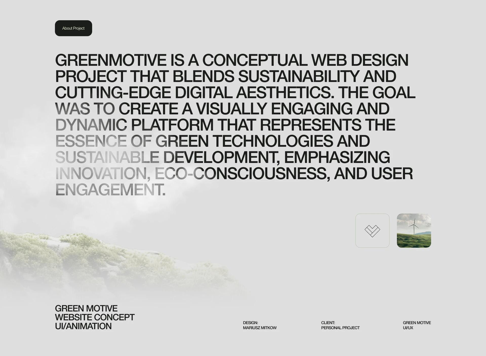 GreenMotive is a conceptual web design project that embodies the essence of sustainability, green technology, and innovation. Designed as a platform for organizations focused on sustainable development, the project is a vision of how modern digital aesthetics and user-focused functionality can amplify eco-conscious values in a highly competitive digital landscape.