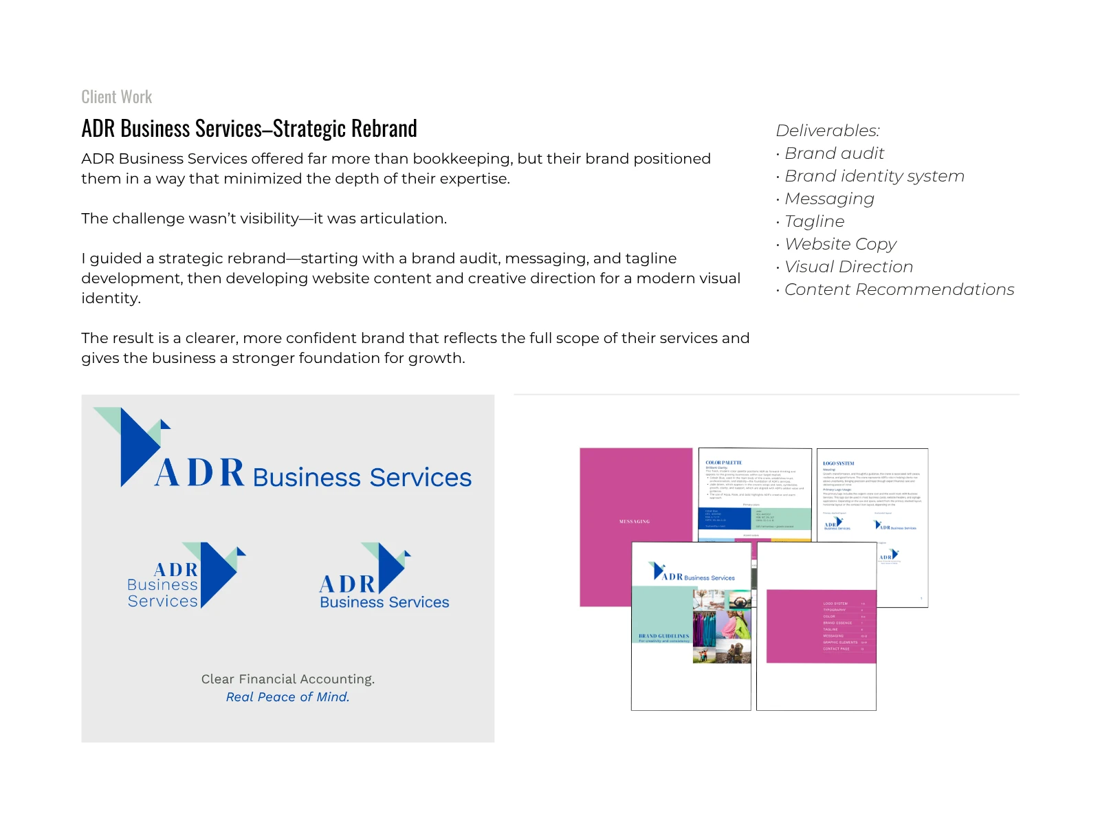 Brand audit, brand strategy, visual identity, messaging, tagline, and website content for a bookkeeping firm ready to stand out in a crowded field.