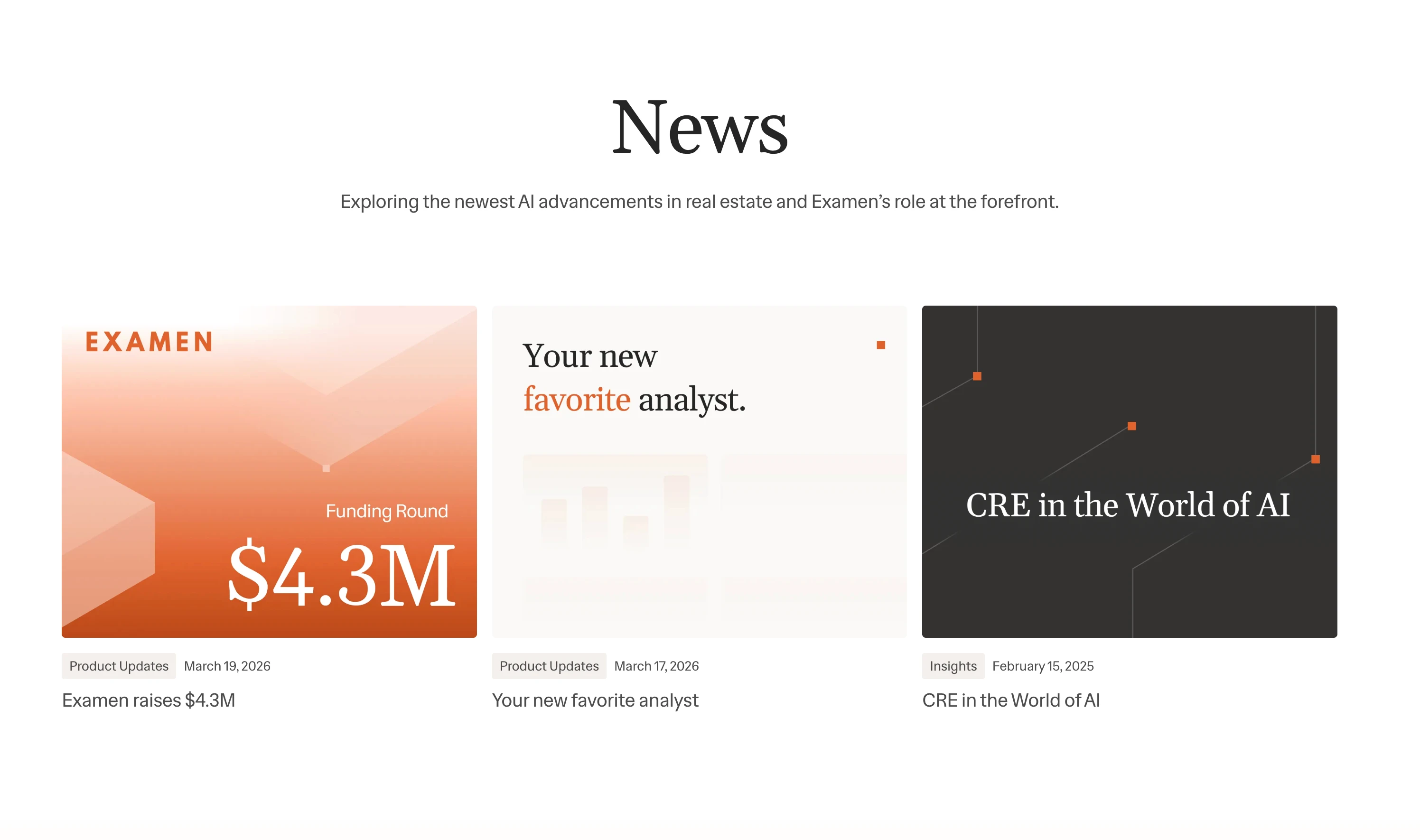 News: A dedicated news section keeps CRE professionals up to date with Examen's latest developments, product updates, and industry insights – reinforcing credibility and ongoing relevance.