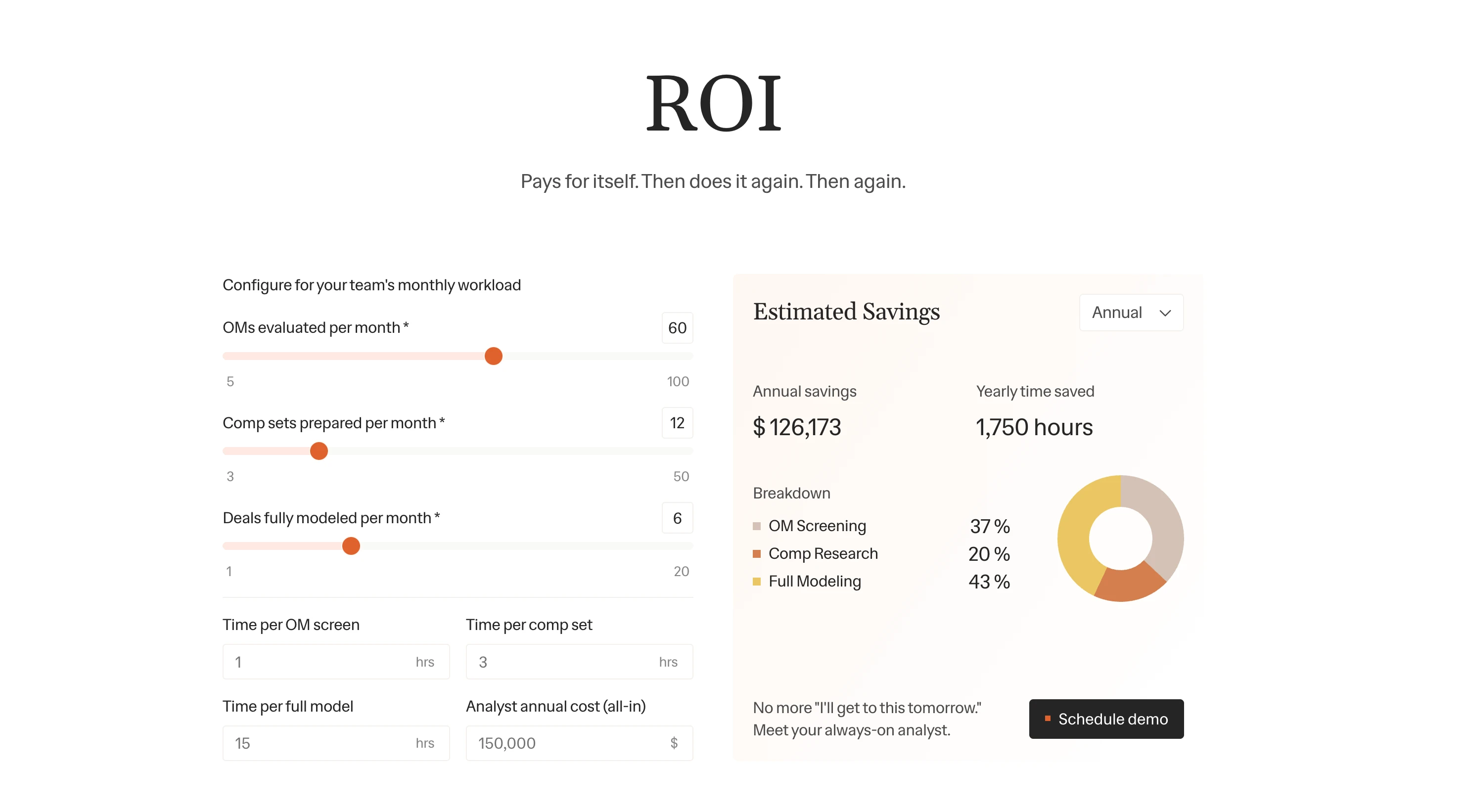 ROI: An interactive ROI calculator gives prospects a tangible, personalized look at the value Examen brings to their deals.