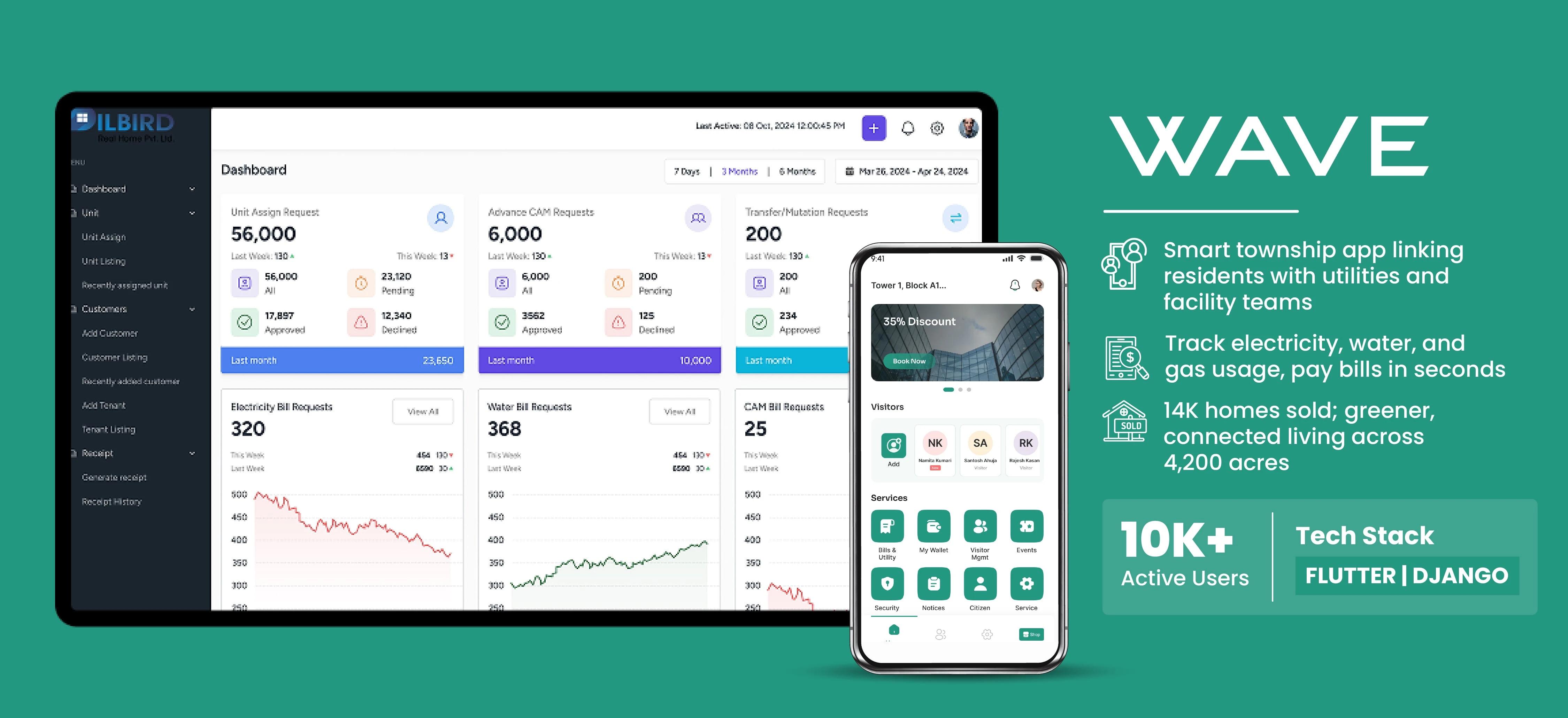 Wave Society App: Resident, Admin & FM apps unify ops, billing, engagement; GST/RERA/TDS compliant, SLAs, smart meters, IoT, real-time analytics. No silos.
