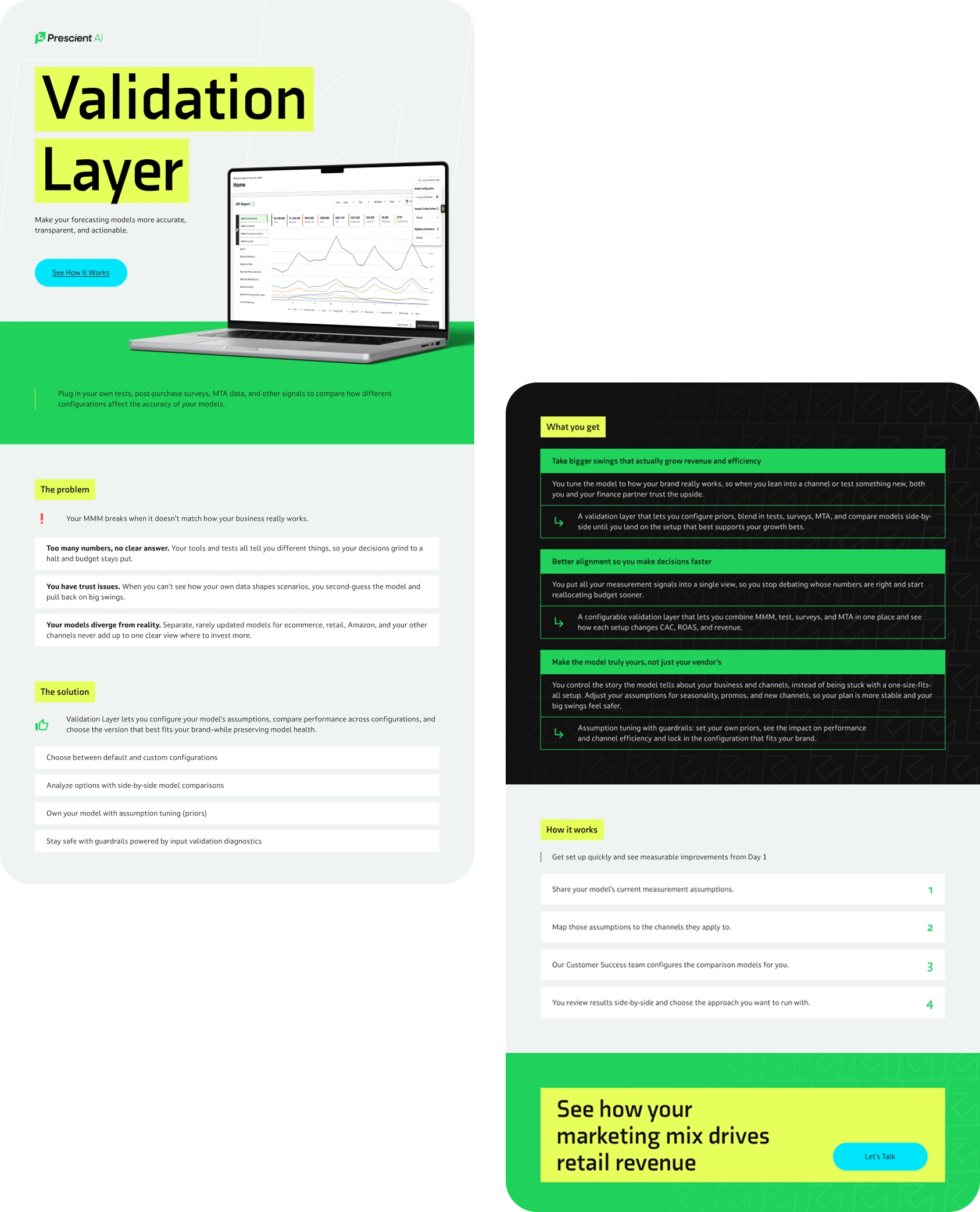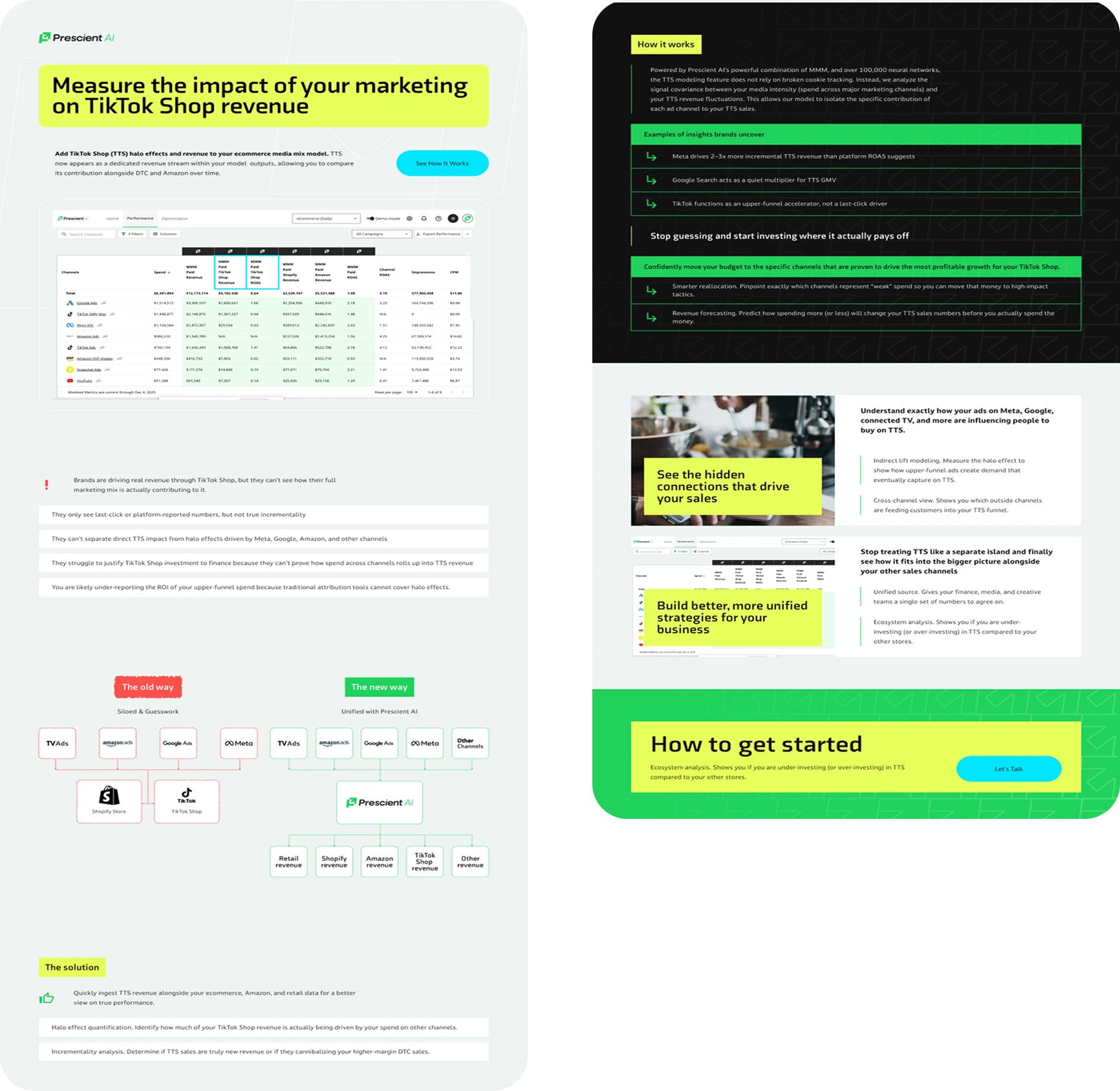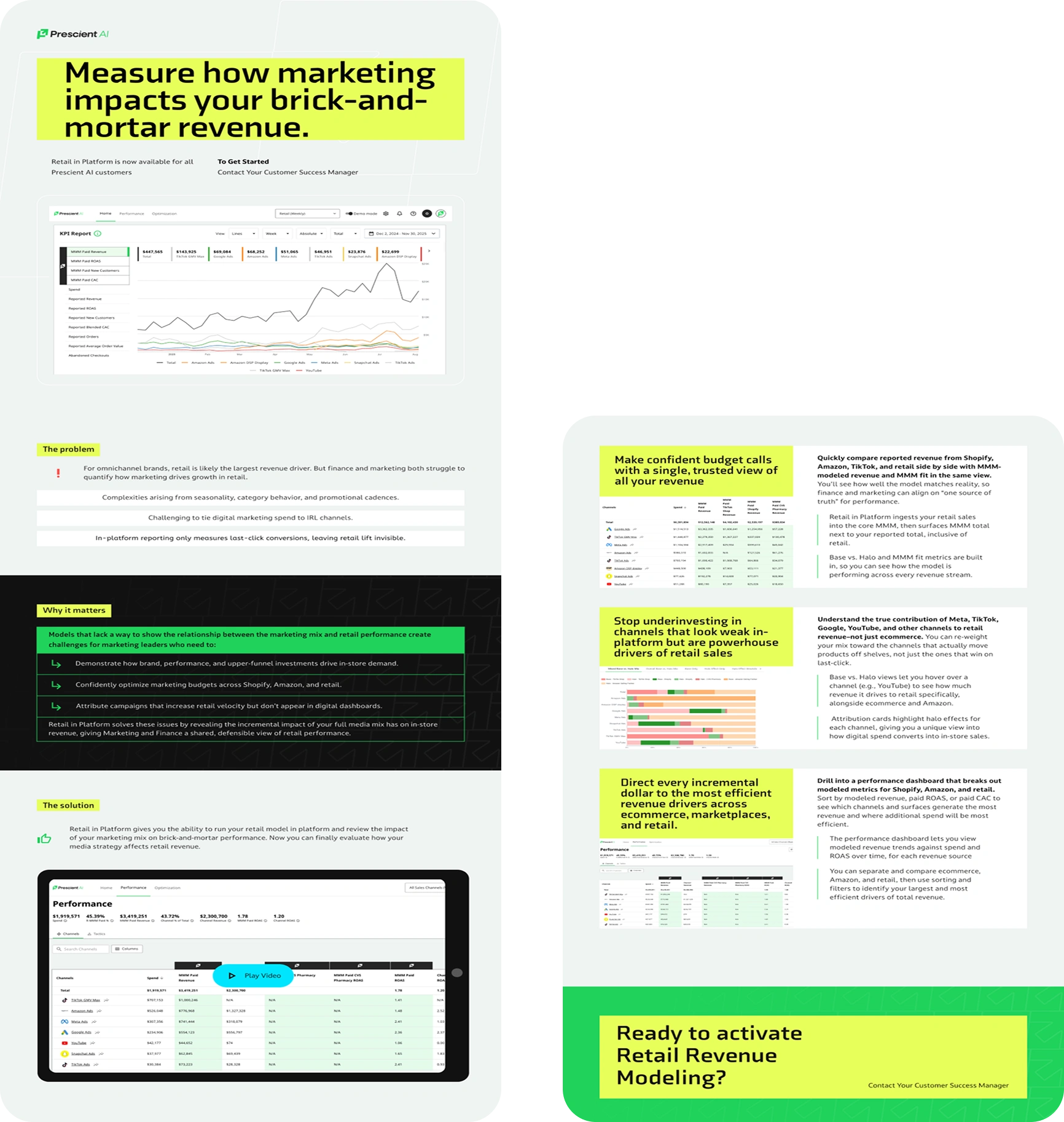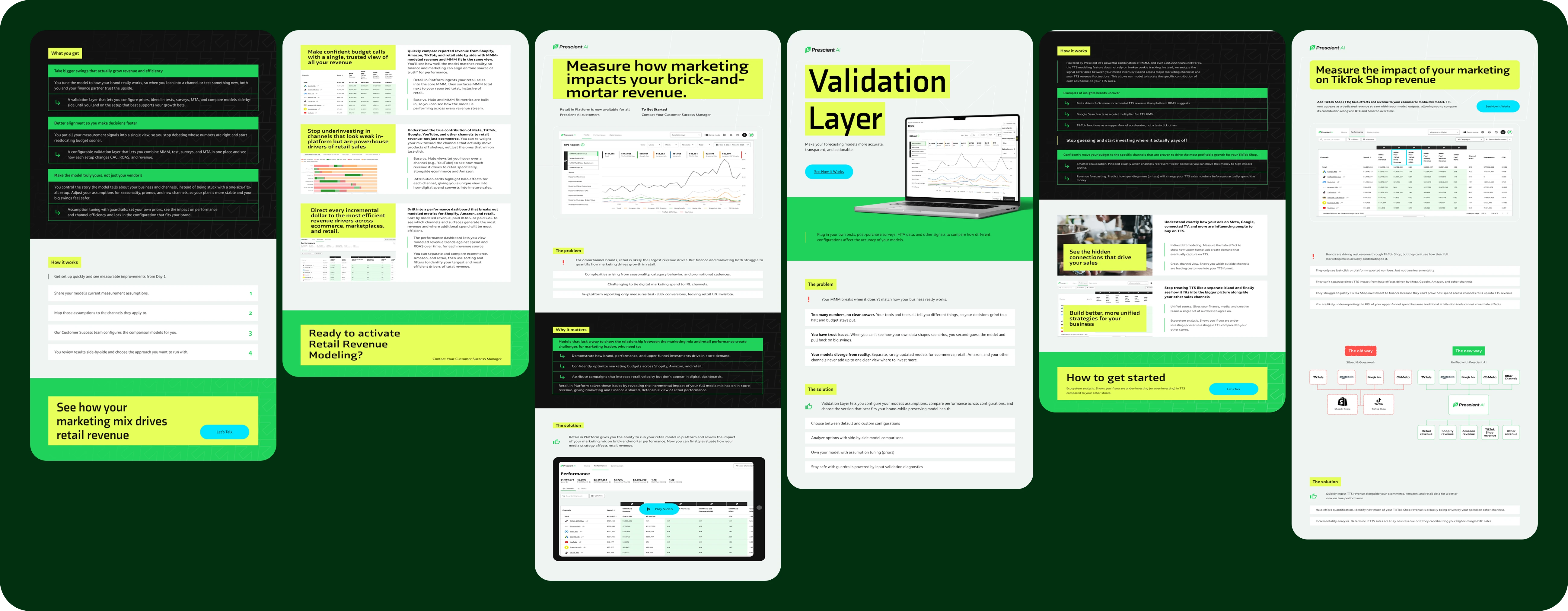 Three one-pagers for Prescient AI - US marketing SaaS. Retail, TikTok Shop, and brick-and-mortar use cases. Dark theme, data-heavy layouts.