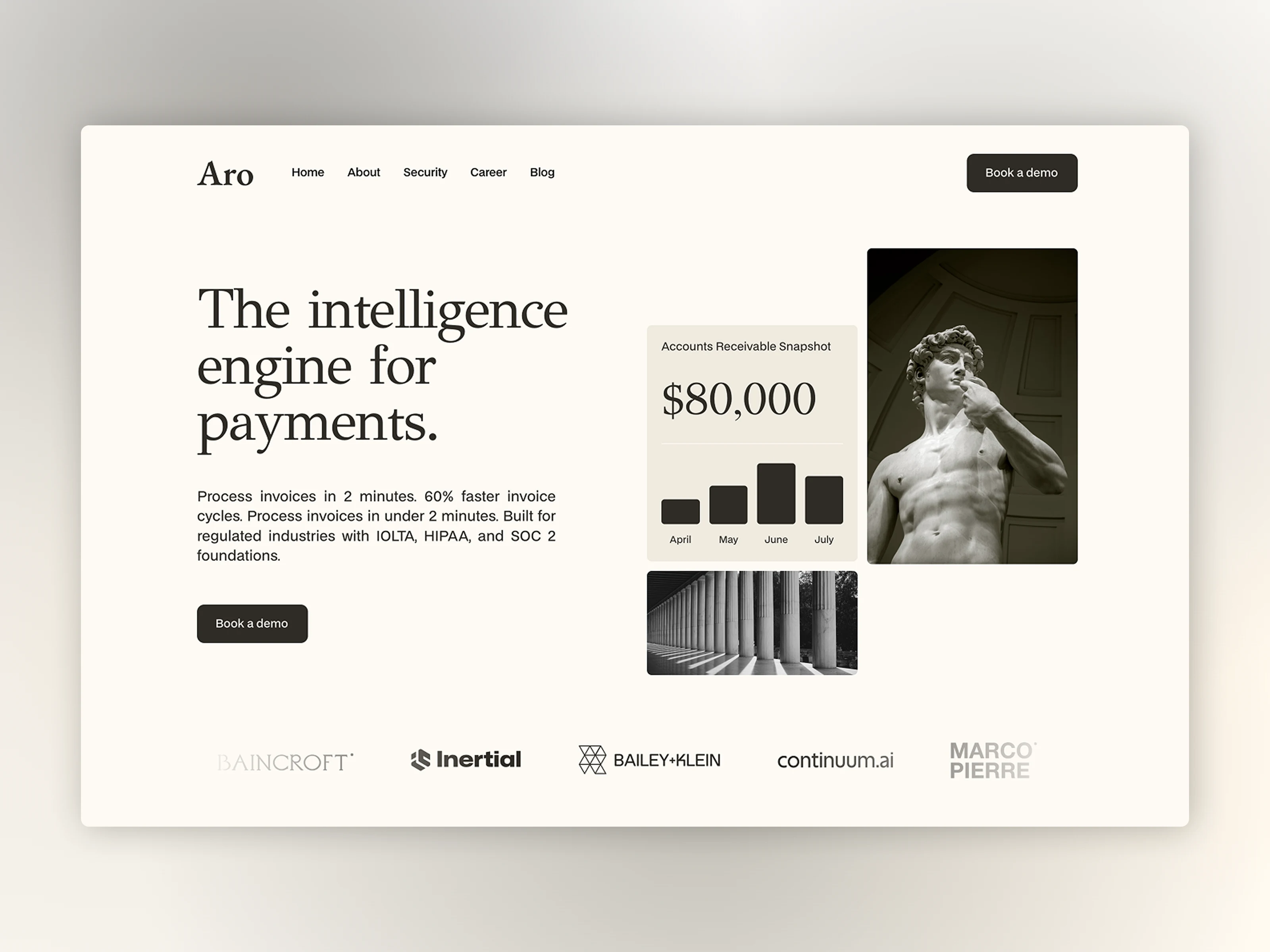 The objective was to create a digital presence that communicates structure, precision, and institutional trust — while clearly positioning Aro as an AI-native accounts payable and receivable solution.