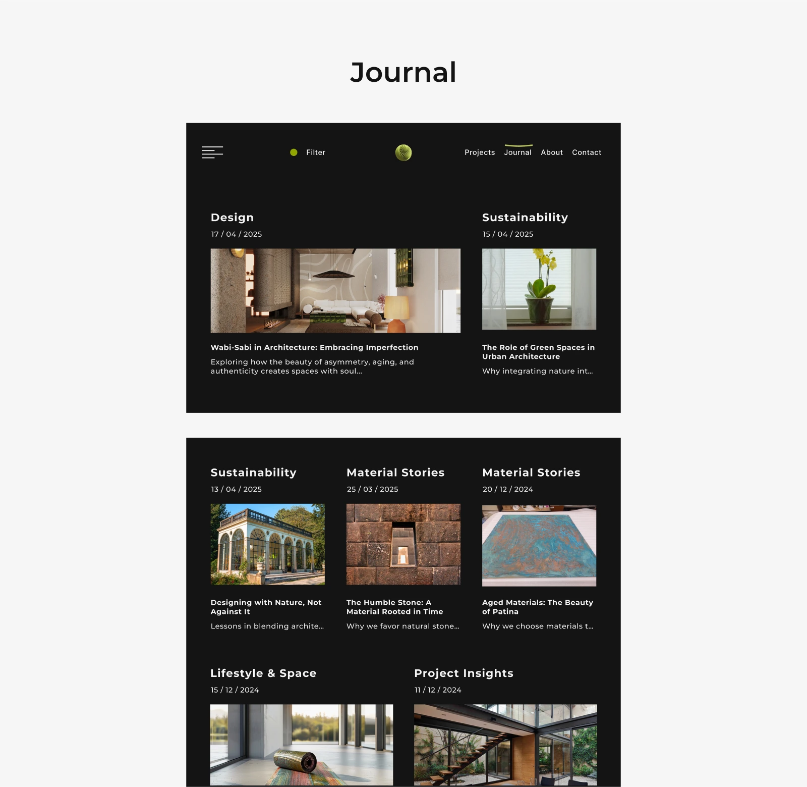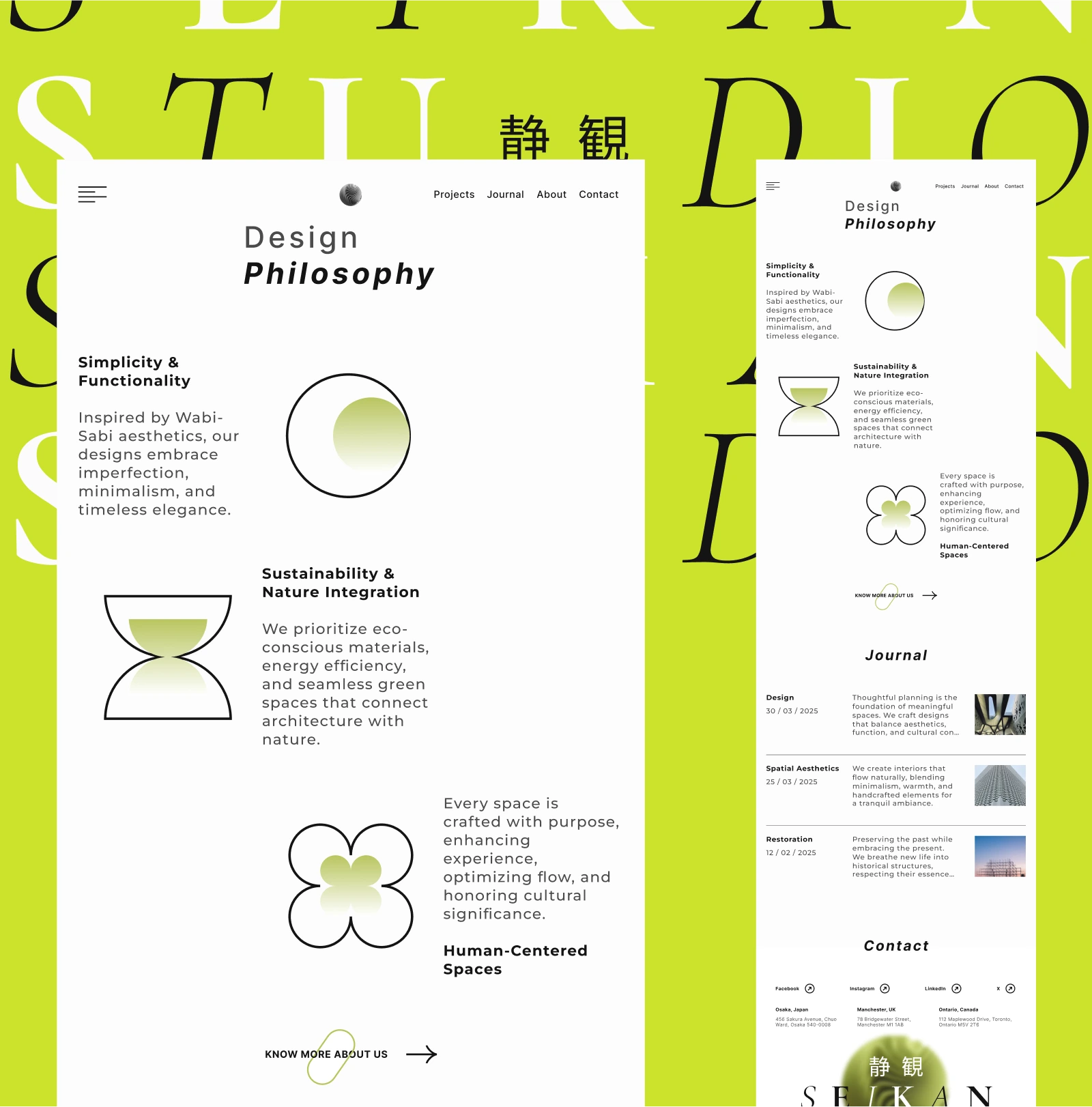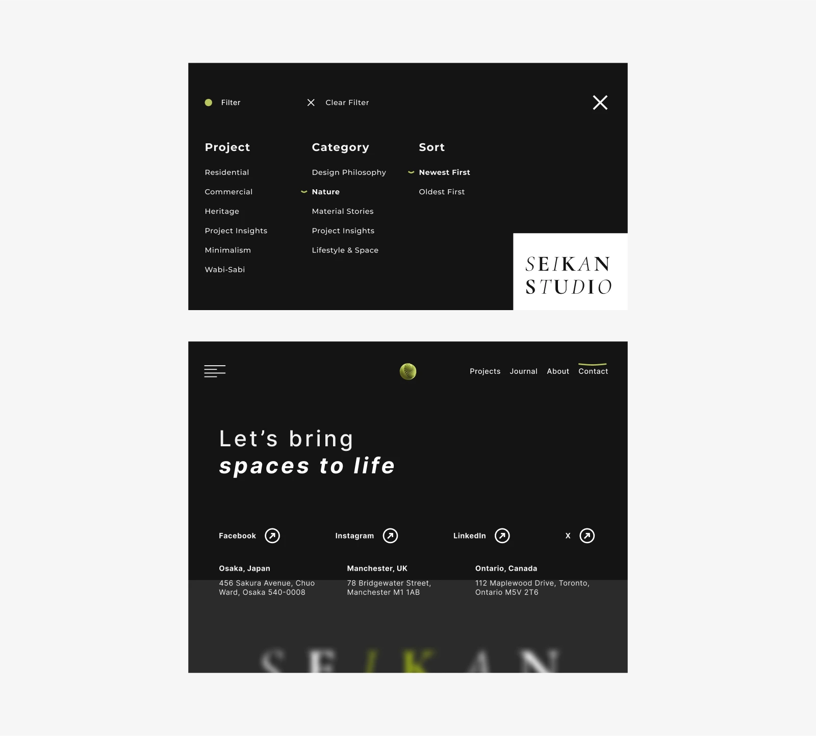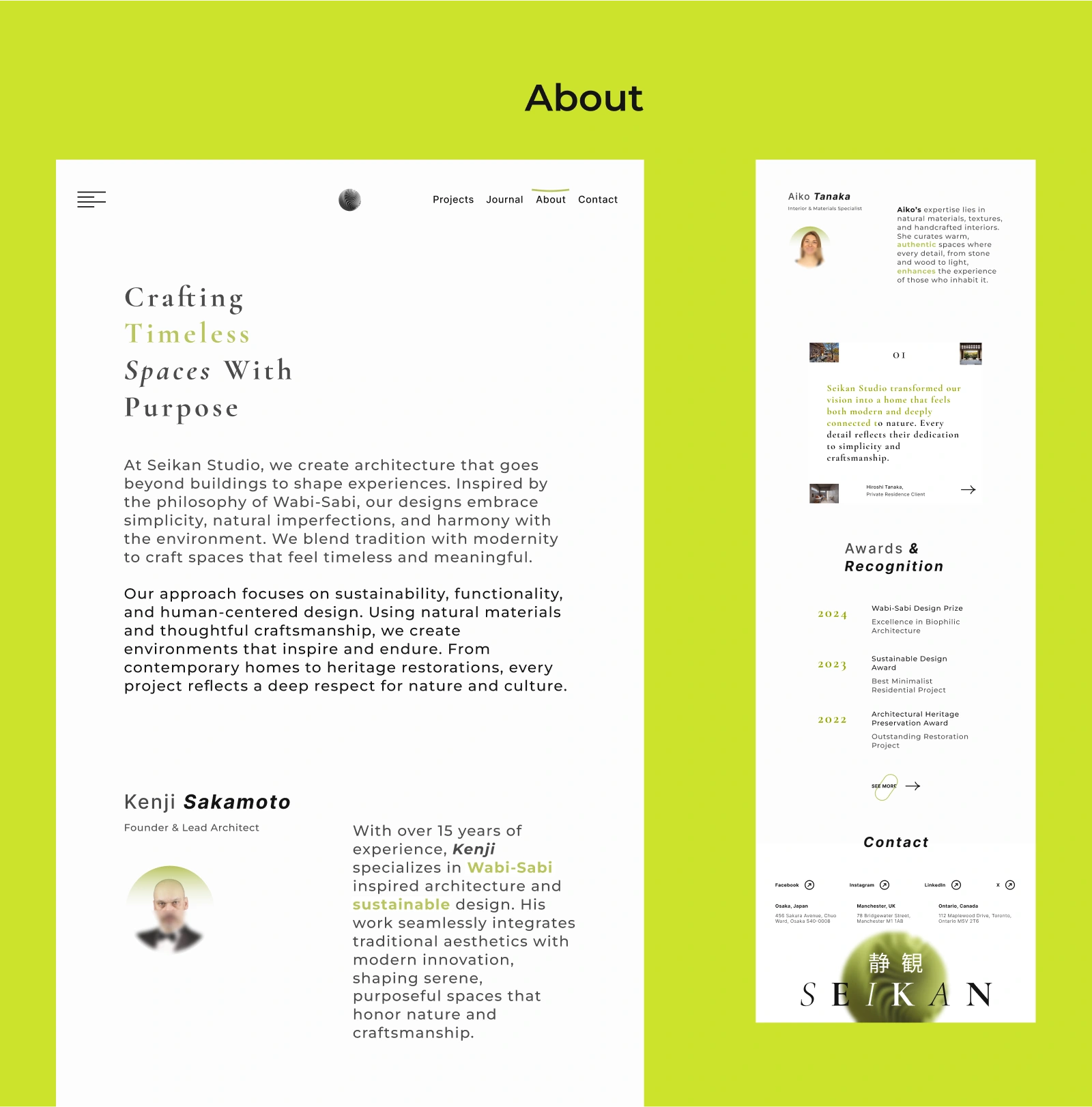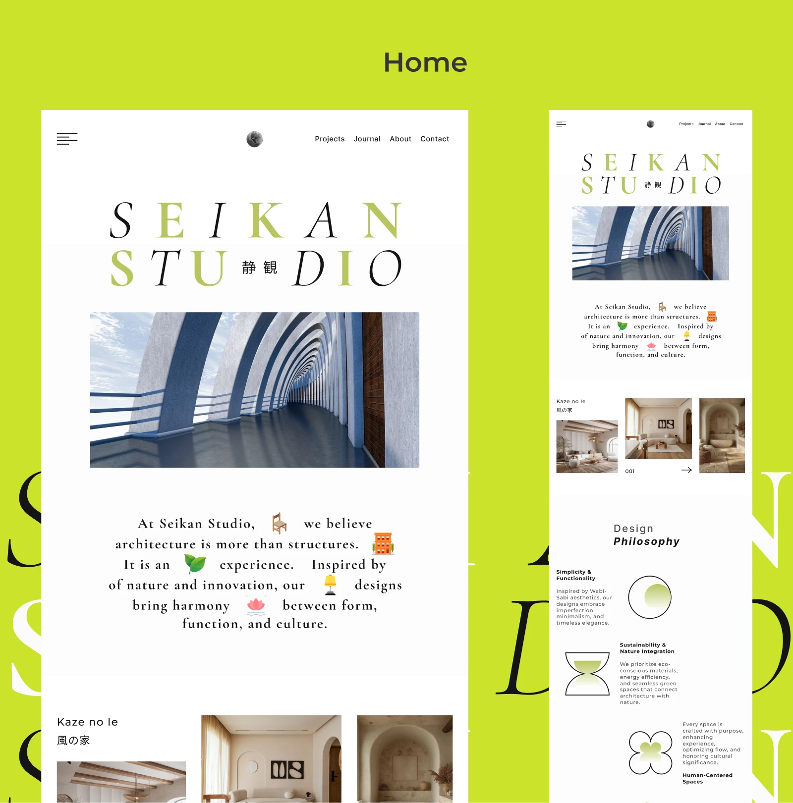 Seikan Studio is a conceptual design project created for an architectural design firm. The aim was to develop a visual style that feels timeless, clean, and sophisticated. The project extends across more than seven pages, with content arranged using a complex layout built on a 12-column grid system.