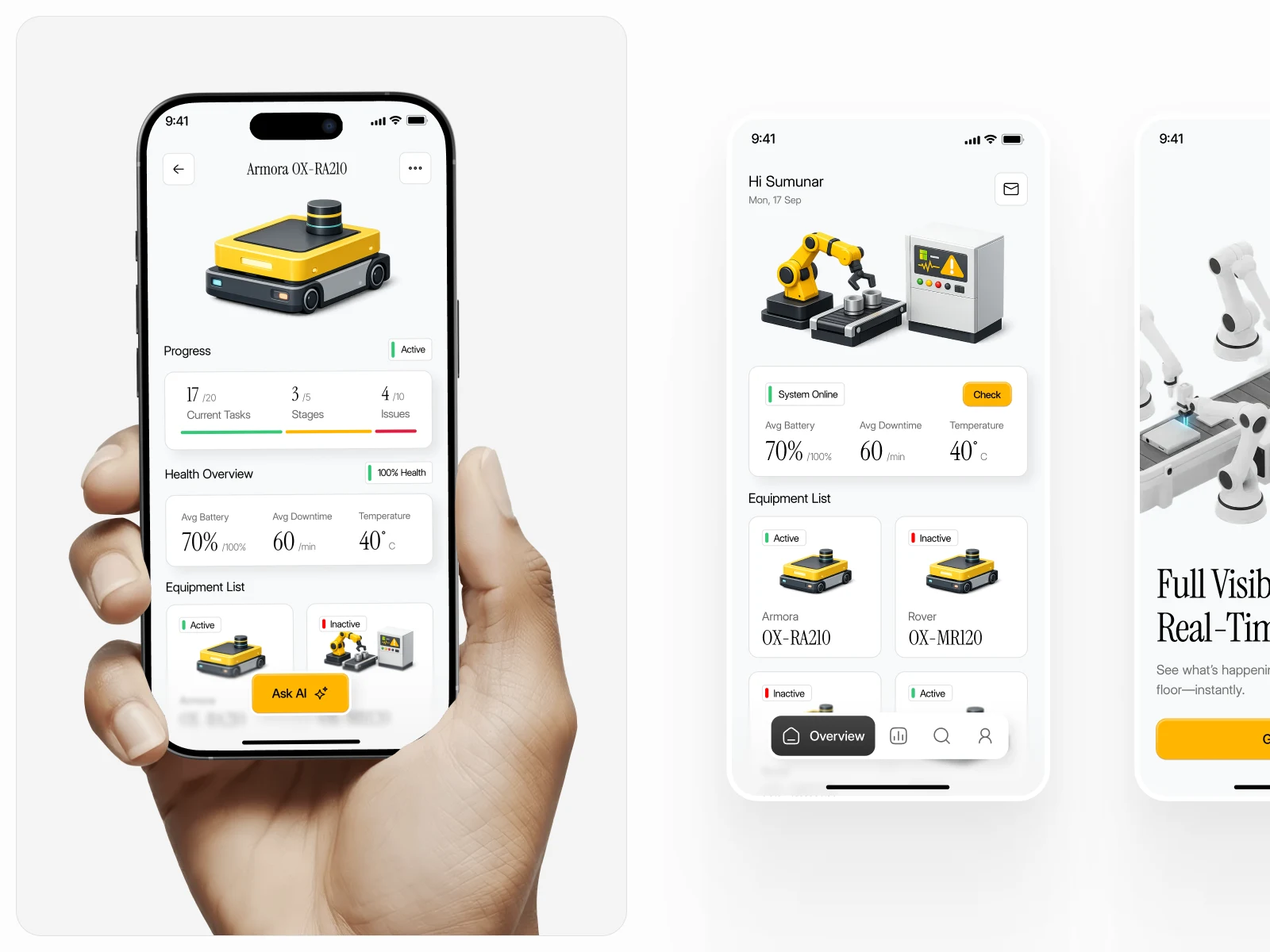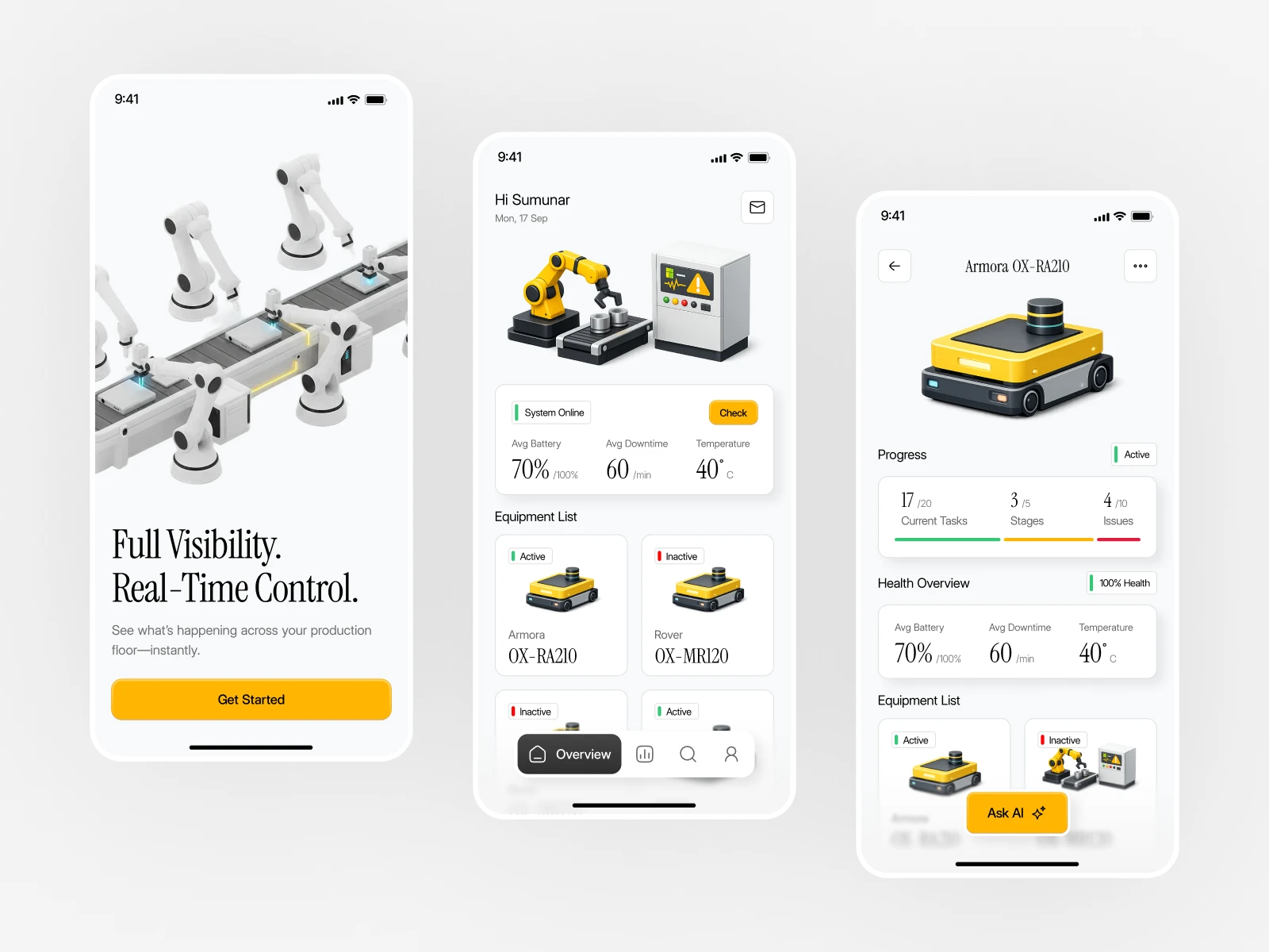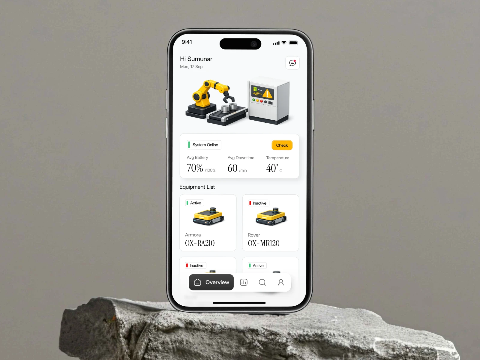 The interface enables users to track machine performance, monitor system health, and manage equipment with clarity and efficiency, all from a single mobile dashboard.