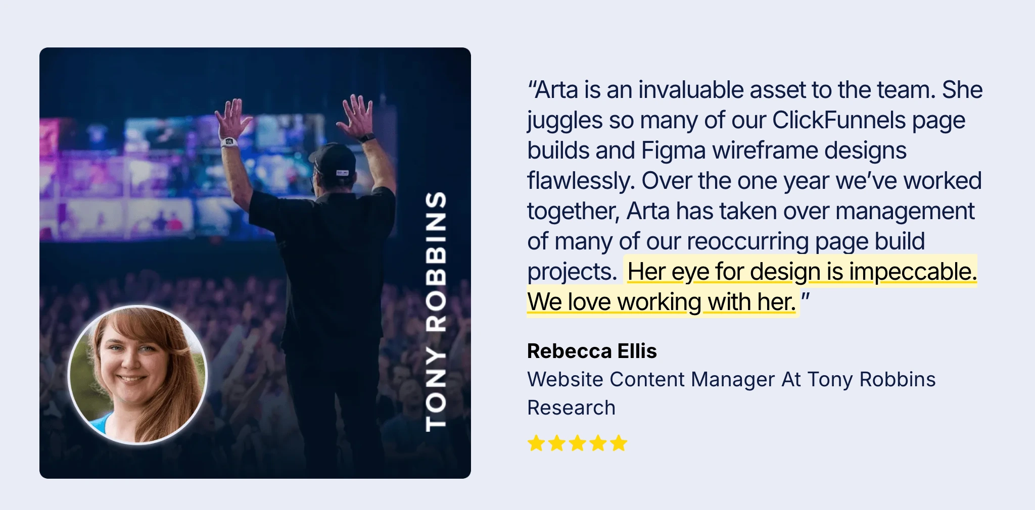 Redesigned multiple funnels for Tony Robbins, creating premium, conversion-focused sales experiences that elevated brand cohesion and results.