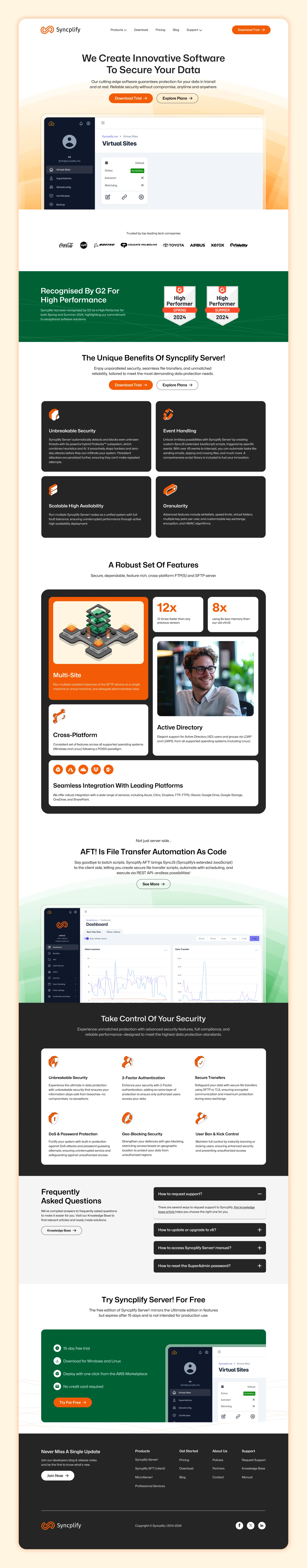 Syncplify, a leading provider of secure file transfer solutions, approached me to redesign their website, focusing on modernisation, clarity, and conversion. While thousands of enterprise users trusted their technology, their existing website no longer reflected the credibility and sophistication of their product. The goal was to create a digital experience that communicated trust at every touchpoint — through refined visuals, intuitive navigation, and a structure optimized for engagement and lead generation.