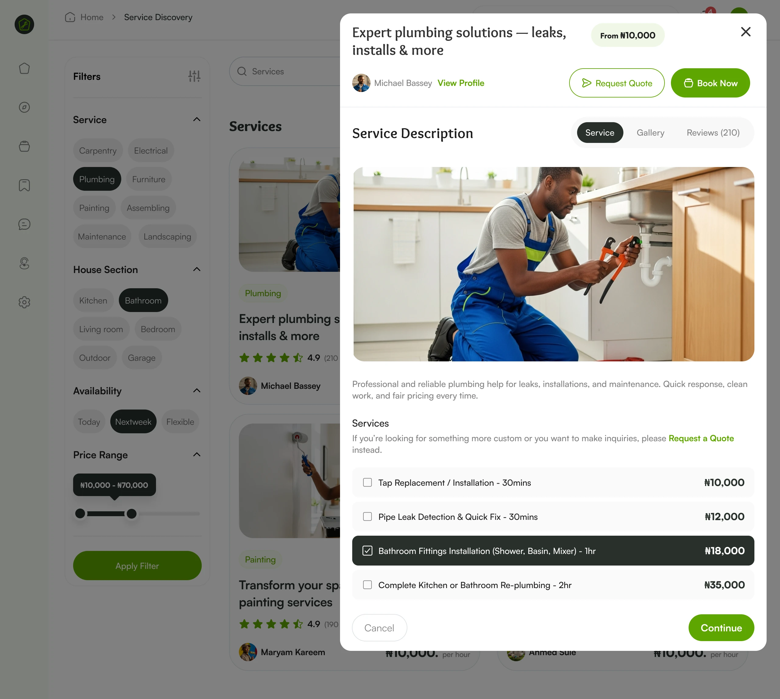 Handymen must set a “starting from” price (e.g. ₦10,000), then can add optional sub-tasks with individual prices.