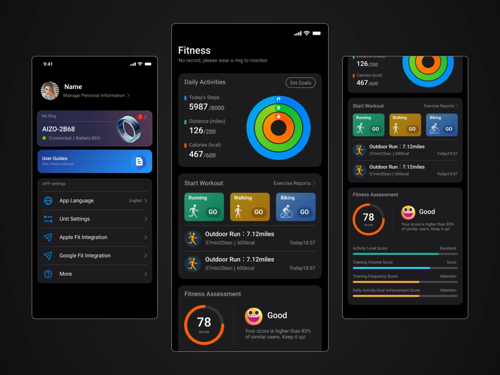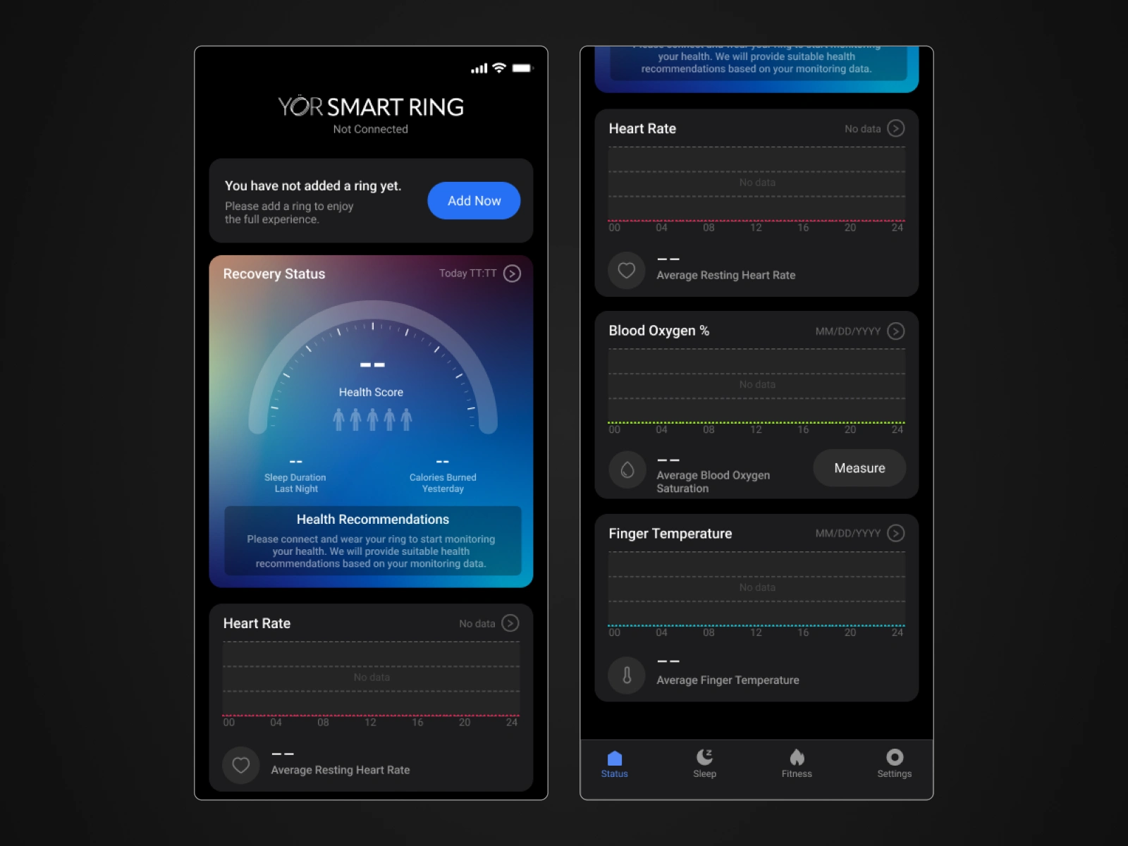 Designed a sleek mobile UI for a smart fitness ring app to track heart rate, sleep, SpO2, temperature & goals—offering real-time data with smooth UX.
