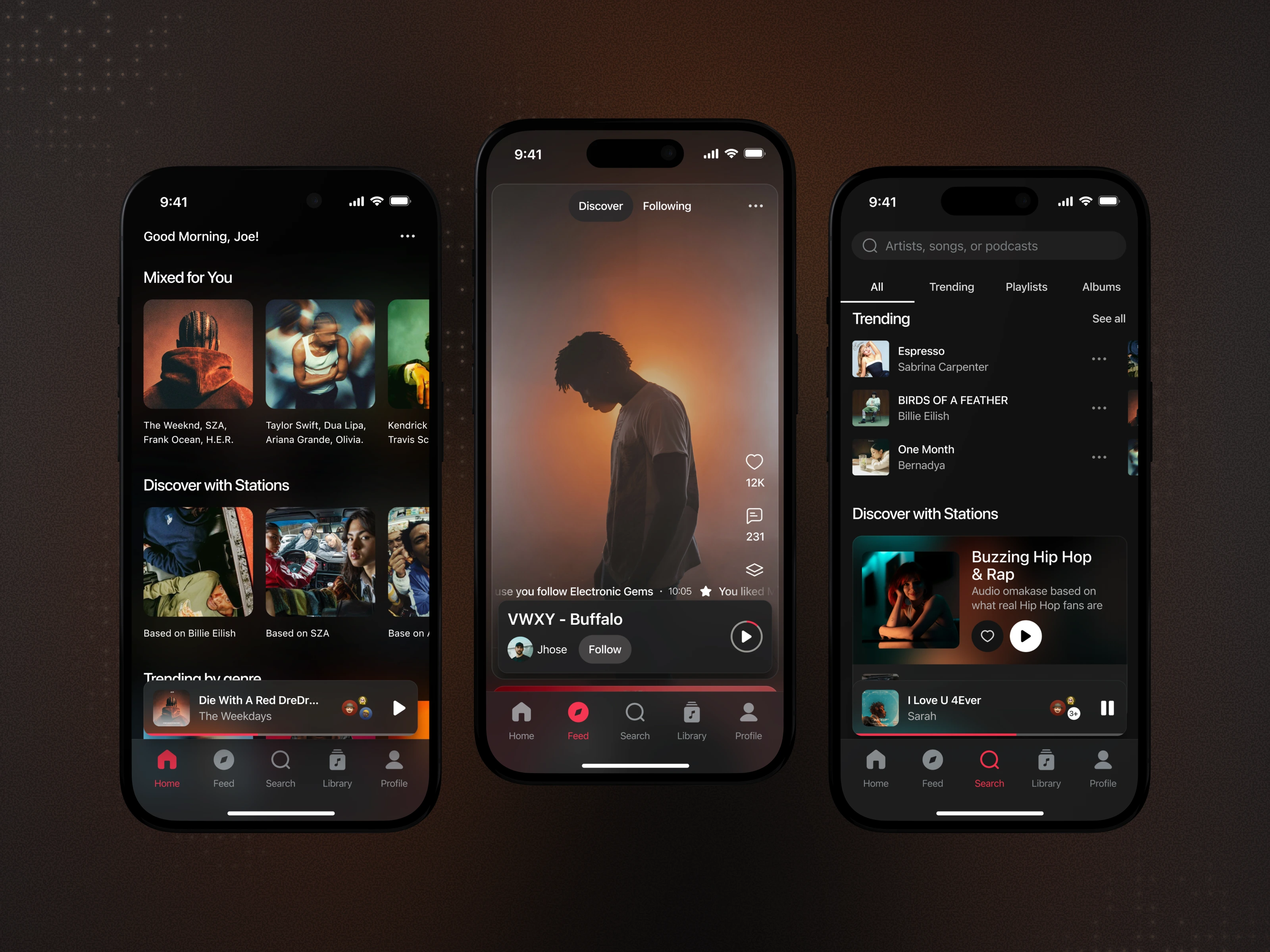 We designed the app with a mobile-first, content-forward mindset, focusing on clarity, visual elegance, and frictionless interactions. The dark theme reduces eye strain during extended listening sessions while allowing album artwork and content to pop. Navigation follows familiar patterns with clear visual cues, while personalized sections like "Mixed for You" and "Discover with Stations" are surfaced immediately on the home screen. Each screen maintains consistent hierarchy and spacing to create a cohesive, premium feel.