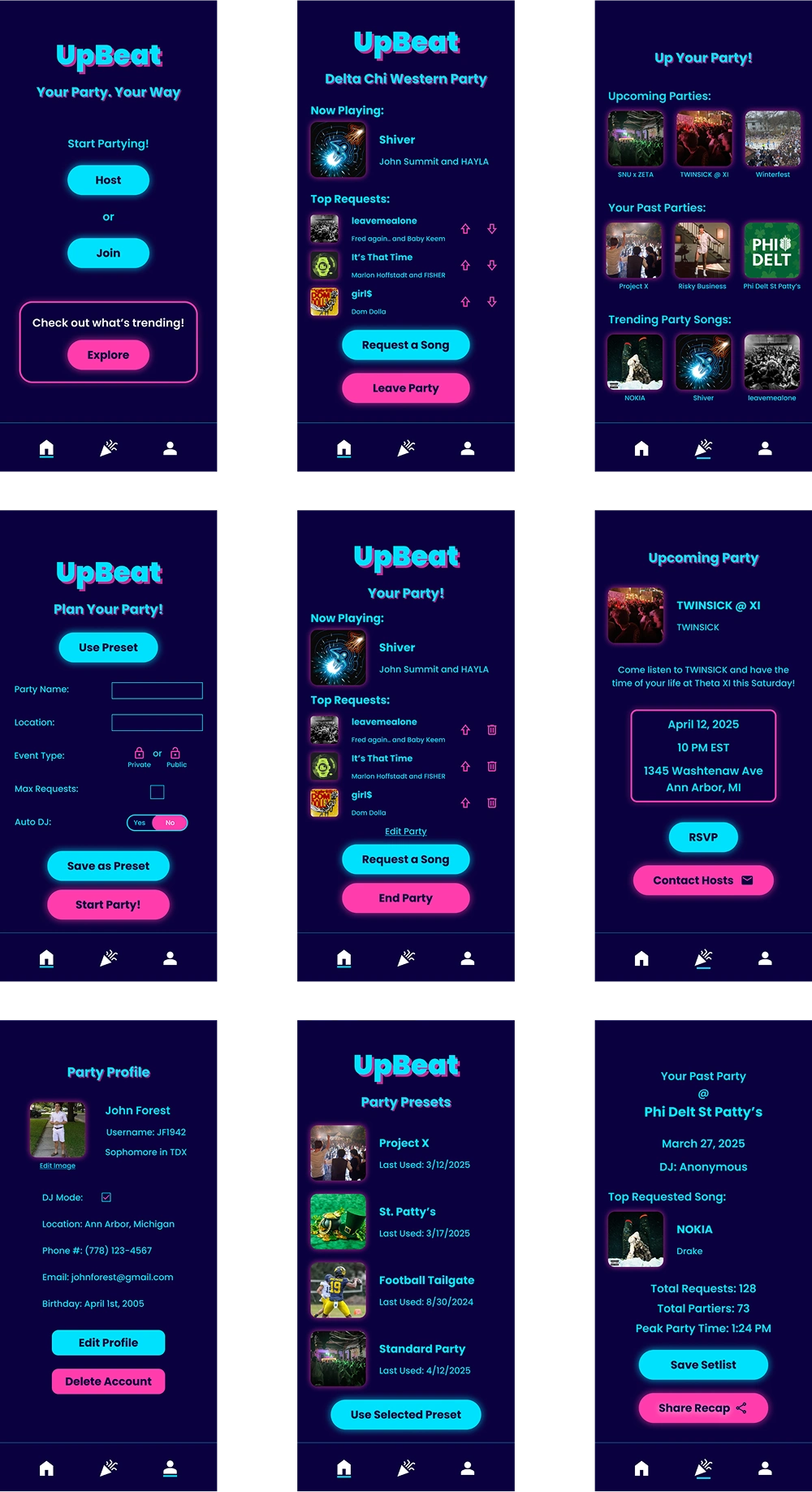 This is UpBeat, a personal passion project I designed as a DJ myself. It is intended to allow users to influence their party experience by requesting songs, saving setlists, sharing recaps, and more. Music can often be a point of contention at house parties and clubs, with partygoers being upset if they are not hearing the music they want. This app design allows users to easily request and vote on others song choices without taking up too much time so they can still enjoy the party. I've included a few key frames above, but the full prototype can be used below.