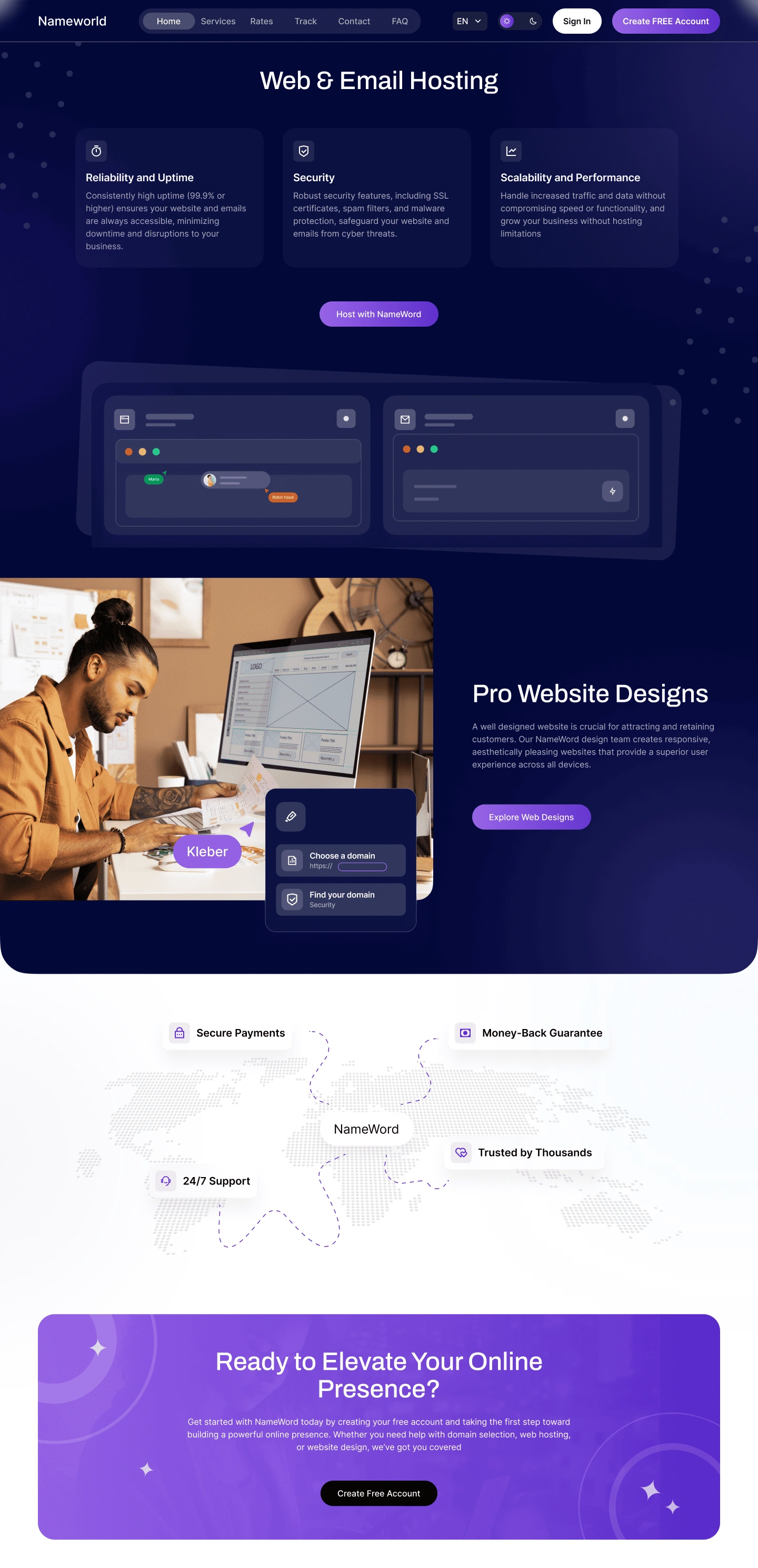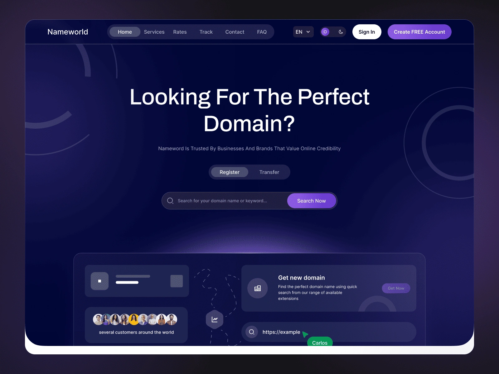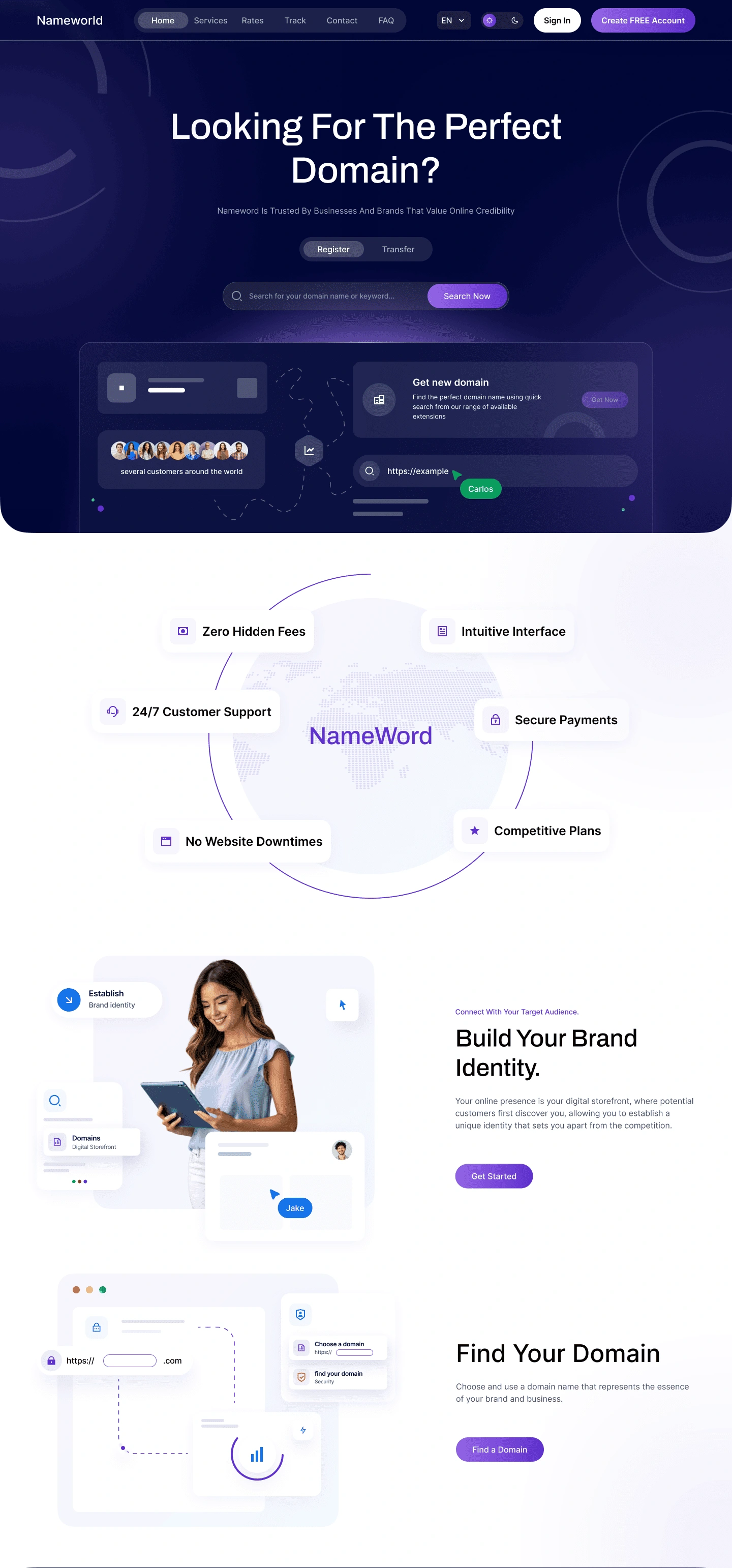 Homepage for a domain registration platform with clear CTAs, feature highlights, and brand credibility.