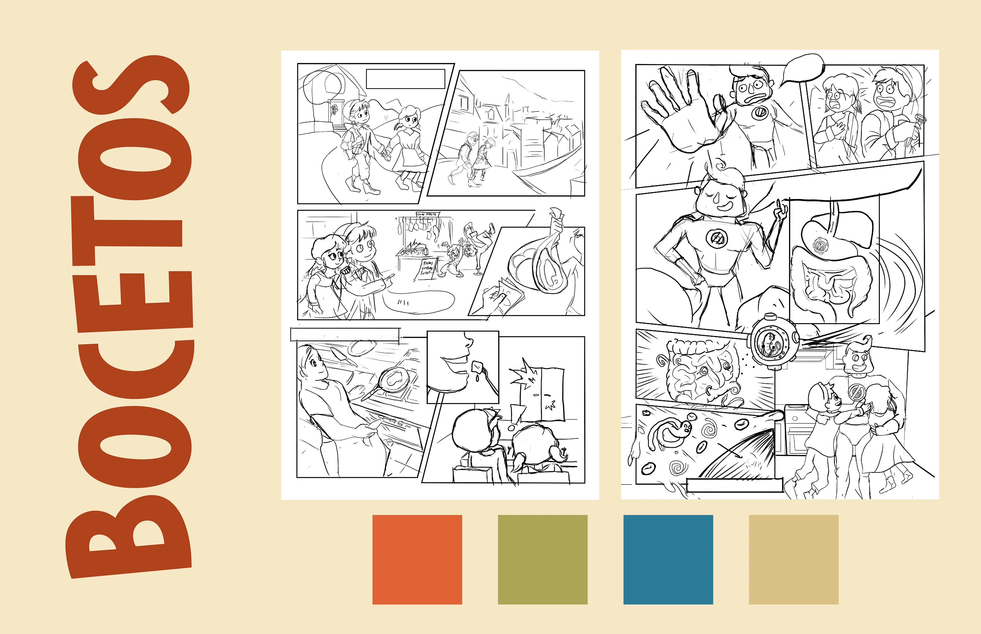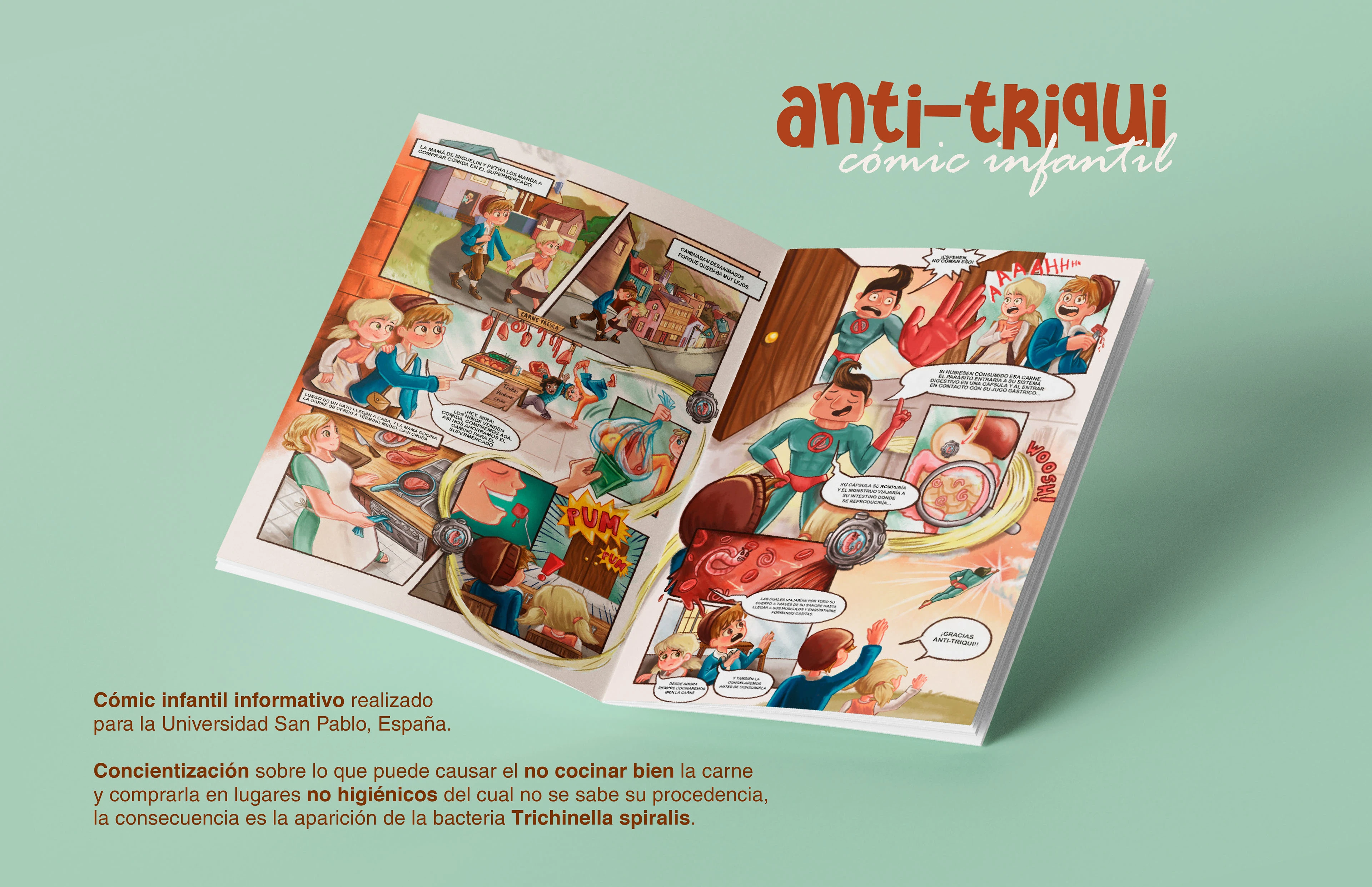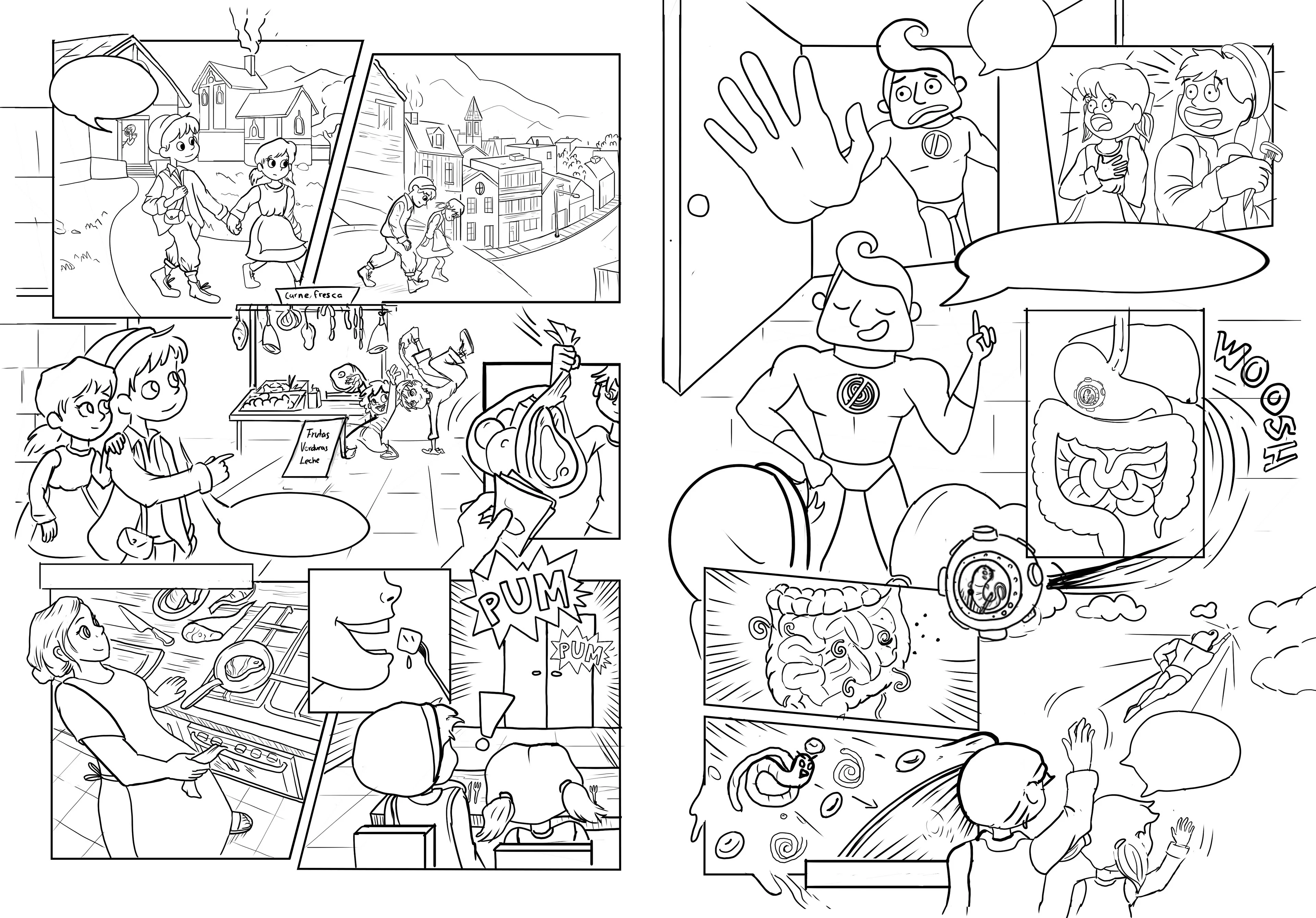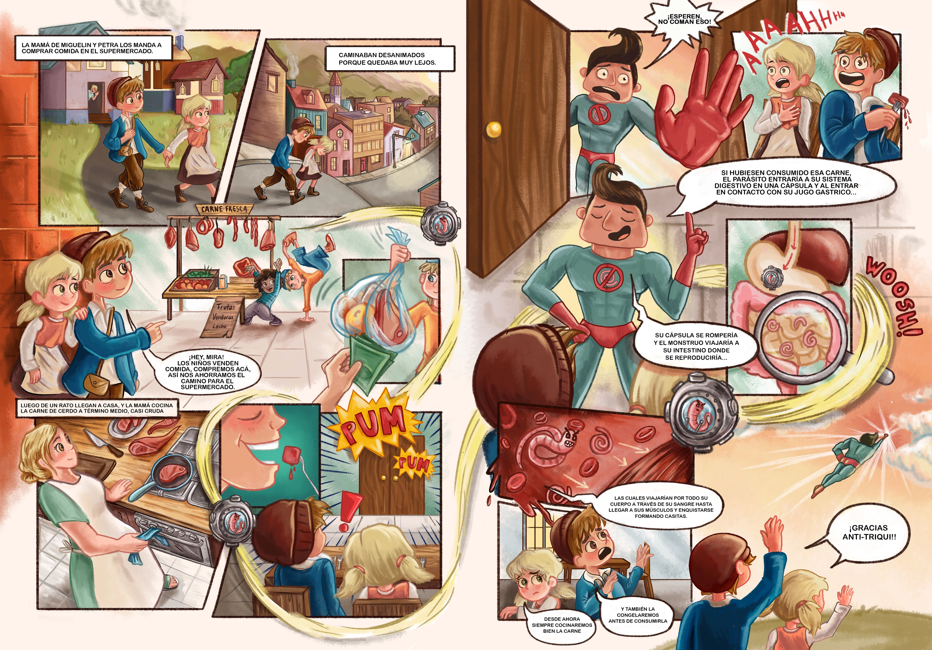 Informative children's comic book about the "Trichinella spiralis" parasite, generated from consuming raw meat and poor hygiene.