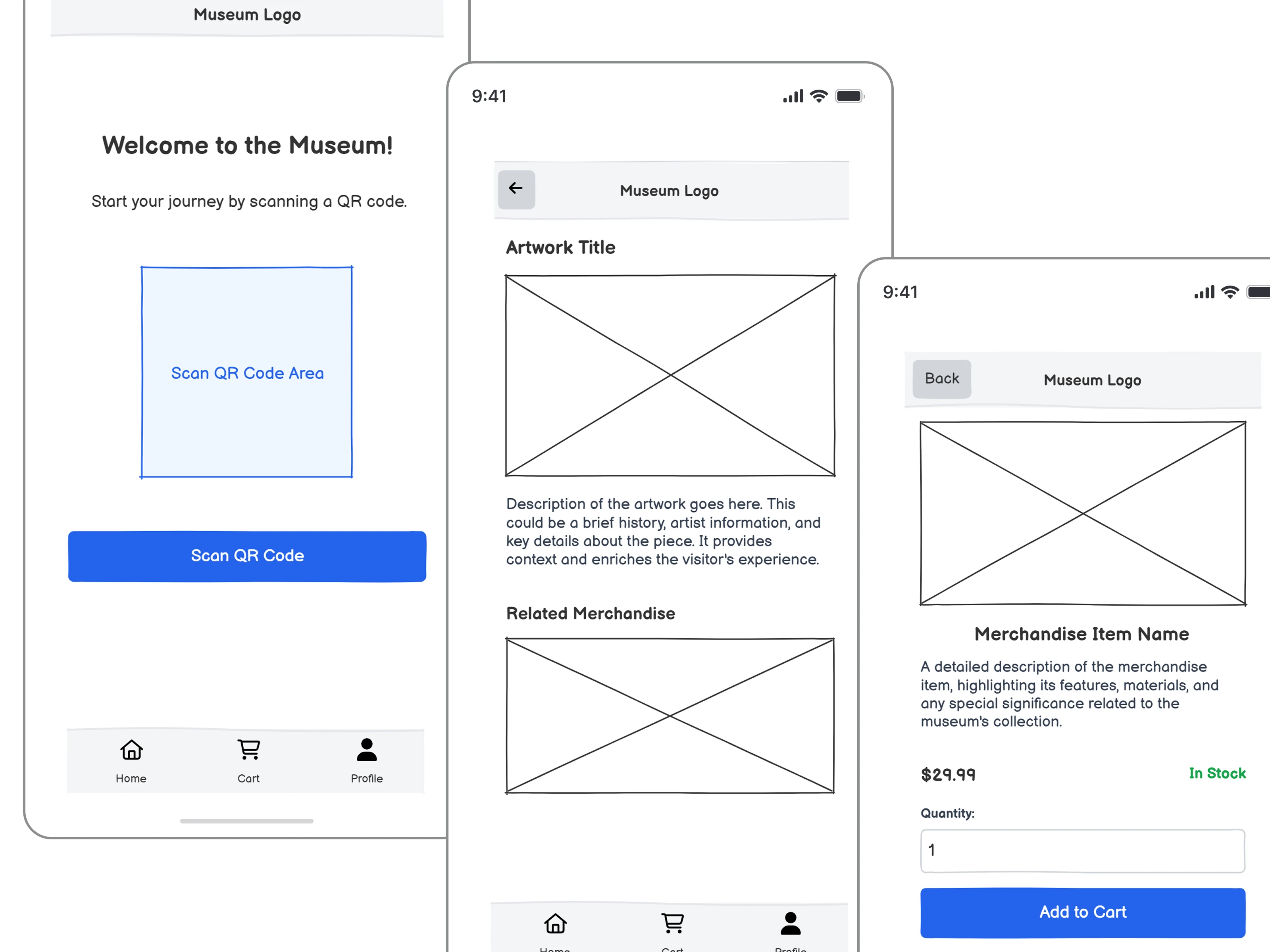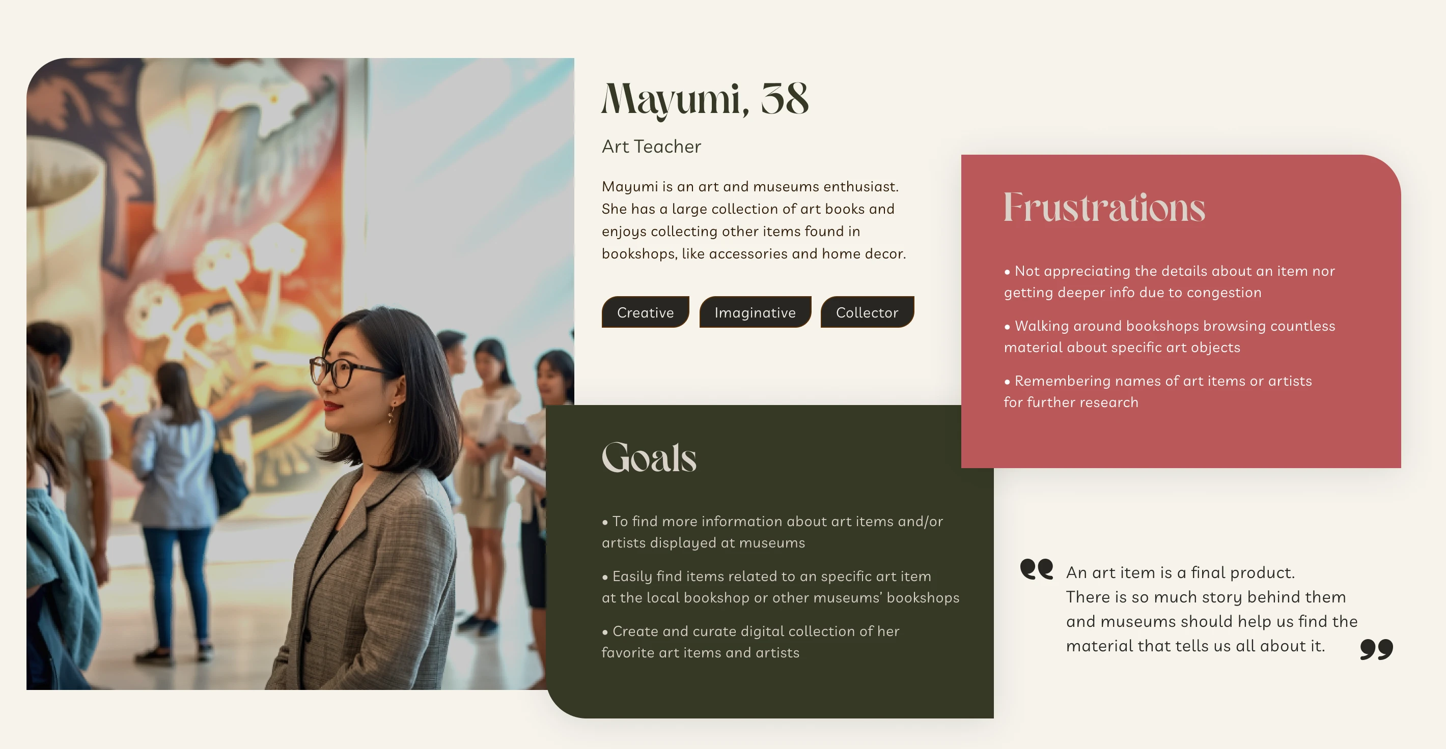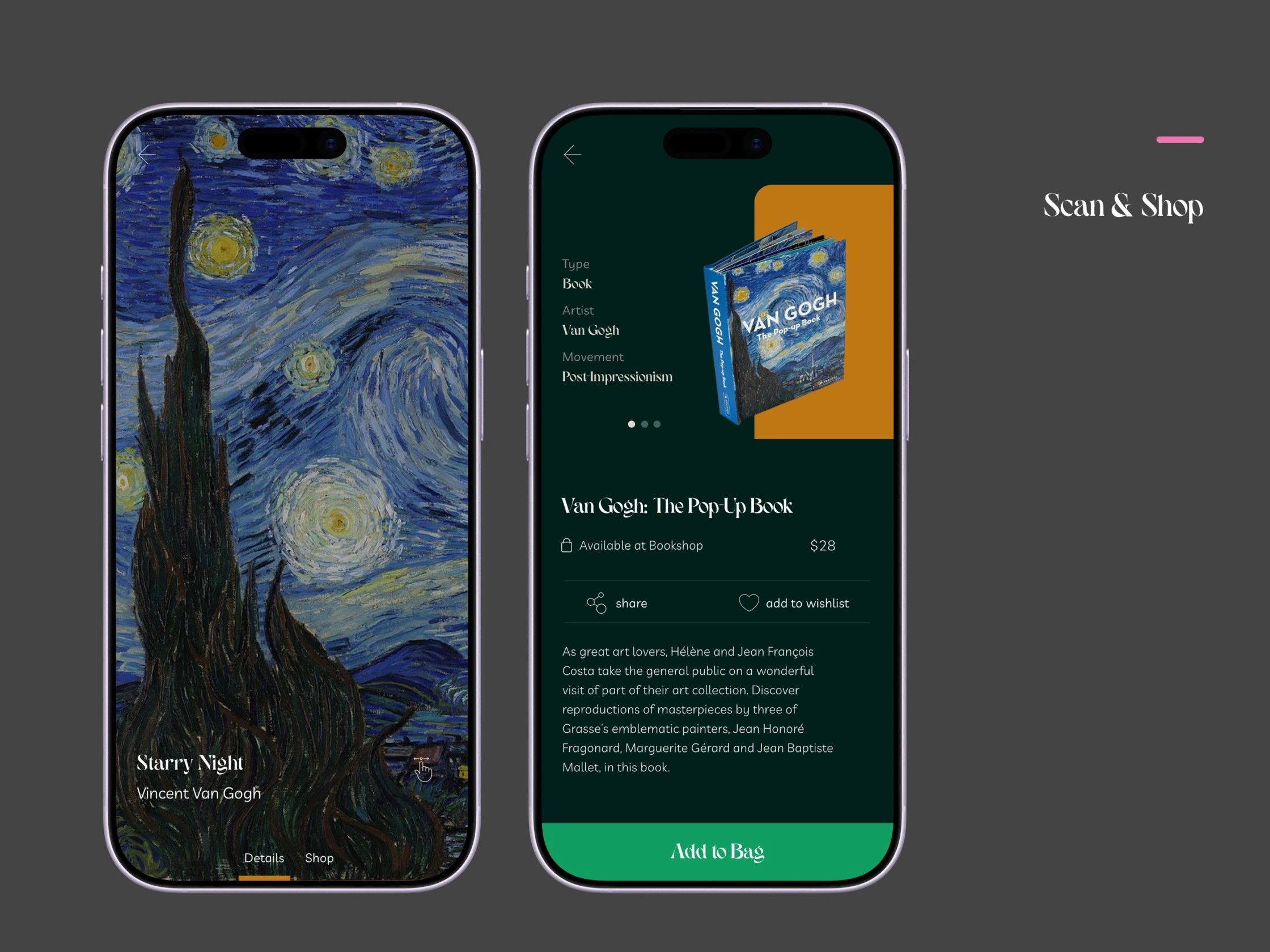 Museum bookshops often prioritize merchandise related to the most popular artworks, creating cluttered displays that make it difficult for visitors to find items connected to specific pieces they personally enjoyed. This project proposes a more personalized shopping experience by introducing QR codes next to artworks that link to a digital catalog of related products.