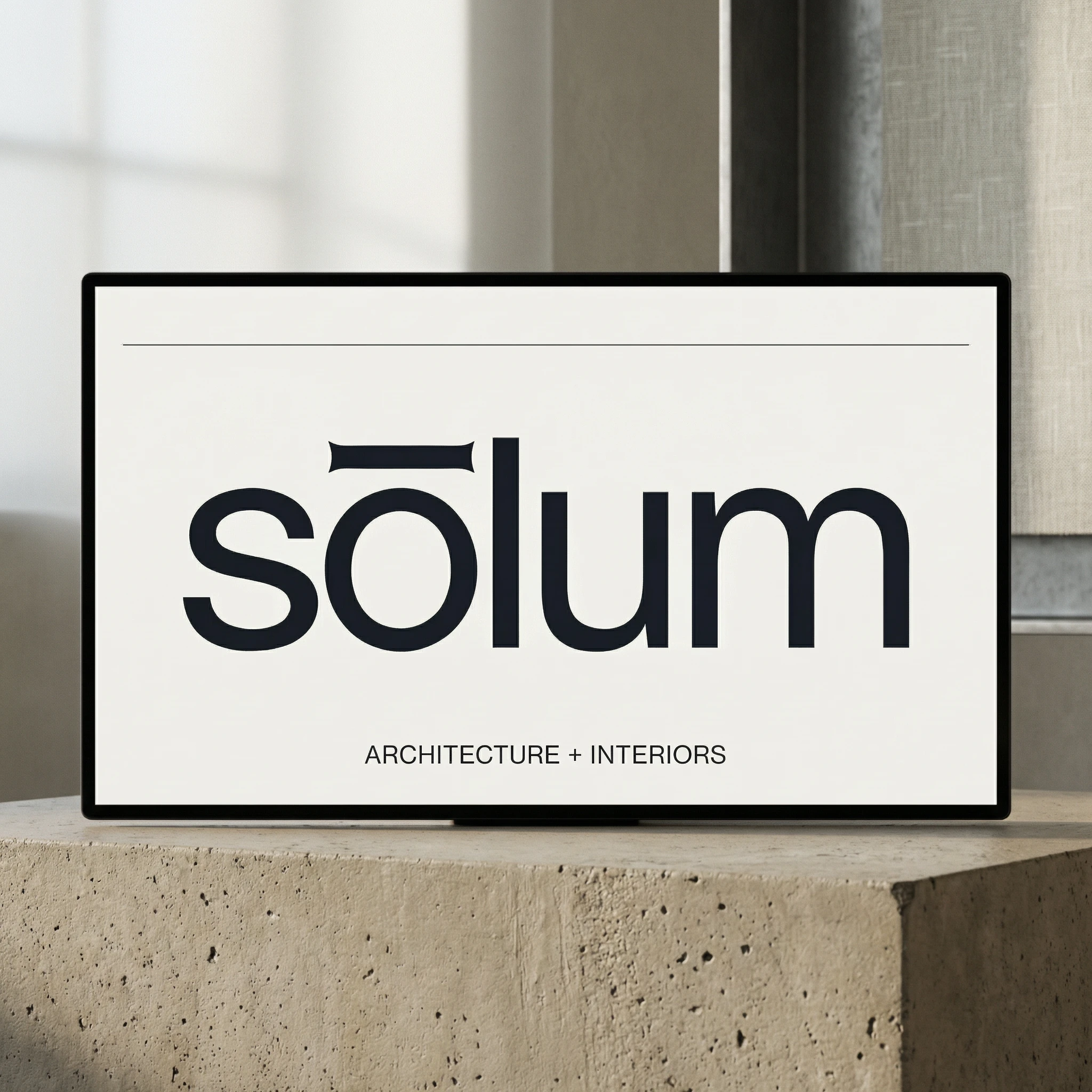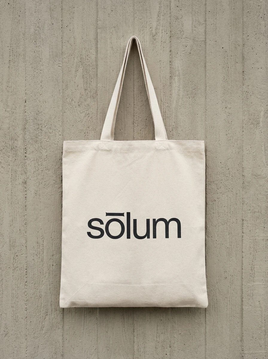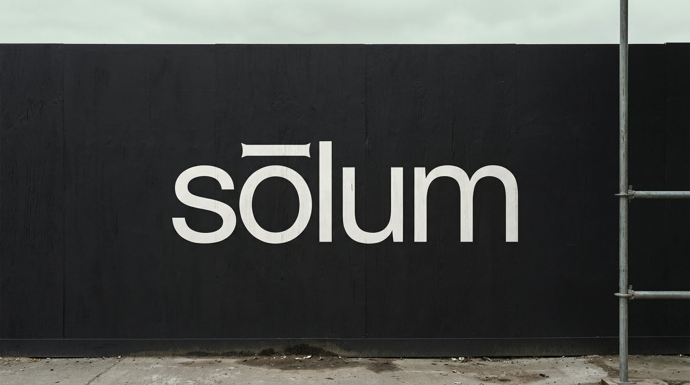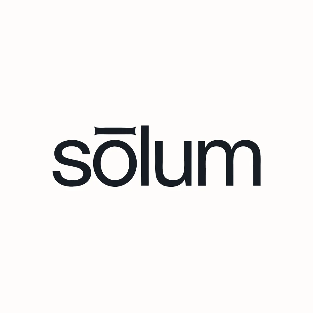 "sōlum" — set entirely lowercase, in a single weight of a geometric sans-serif. The macron above the ō is the only distinguishing mark in the system, and it does more work than any decorative element could. Slightly extended beyond the letter's natural width on both sides, it functions simultaneously as a diacritic, a horizontal rule, a datum line, and the brand's sole visual signature. At small sizes it reads as an accent. At large sizes it reads as architecture.