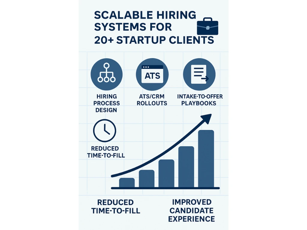 Built scalable hiring systems for 20+ startups: ATS rollouts, intake-to-offer guides, and scorecards. Reduced time-to-fill and drop-off.