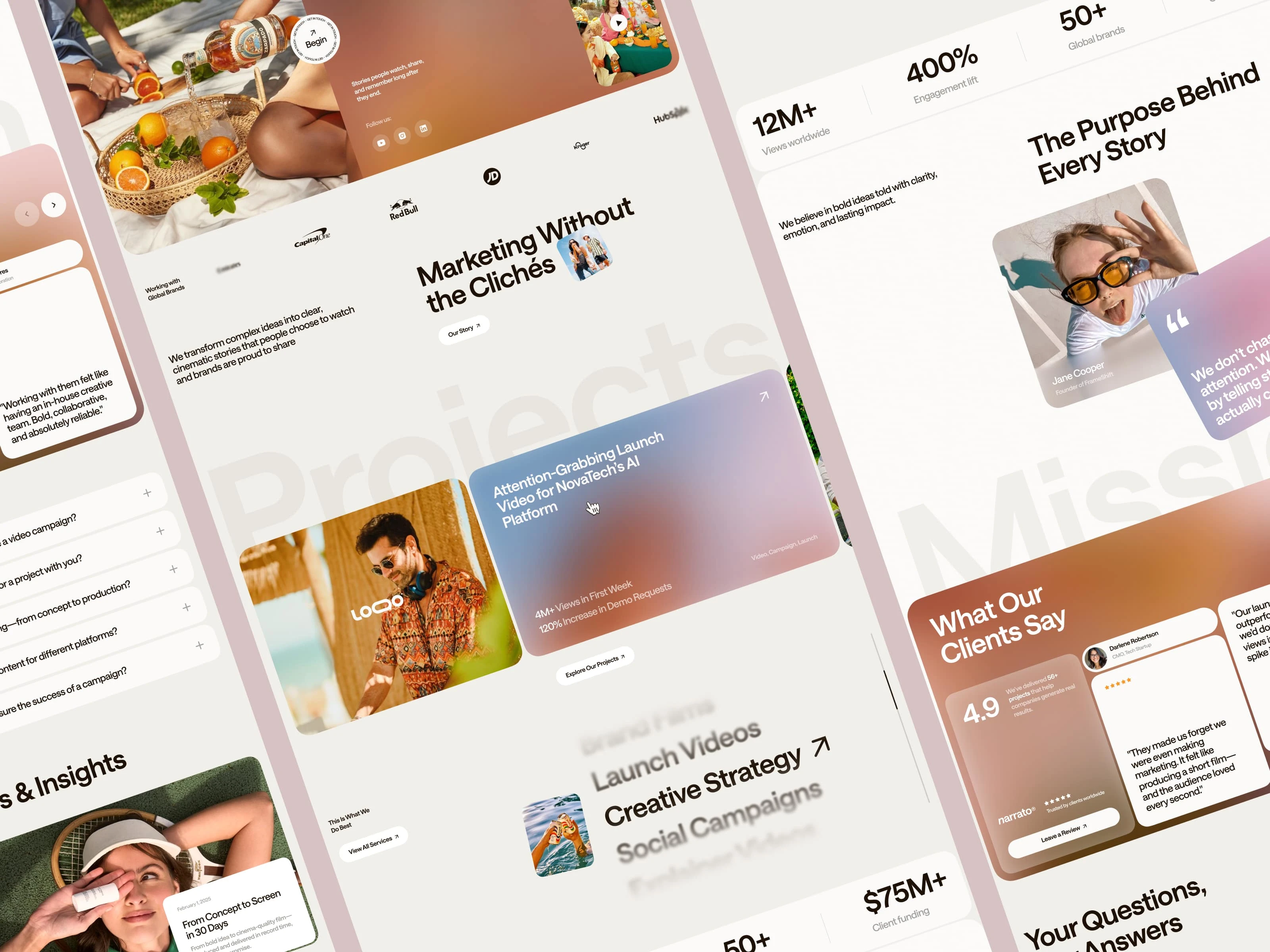 Clean and cinematic layout highlights video campaigns, creative strategy, and social campaigns. Includes responsive web design, bold typography, smooth gradients, and testimonial sections.