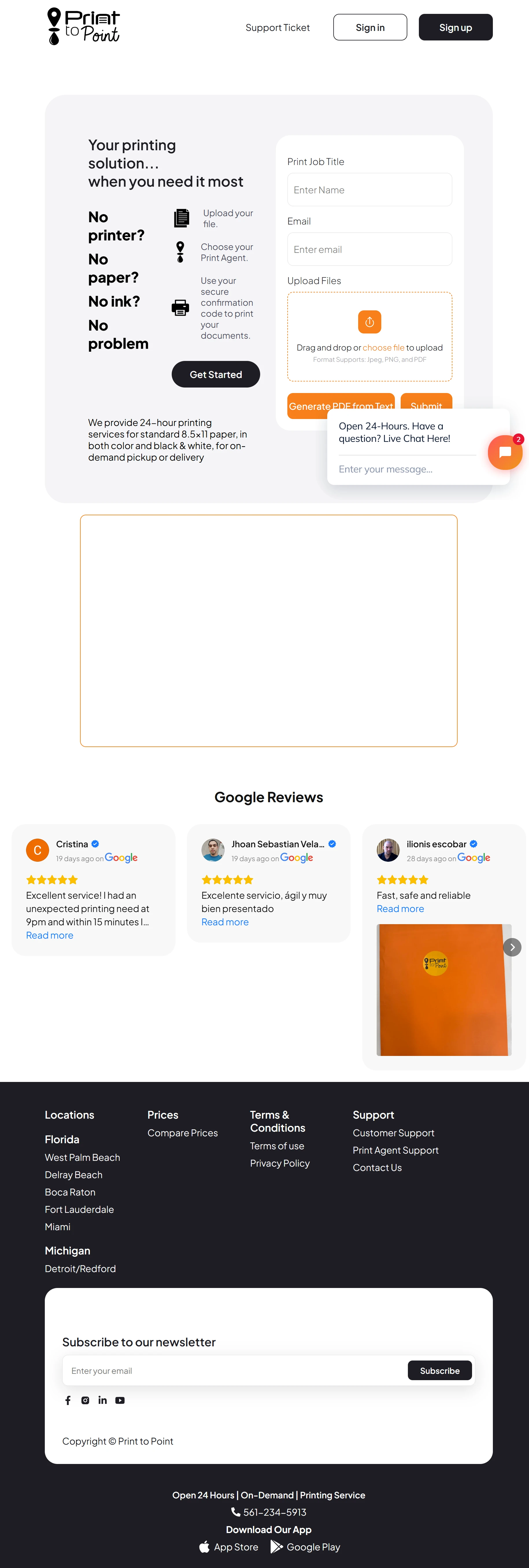 PrintToPoint is a two-sided digital printing platforms that connects customers with print agents. Customers can easily place, upload, and track print orders, while agents manage and fulfill these requests through a dedicated interface. The platform includes real-time chat for seamless communication, a kiosk mode for on-site service, and an admin dashboard for centralized monitoring and control.