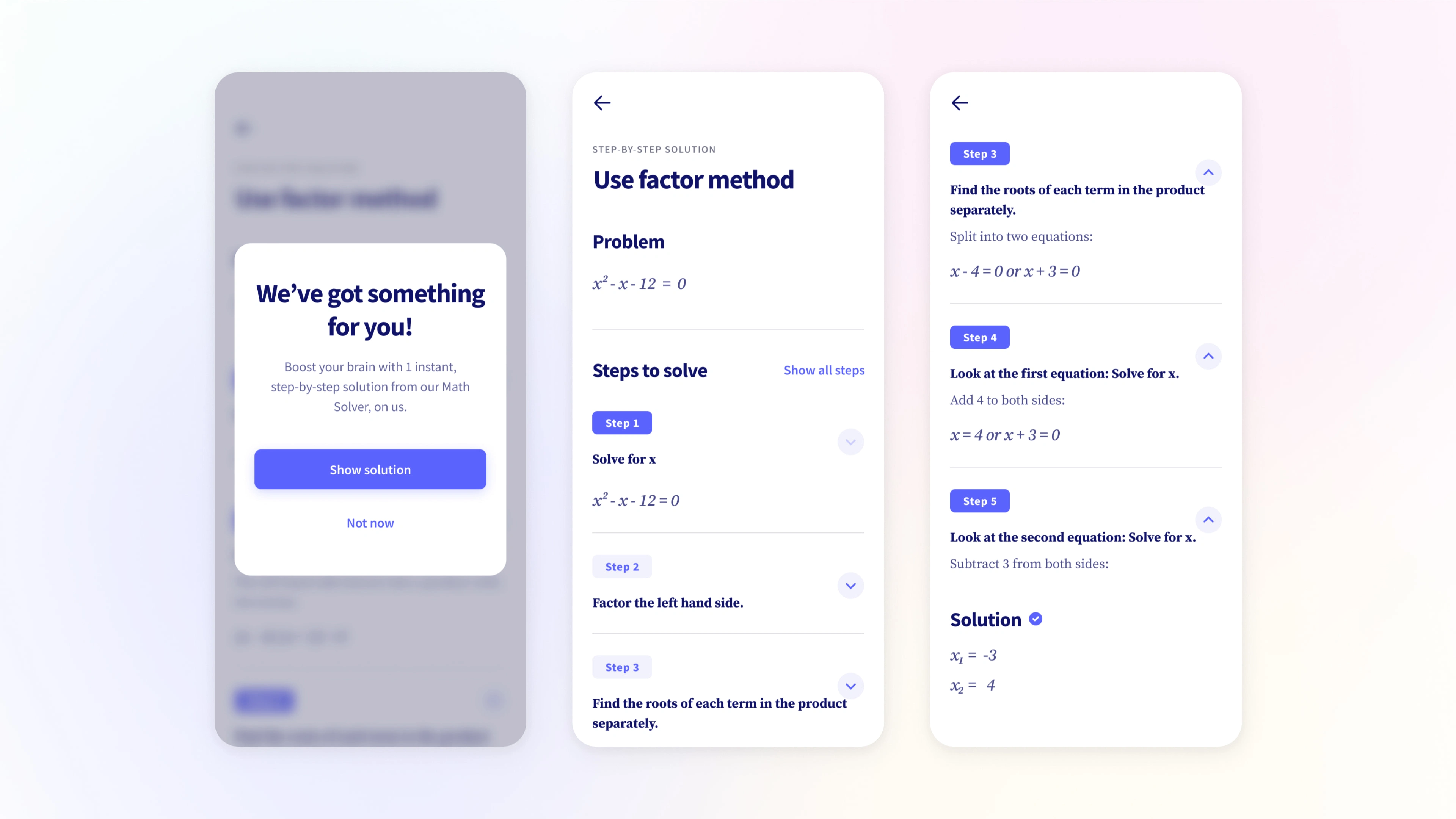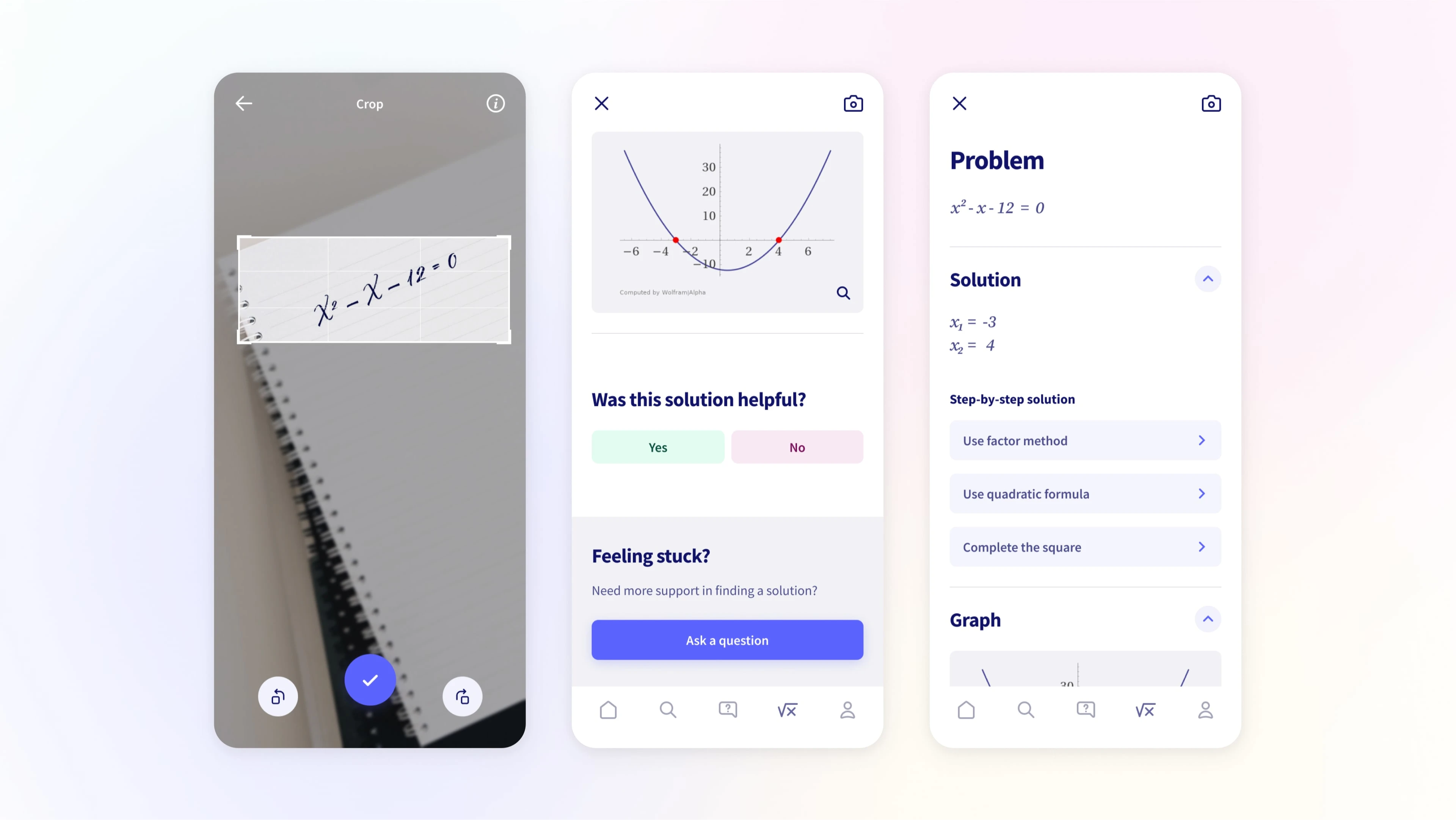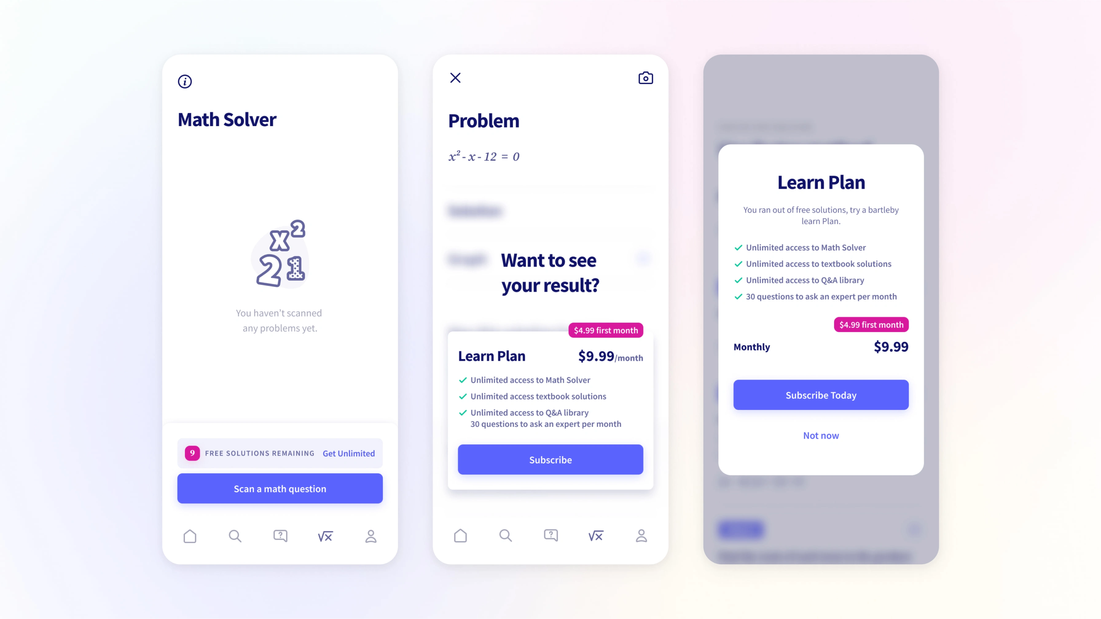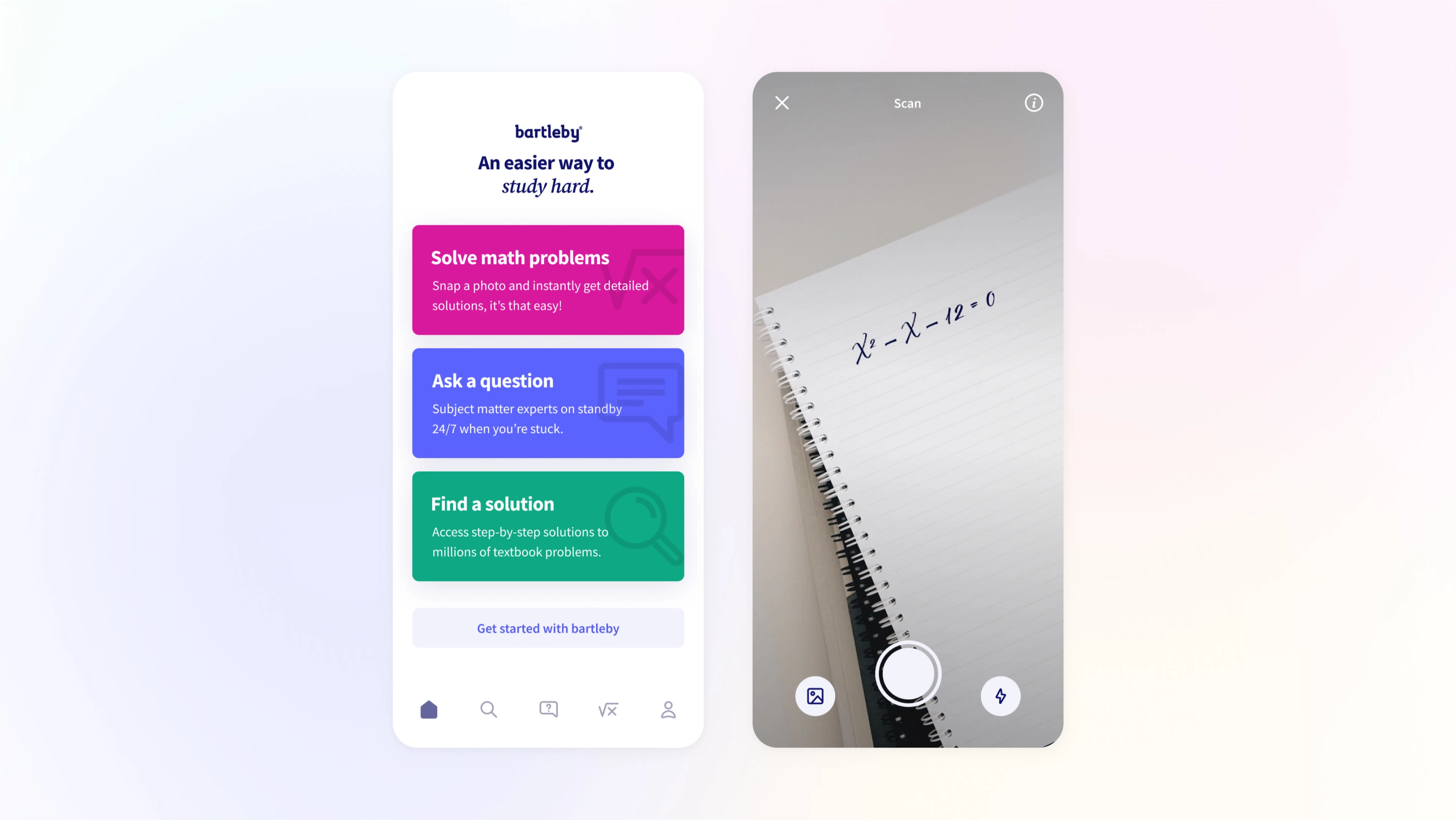 Bartleby connects students with expert help. I designed the extension to the app that solves math equations using a phone's camera and machine learning (ML) to get instant results.