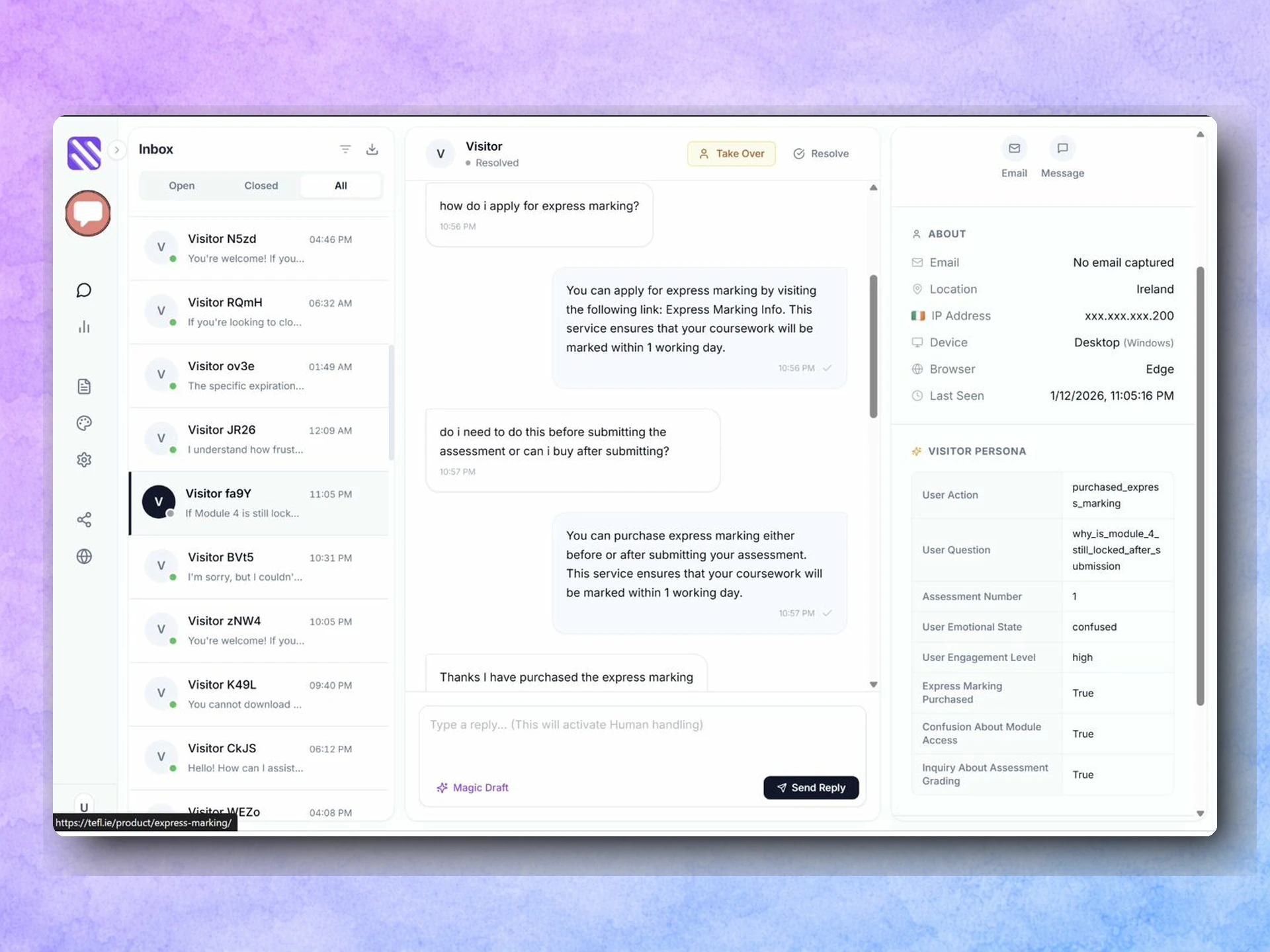 Human takeover for complex queries via live inbox
