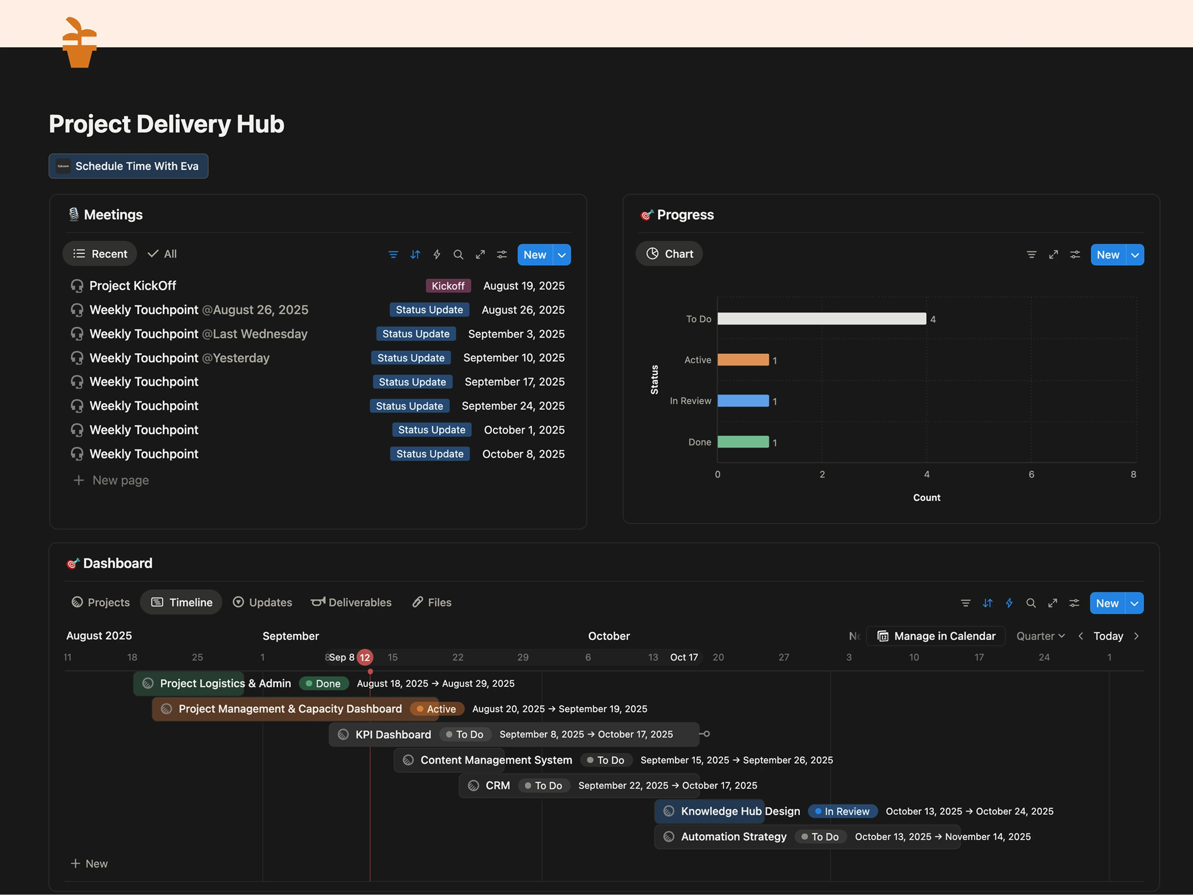 Custom Notion Operating System with modules for project management, CRM, knowledge, content, and reporting, and integrated AI automation.