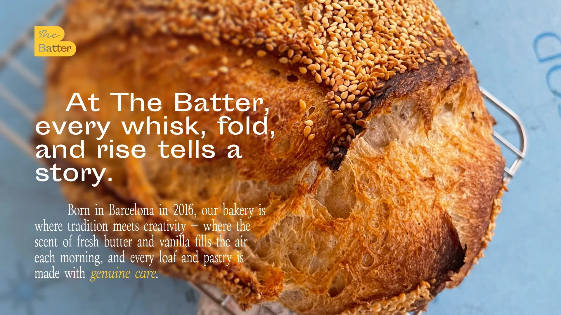 The Batter is a contemporary bakery born in Barcelona, inspired by the joy of simple, honest baking. The brand’s visual identity reflects warmth, craft, and a playful sense of modernity — capturing the beauty of everyday moments that begin with something freshly baked.