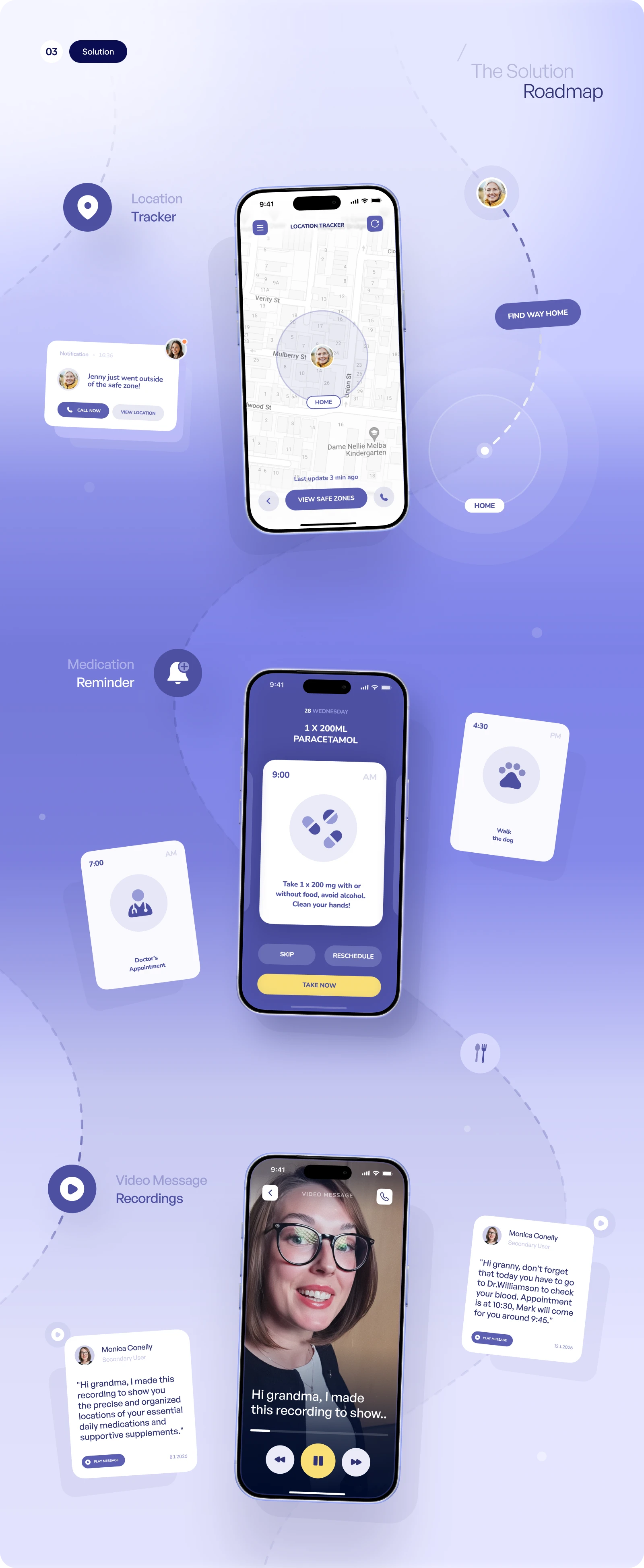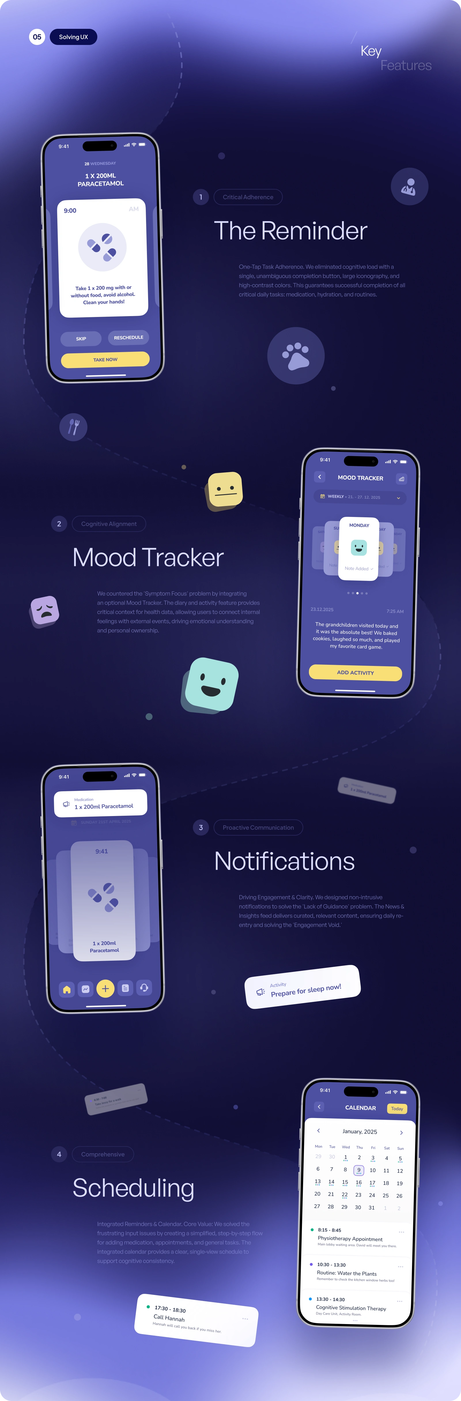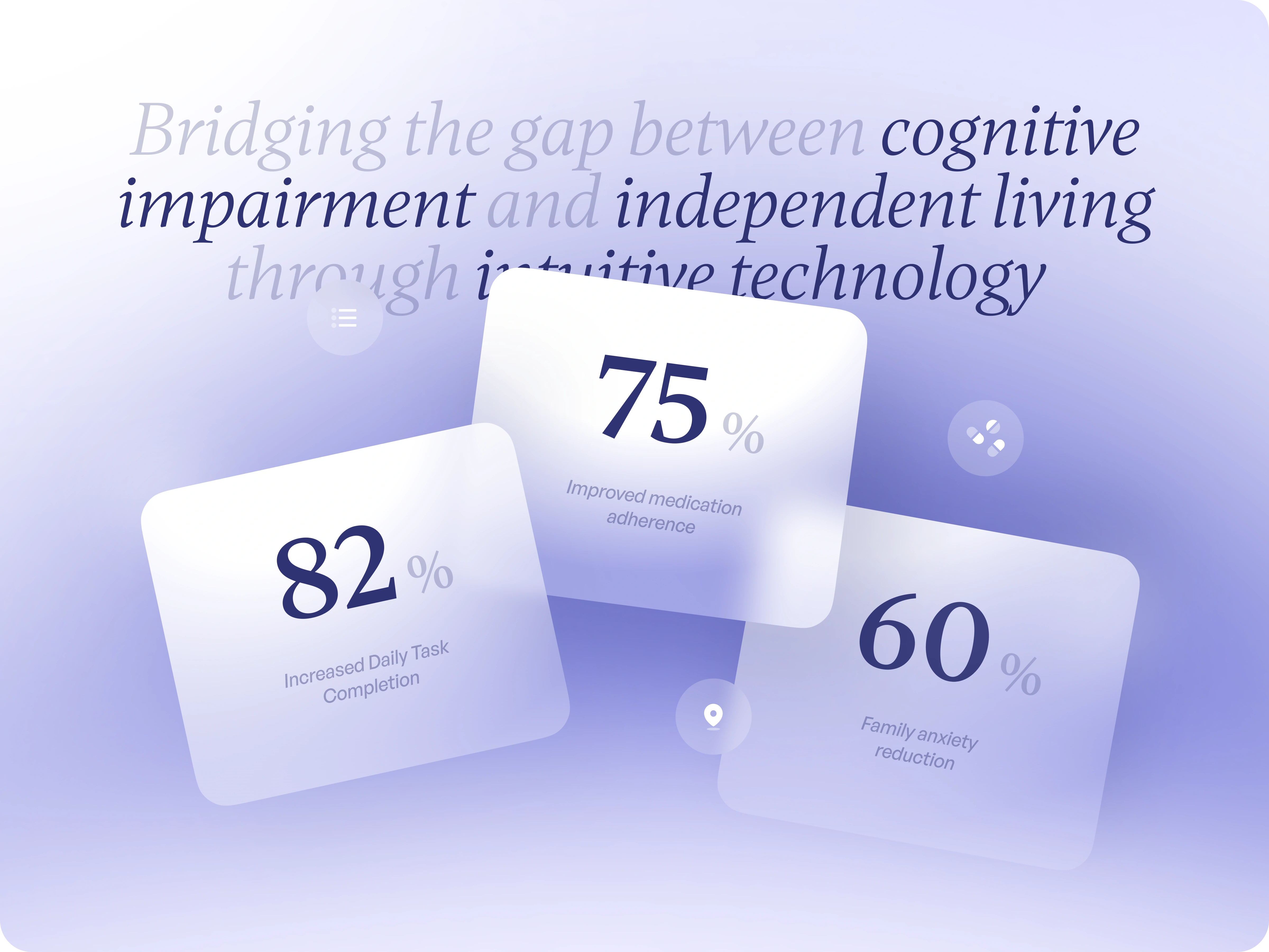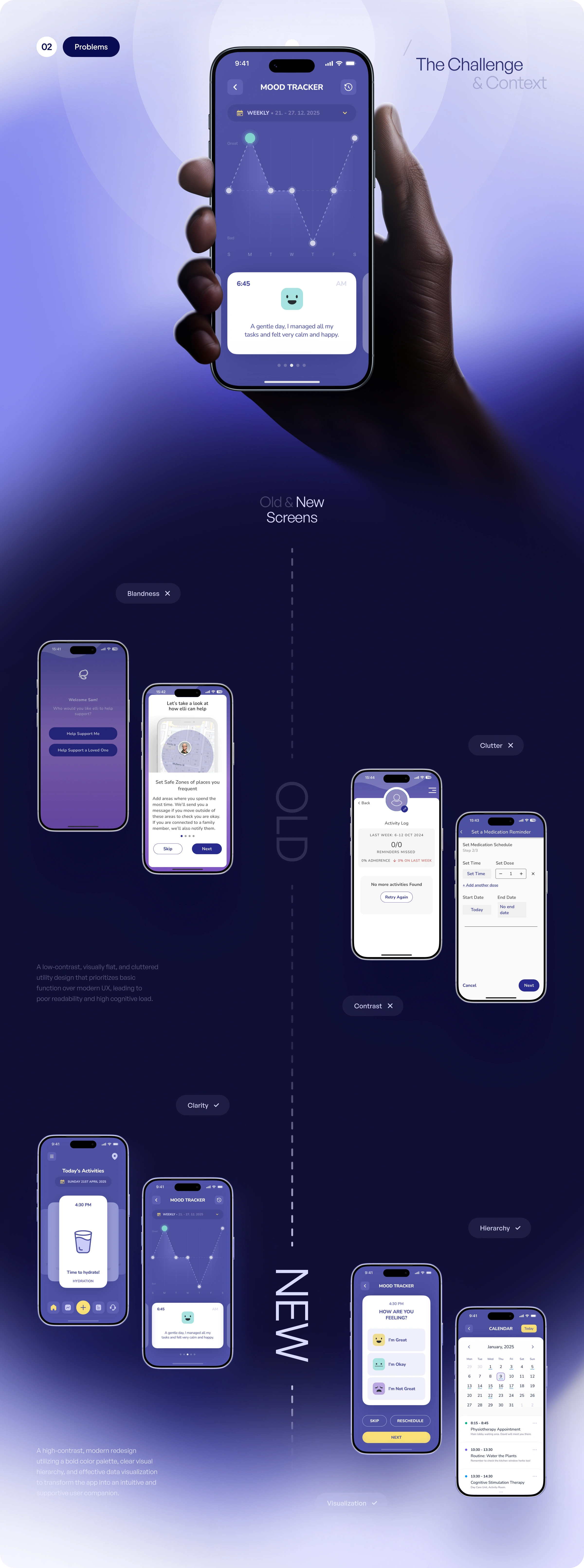 The existing experience carried high cognitive load, low contrast, and unclear hierarchy, making everyday tasks like medication, scheduling, and location tracking harder than necessary—while still needing to build trust with caregivers and families.