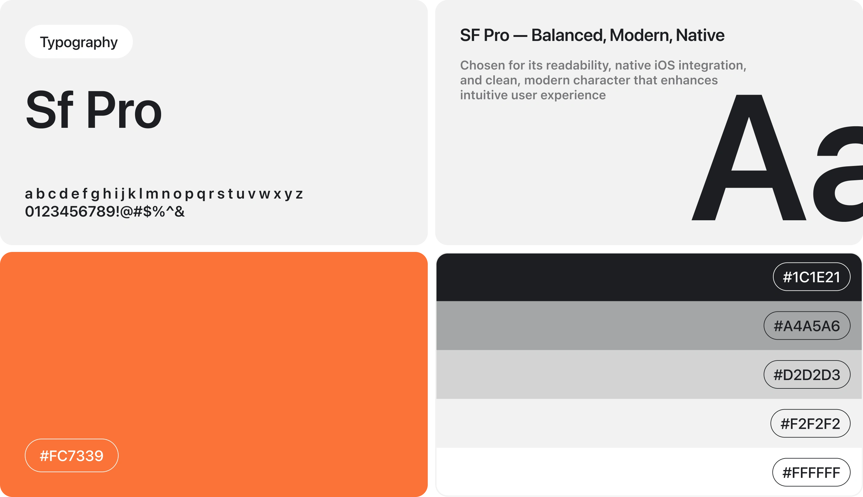 Chosen for its readability, native iOS integration, and clean, modern character that enhances intuitive user experience
