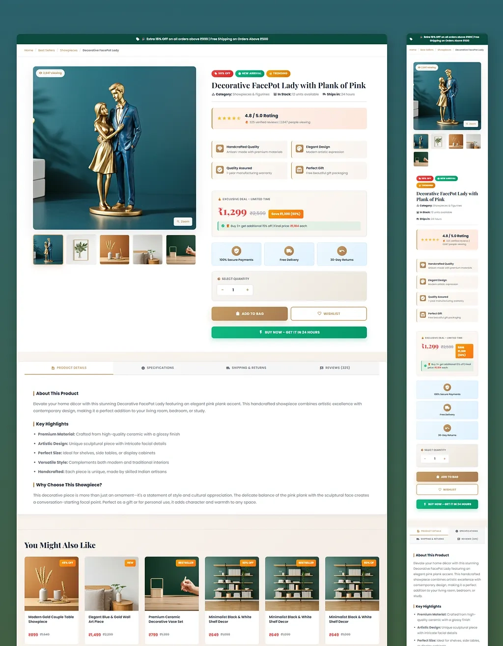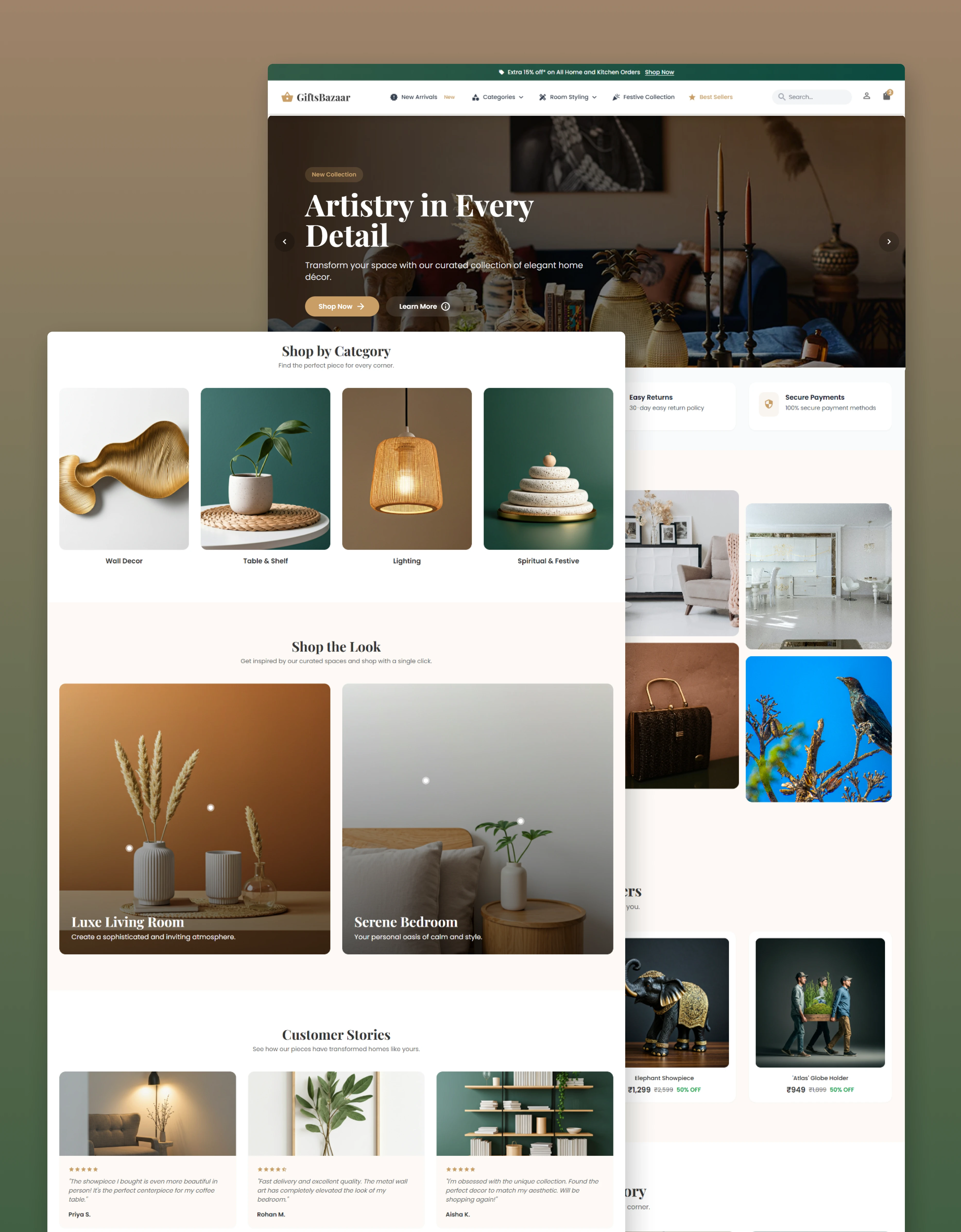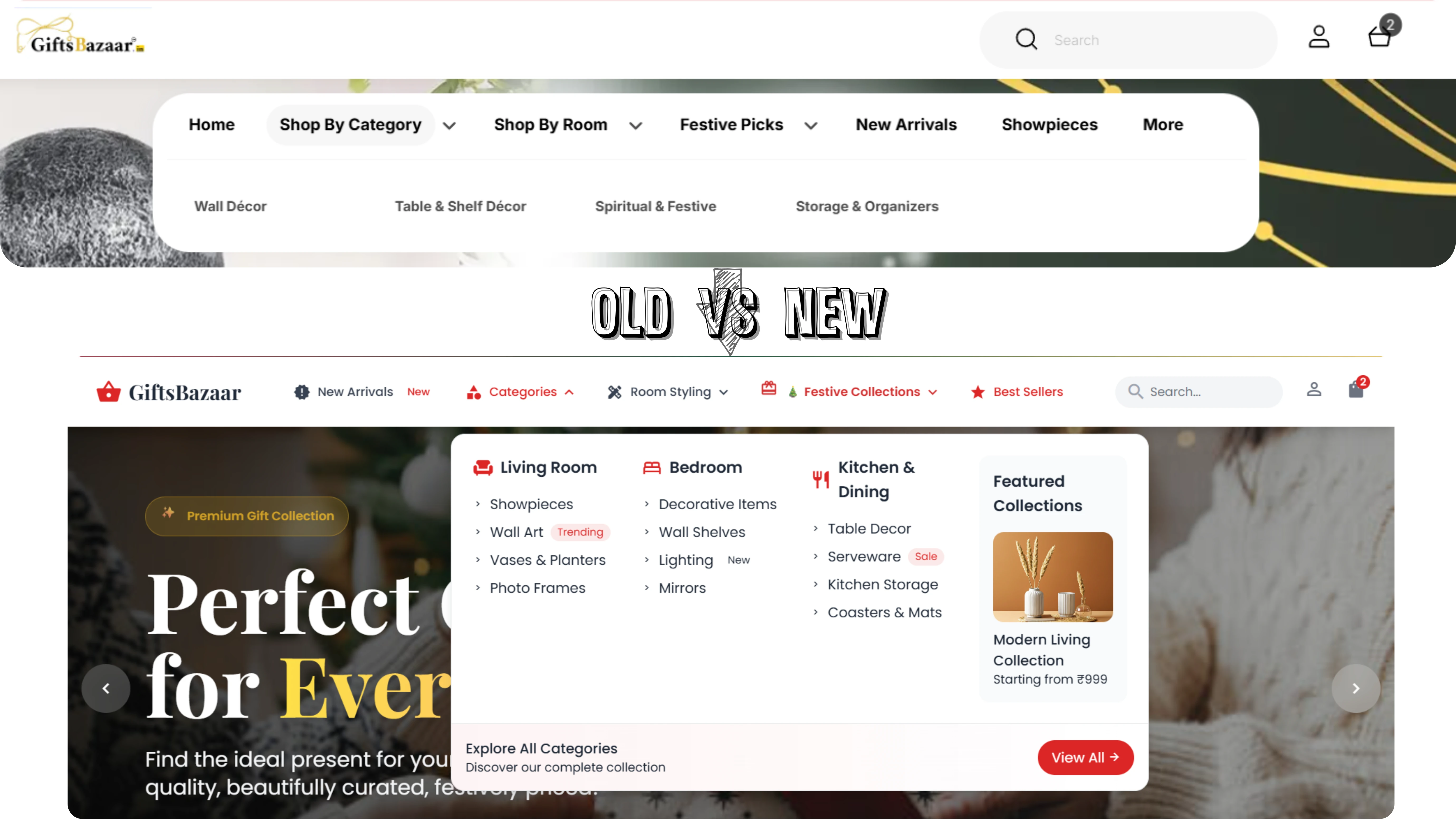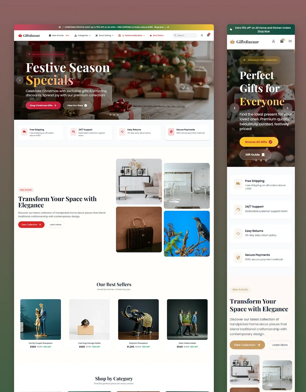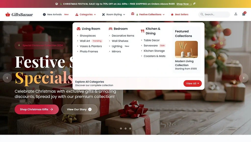 The Christmas-themed interface for GiftsBazaar was intentionally designed to leverage seasonal user psychology, where emotions, gifting intent, and urgency peak simultaneously. Rather than treating the festive theme as a surface-level visual change, the objective was to create a purpose-driven seasonal experience that enhances engagement, trust, and conversion without compromising usability.
