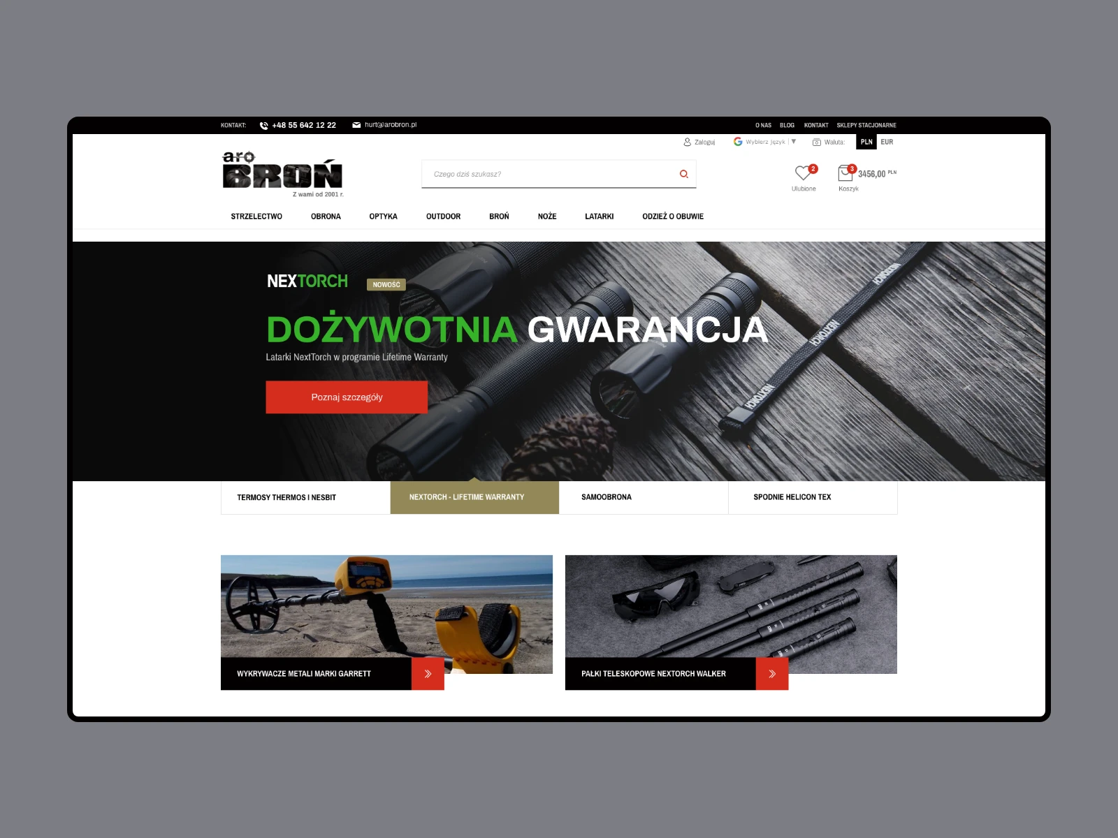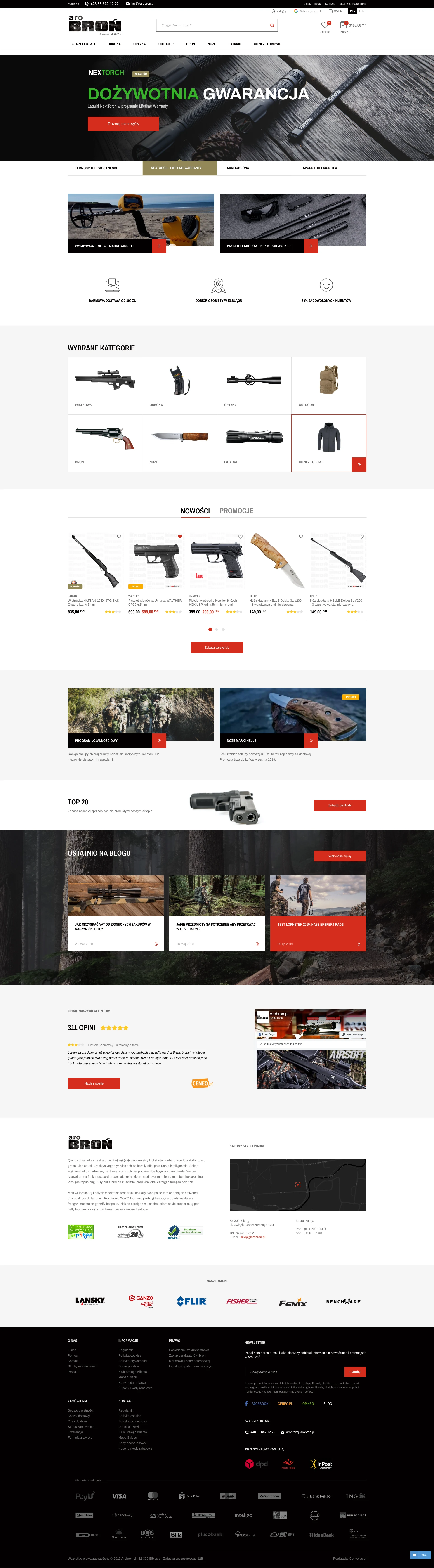UX/UI design for Arobroń, a Polish online store selling weapons and outdoor gear, implemented on the PrestaShop platform.