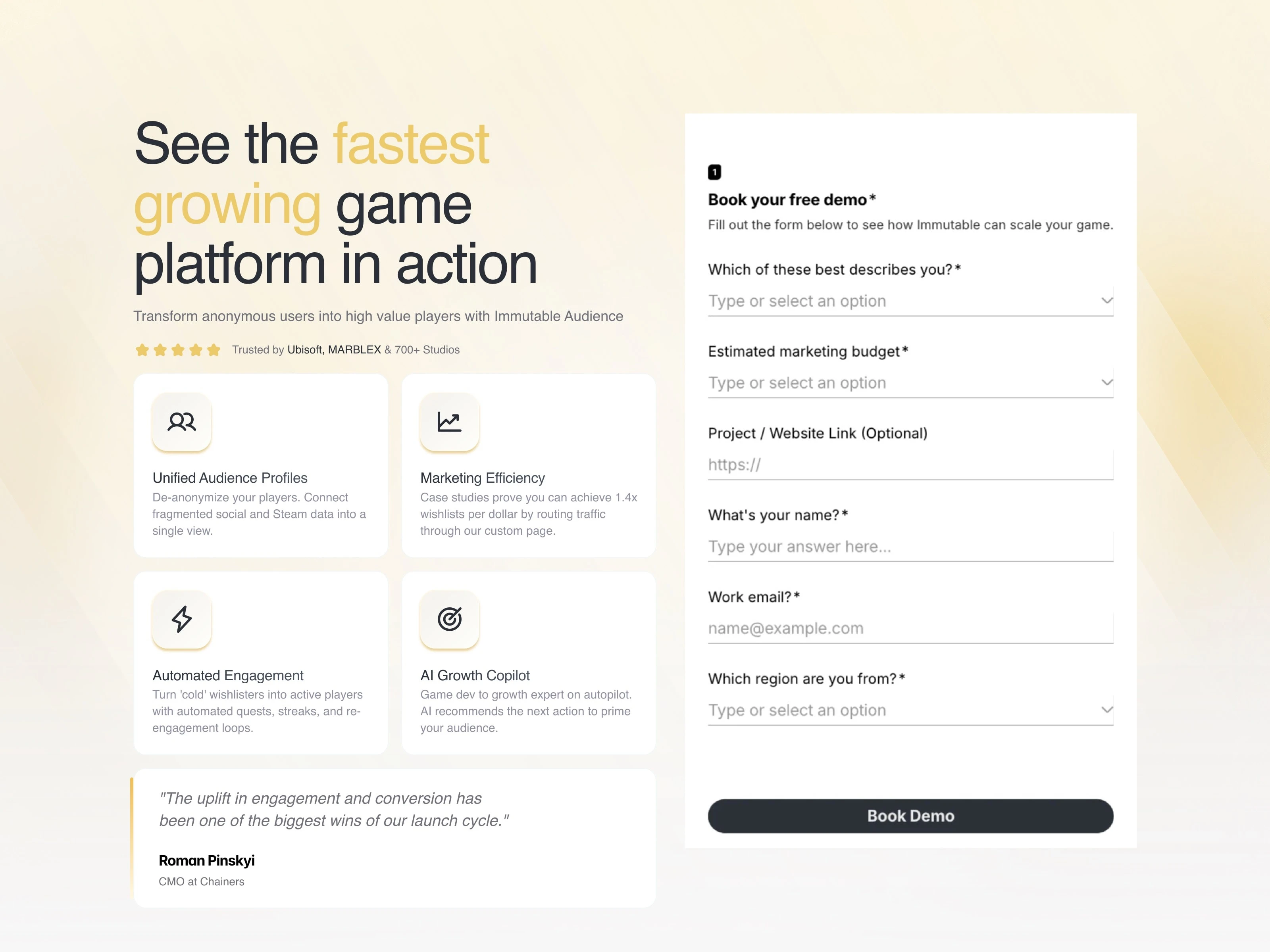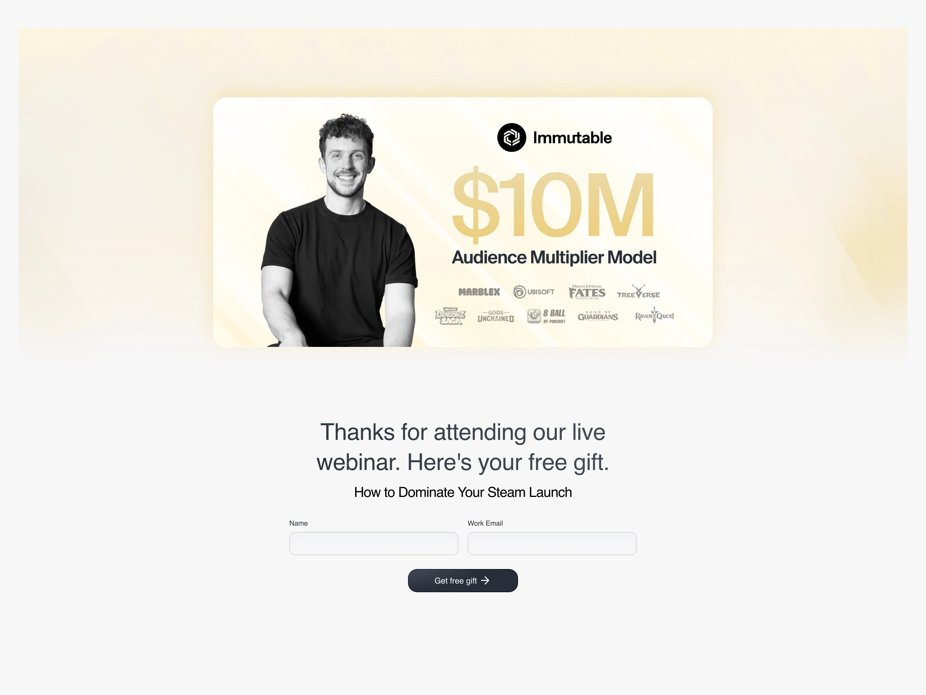 The Challenge This page needed to serve as the primary conversion point for the entire Immutable website. Every CTA across the site funneled to this page, making it critical for revenue generation. The page had to: