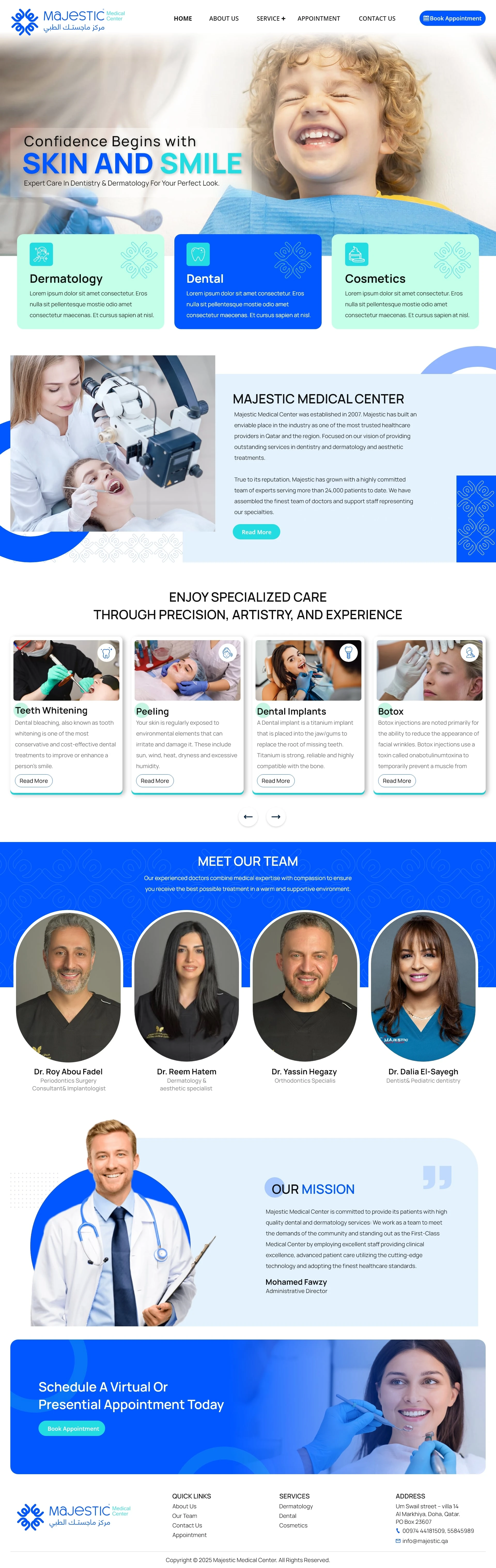 A multi-specialty medical center offering dental and skin care services wanted to revamp its online presence to look modern, trustworthy, and user-friendly. The goal was to create a clean, professional, and conversion-focused landing experience that highlights their treatments, doctors, and easy appointment booking system.