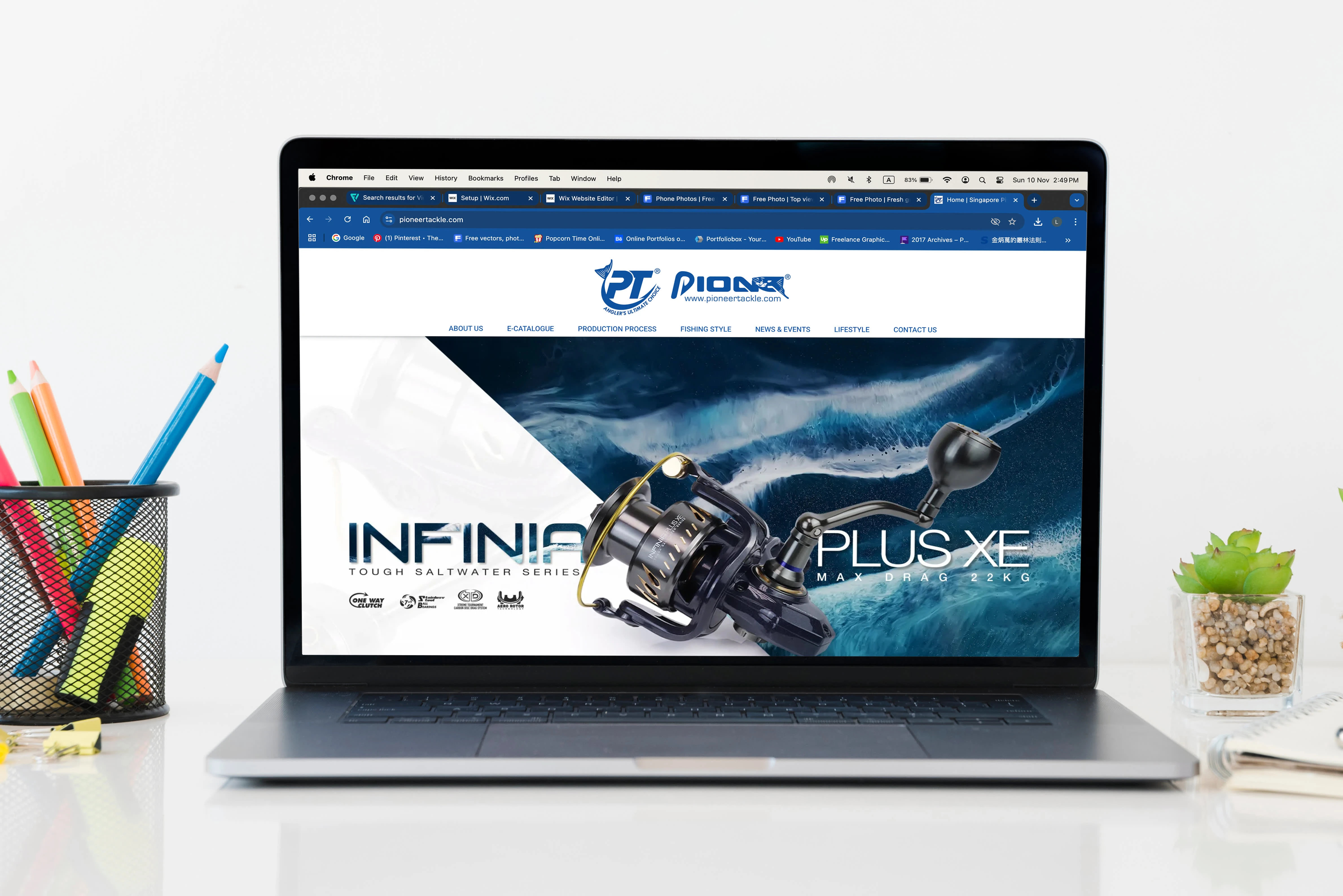 The designed to engage both professional anglers and fishing enthusiasts, blending product showcase with lifestyle branding in a modern and user-friendly layout