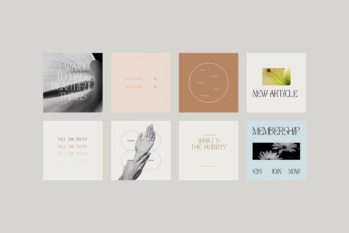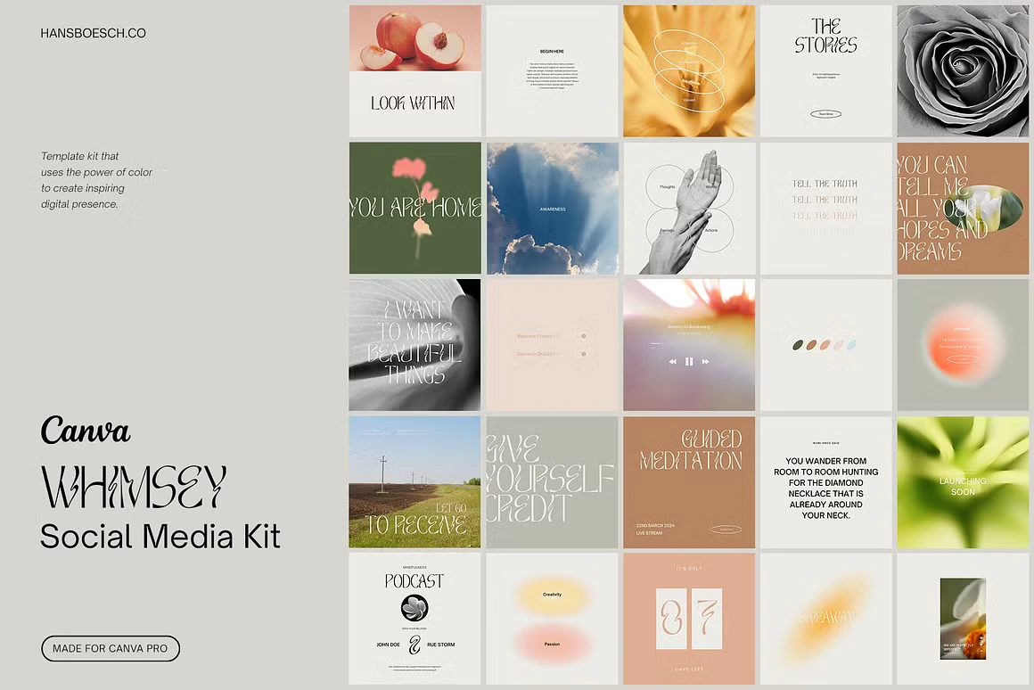 Whimsey is a Canva Pro social media kit built around bold color and whimsical typography to help brands create an inspiring, distinctive digital presence. The kit includes 36 beautifully crafted templates designed for creators in the wellness, spiritual, mental health, and lifestyle space, covering posts, stories, and more. Fonts, illustrations, and photos are all included, making it fully ready to use out of the box.