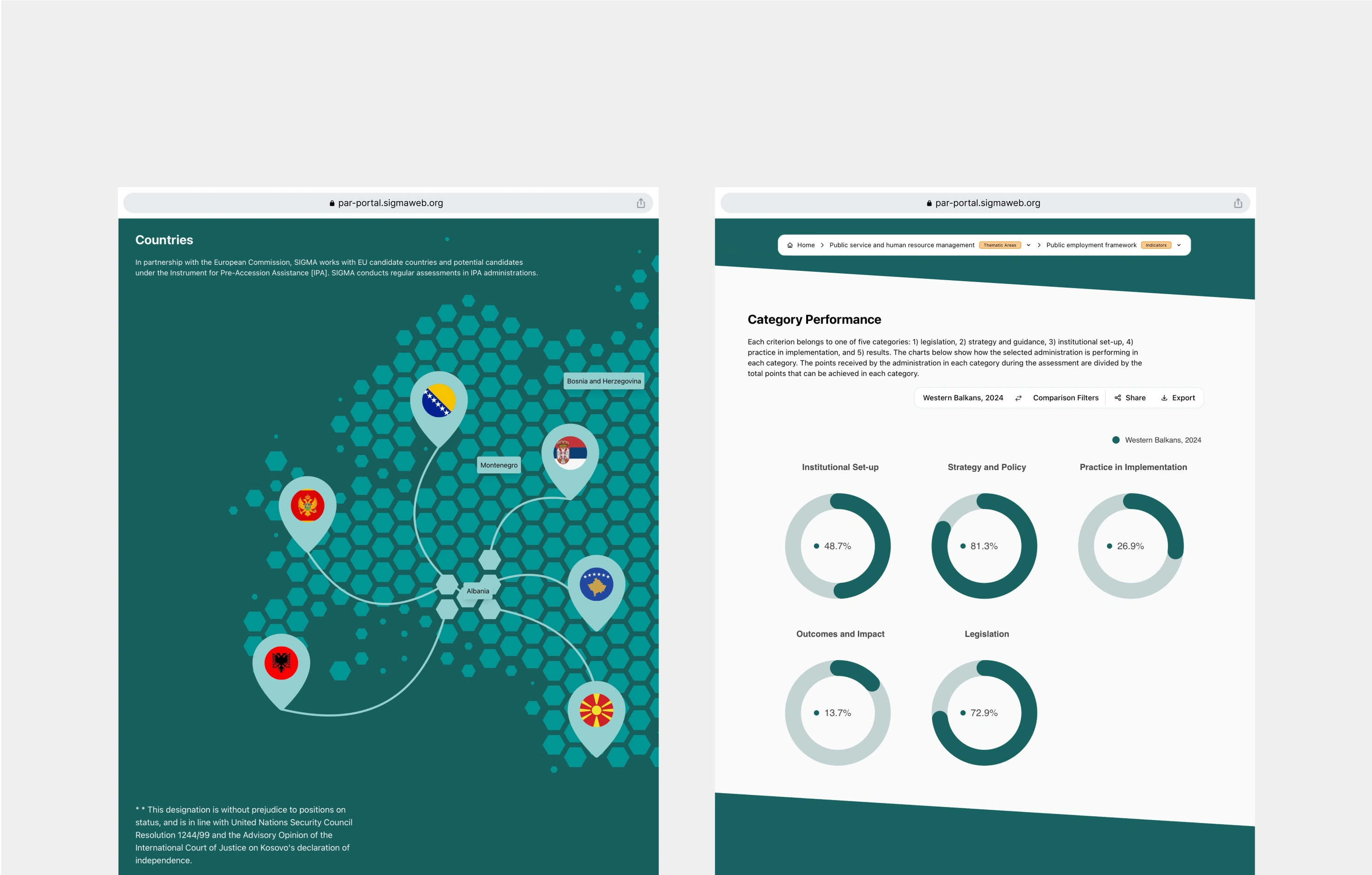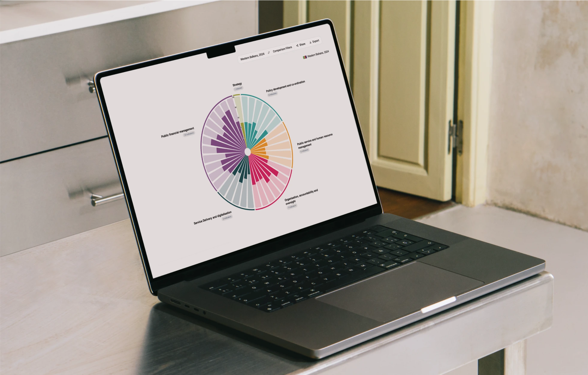 A governance data platform used by OECD experts to evaluate countries on key indicators and test how potential policy reforms could affect their scores. At its centre is a single, interactive visualisation that reveals a deep framework of governance metrics. We designed it as a tool for exploration, comparison and advocacy — blending layered complexity with clarity, responsiveness and policy relevance.