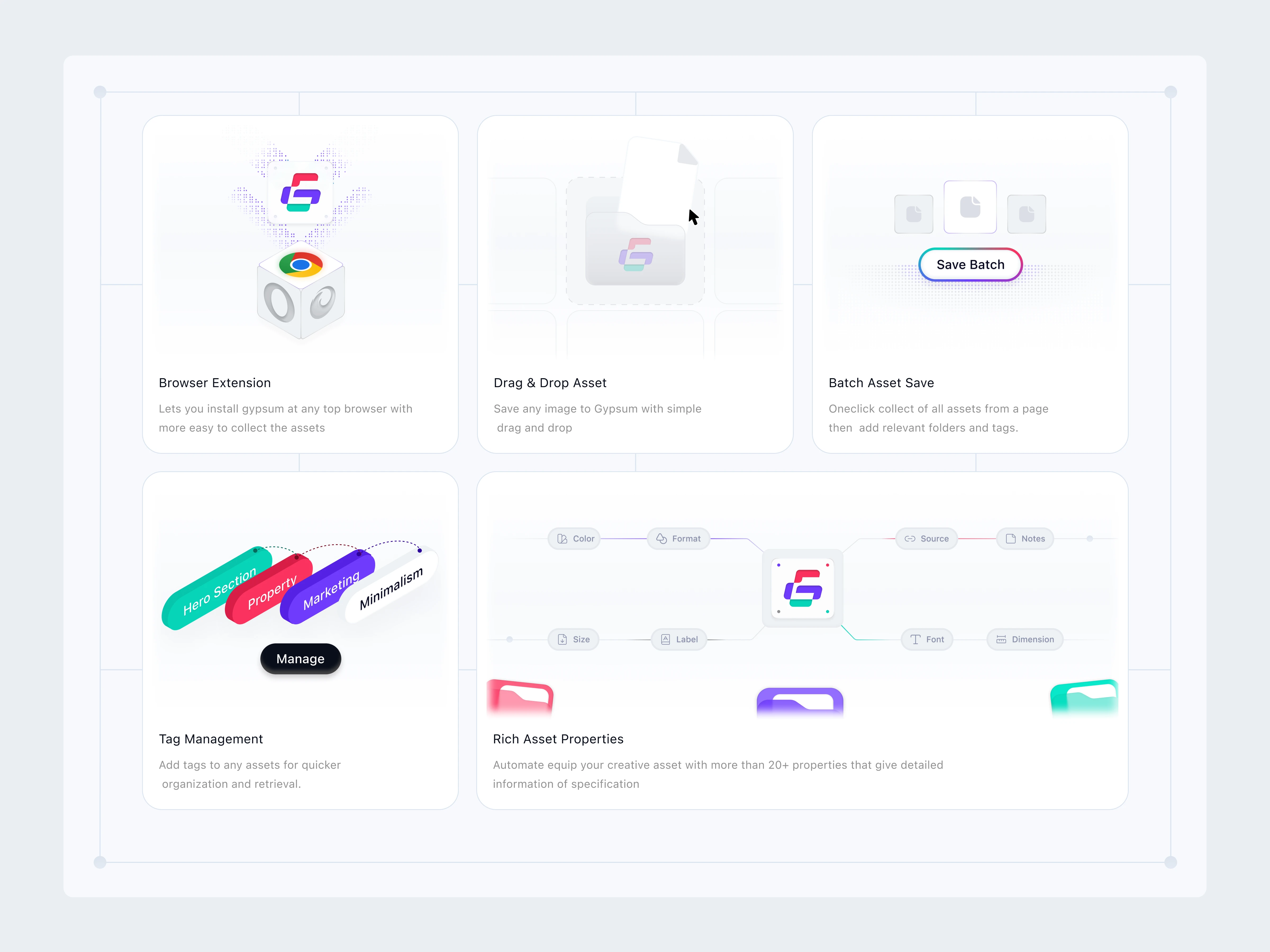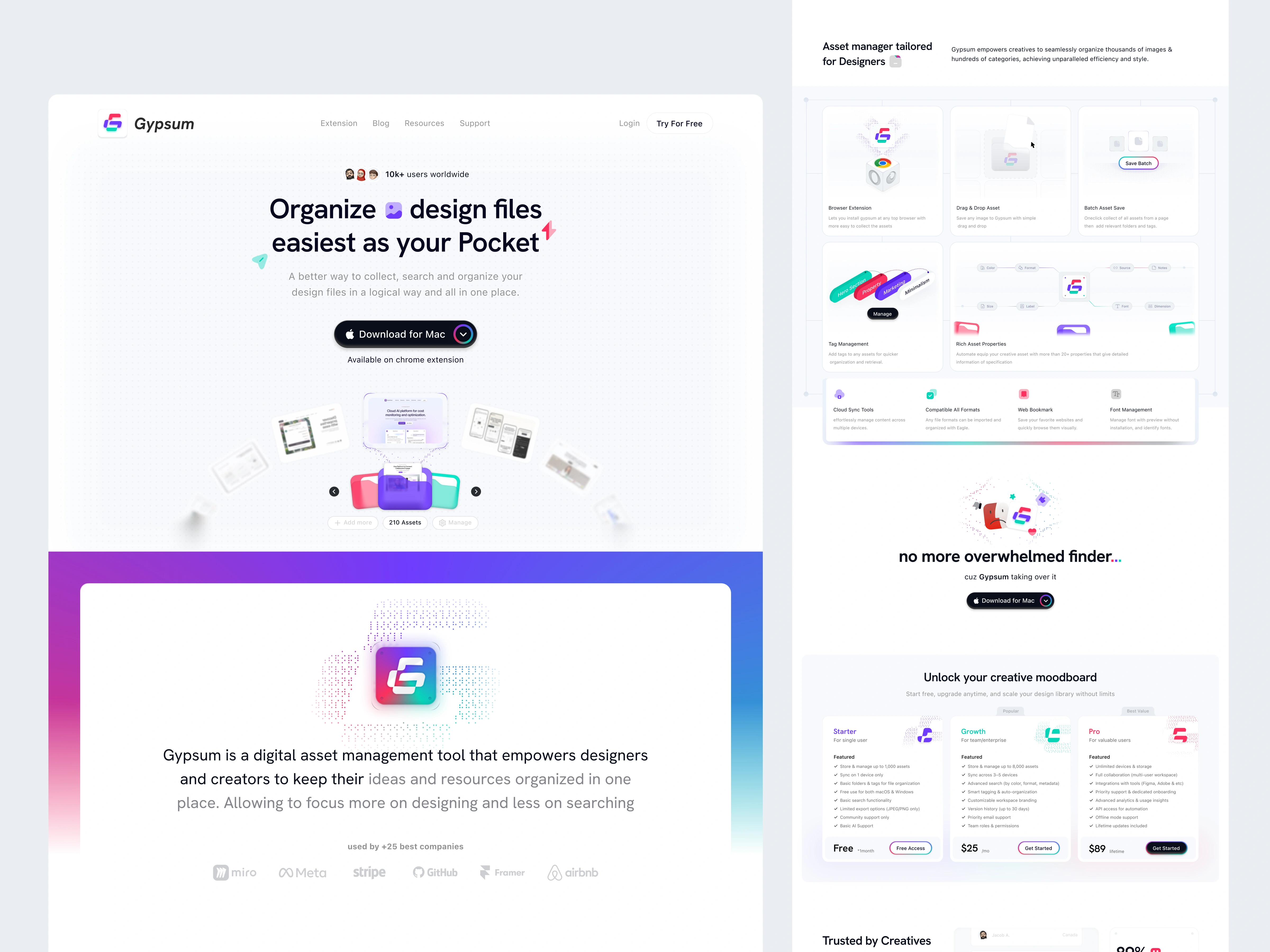 A seamless scroll journey follows, revealing use cases (asset management, drag & drop, sync features), trust signals (user testimonials, stats), and a visually persuasive pricing section that lowers the barrier for trial. The consistent use of rounded cards, soft shadows, and gradient tones creates a lightweight, delightful user experience reflecting both the product’s ease of use and creative intent.