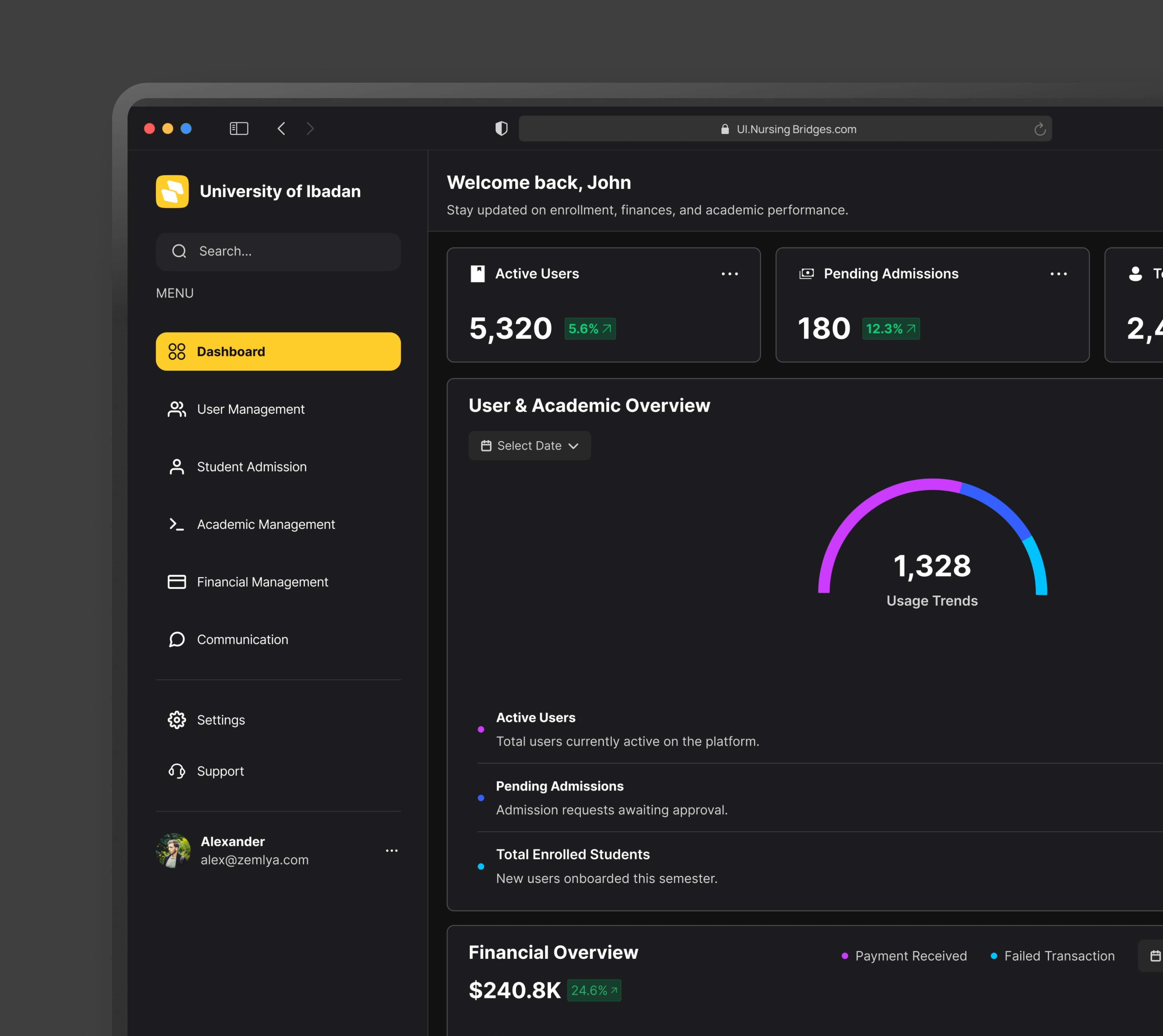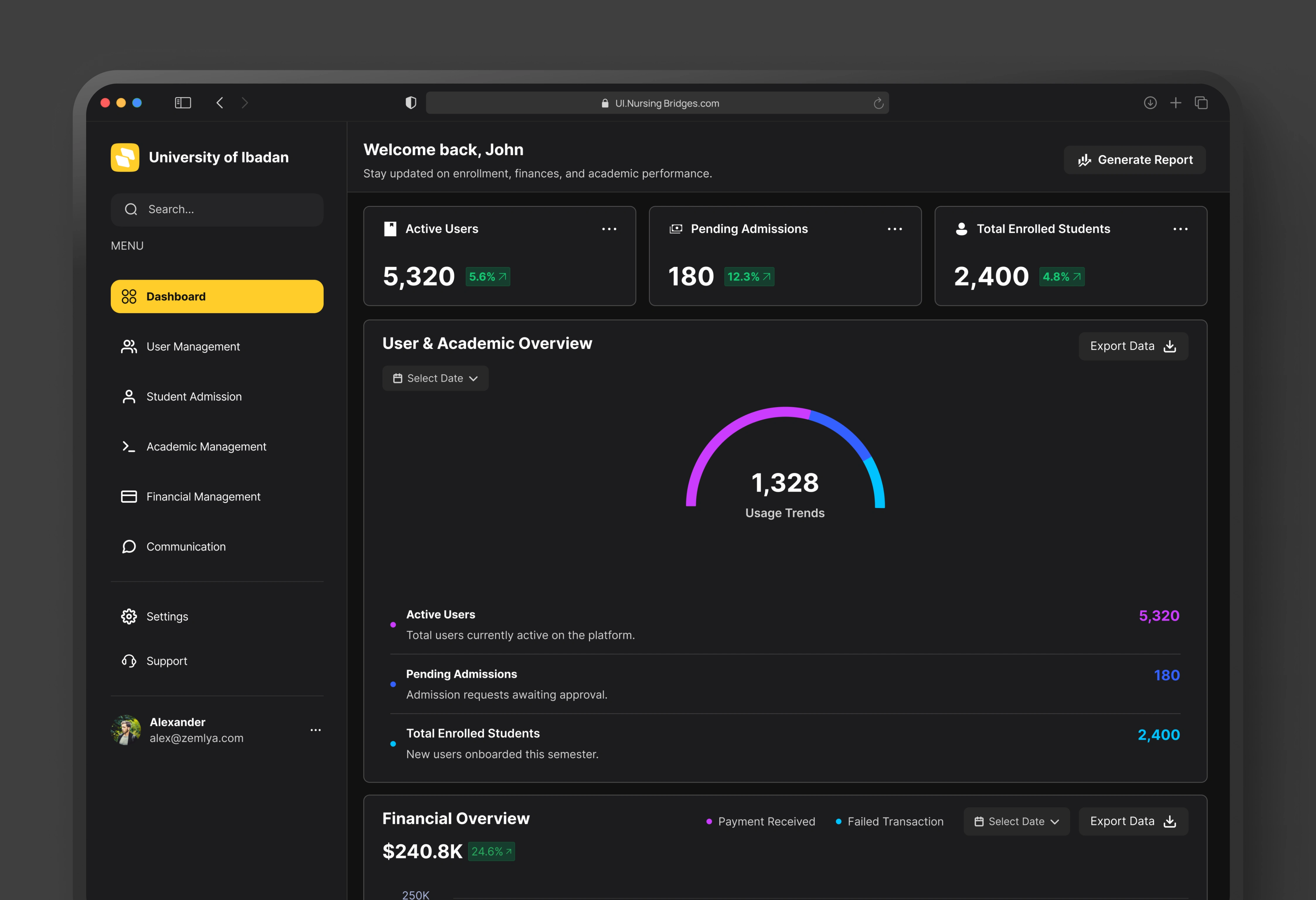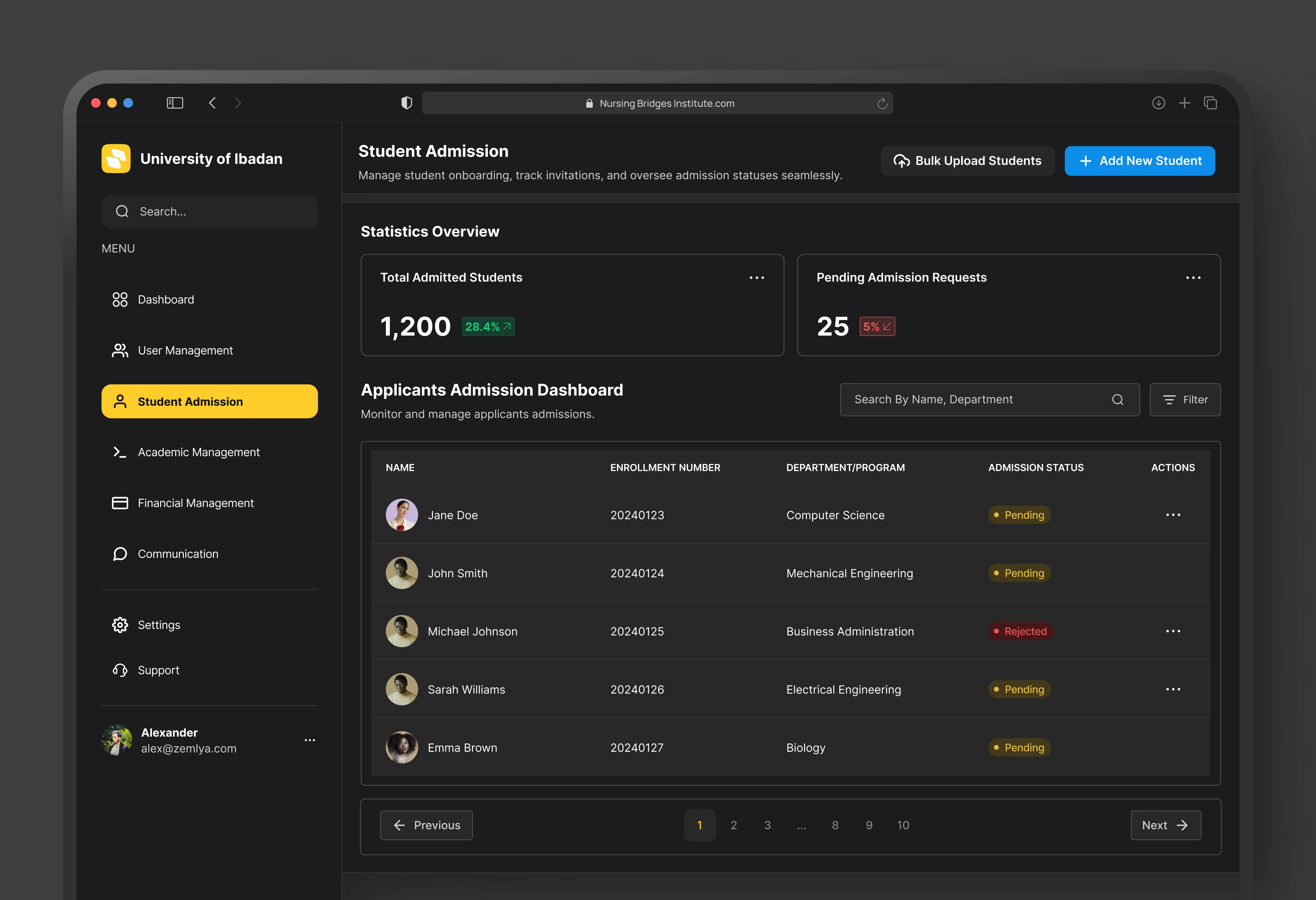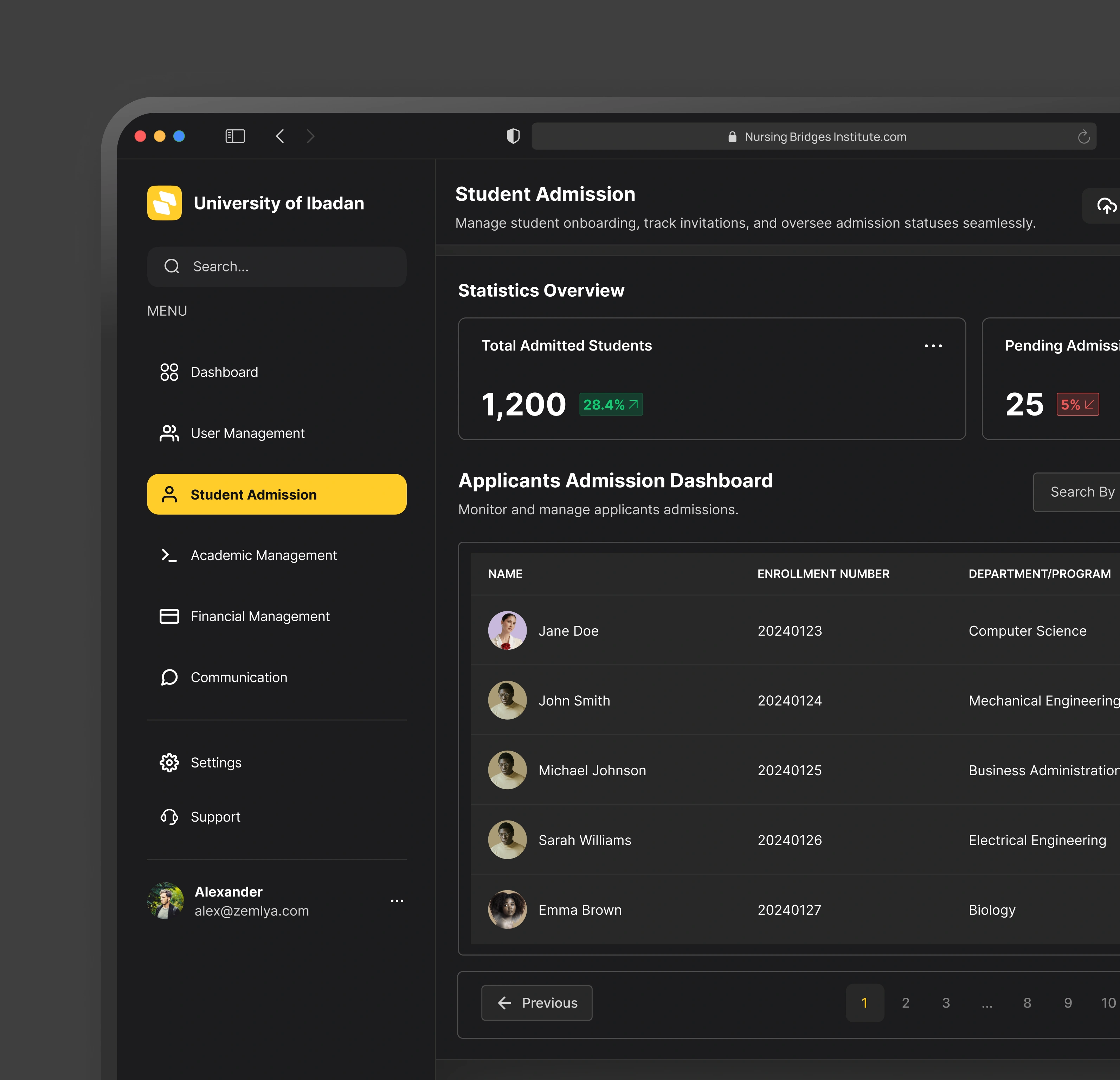 A seamless university tracker. 🔹 Dark Mode for focus 🔹 Real-time insights on users & admissions Fast, clear, and user-friendly. 🚀