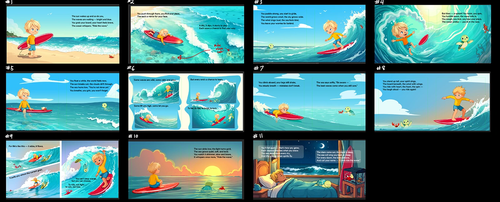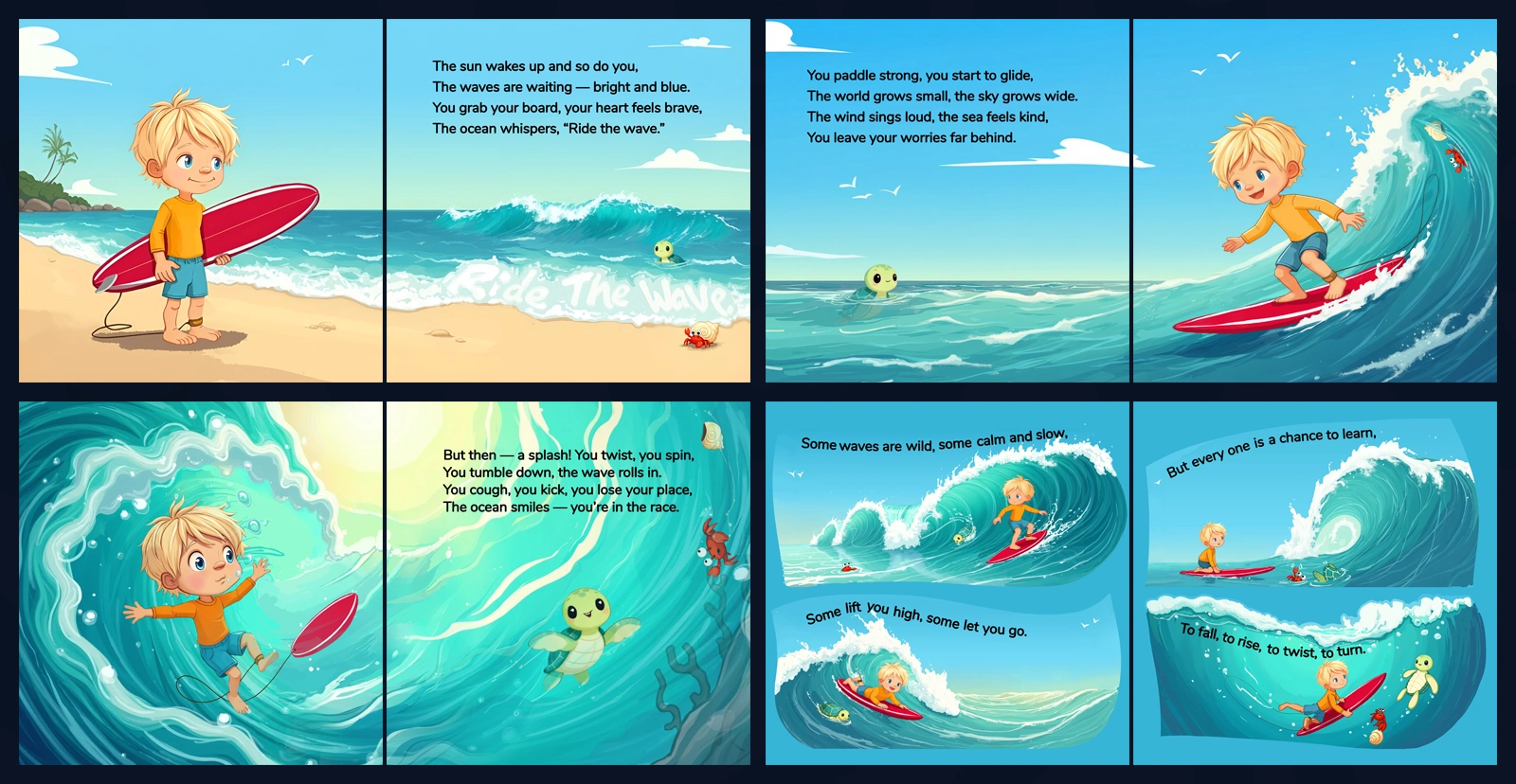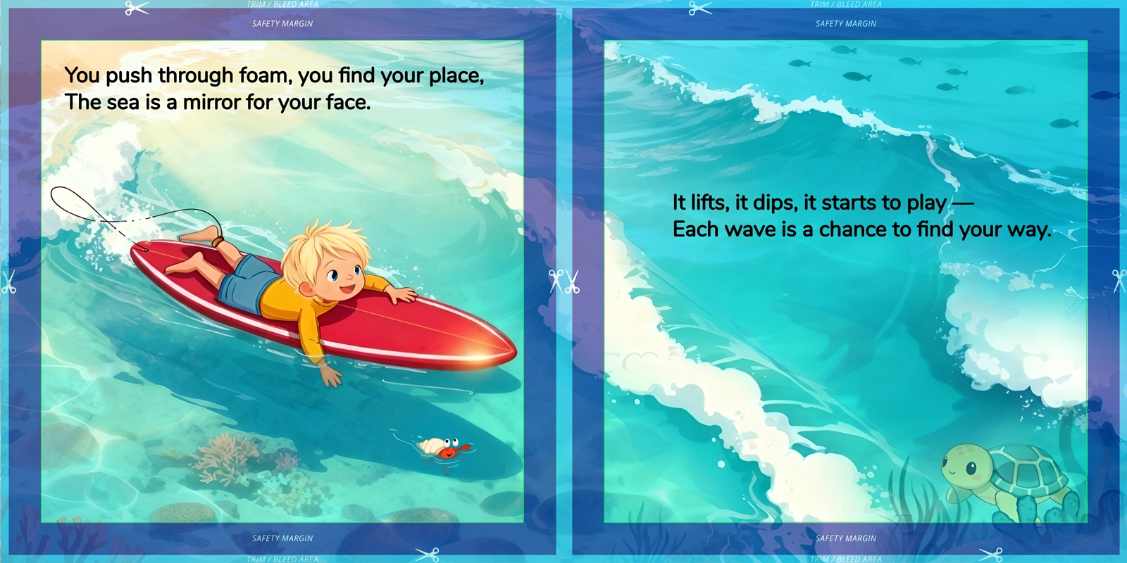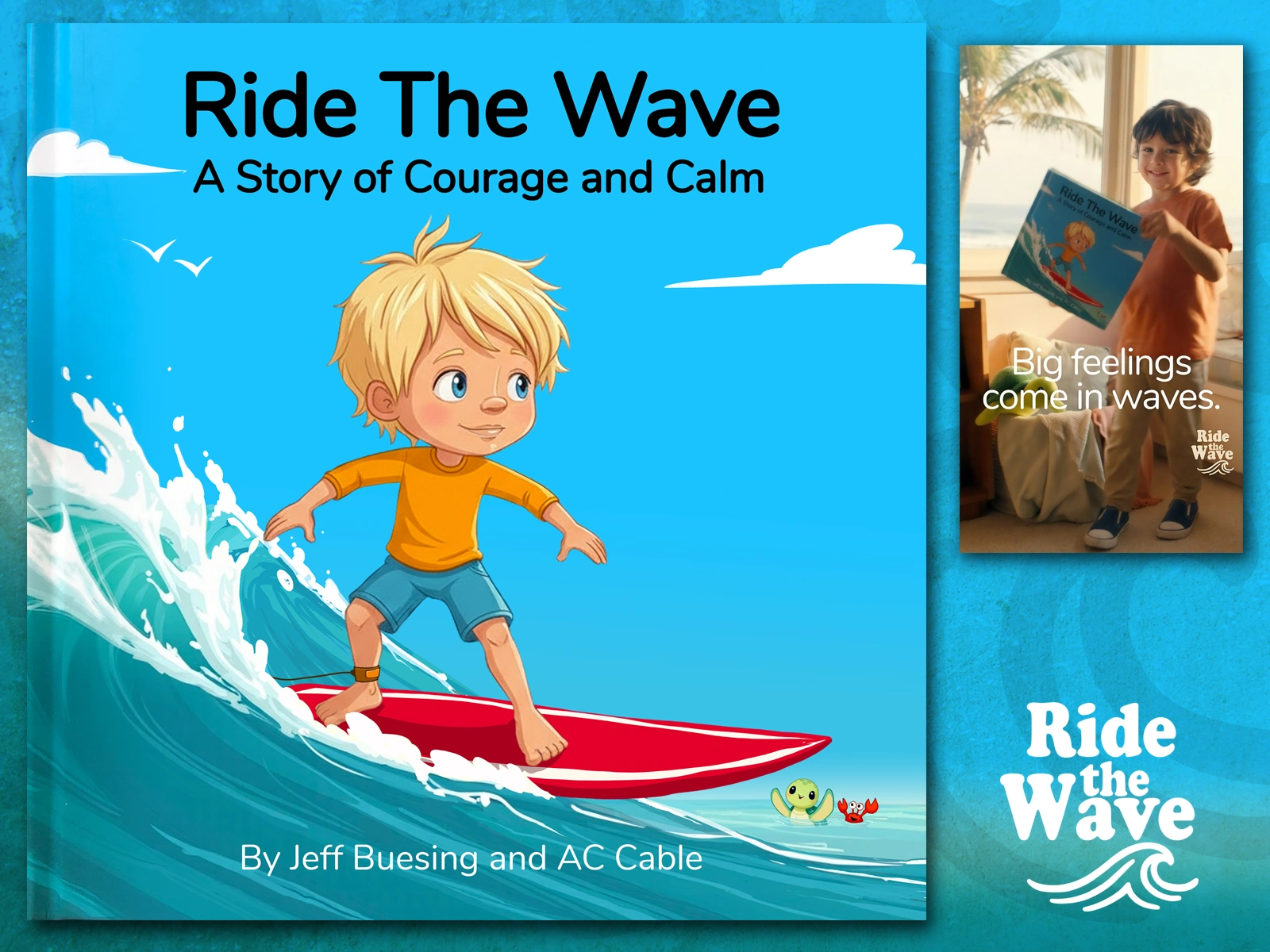 Ride the Wave became a fully realized children’s book with custom character design, cohesive illustration, print-ready layout, and supporting promotional creative.